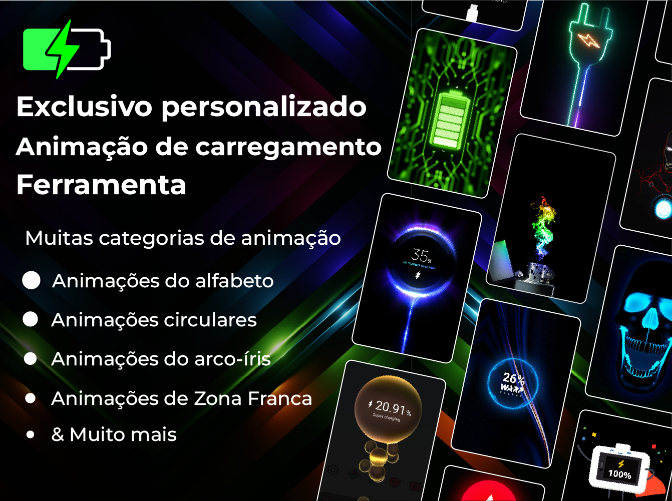 Animações de carregamento de bateria O aplicativo Animator de carregamento intermitente é outro aplicativo interessante no mercado lançado pela equipe da estação de aplicativos. Este fantástico aplicativo de animação de bateria tem temas de jogo de carregamento exclusivos do que outros aplicativos de efeitos de carregamento. Este aplicativo de animação intermitente permite que você se destaque de seus amigos usando animações de carregamento coloridas e legais na tela do telefone quando você conecta o telefone para carregar. Ele mostra animação quando você o habilita nas configurações. O aplicativo animador de bateria carregada mostra diferentes animações coloridas na tela do telefone quando você conecta o carregador. Aplicativo de animação de carregamento ultrarrápido O aplicativo de animação de carregamento de bateria ultrarrápida mostra diferentes animadores na tela do telefone quando você conecta o carregador. O conjunto de animações de jogo neste aplicativo são alfabetos, arco-íris, circular, legal, zona livre e animações populares. O estilo de atualização e os efeitos de reprodução do carregador simples também estão disponíveis neste aplicativo de reprodução de carregador ultrarrápido. Além disso, você também pode adicionar um conjunto personalizado de animações por conta própria. Animador de carregamento de bateria Este aplicativo de animação de carregamento de celular móvel possui temas exclusivos de animação de carregamento móvel para fornecer as animações impressionantes mostradas na tela de bloqueio e é mais fácil verificar a porcentagem de carregamento móvel na tela inicial. O aplicativo animador de carregamento tem uma variedade de efeitos interessantes e impressionantes. O aplicativo de animação de carregamento gratuito tem uma variedade de temas de animação de carga disponíveis para a tela de bloqueio. Animações ao vivo do carregador de bateria Este aplicativo possui animações e efeitos de carregamento super legais compatíveis com todos os celulares e tablets Android. Agora você pode exibir seu telefone com a ajuda de efeitos de reprodução de carga. Nosso aplicativo animador de carregamento móvel tem uma enorme variedade de animações ao vivo que você pode escolher. Animações de bateria ao vivo vêm em cores neon brilhantes, dando à tela do seu telefone uma aparência cativante. Durante a reprodução de carga, sua tela de bloqueio mostra informações de carregamento da bateria junto com animações exclusivas. Animador de Tema de Carga O aplicativo animador de tema de carregamento móvel seleciona sua escolha de temas e surpreende seus amigos e familiares com esses incríveis temas personalizados quando seu telefone está carregando. Os temas Cool Flashing aparecerão no seu telefone quando estiver no bloqueio e no carregamento do plug-in. Principais recursos” Flashing Battery Animator” 1) Este aplicativo de animação de carregamento móvel está fornecendo animações de bateria ao vivo. 2) Ferramenta de animação de carregamento de bateria tudo-em-um com um conjunto exclusivo de animações. 3) Variedade de animação de carregamento da bateria em cores atraentes. 4) Informações detalhadas da bateria, saúde da célula, informações da célula e exibição de carga da bateria. 5) Animador de carregamento intermitente e alfabetos, exibição de cores do arco-íris 6) Fácil de selecionar animações de carregamento e efeitos de reprodução de carregador. 7) Defina o Alarme com bateria cheia e escolha seu próprio toque quando o telefone estiver totalmente carregado ⏲ 8) Adicione animações personalizadas da sua galeria Animações legais de efeitos de néon Efeitos de bateria de efeito de néon legal gratuitos para carregar bits de ajuda e definir efeitos de animação e alarme quando a bateria está cheia. O aplicativo de efeitos de carregamento da bateria mostra diferentes animações na tela do telefone quando você conecta o carregador.