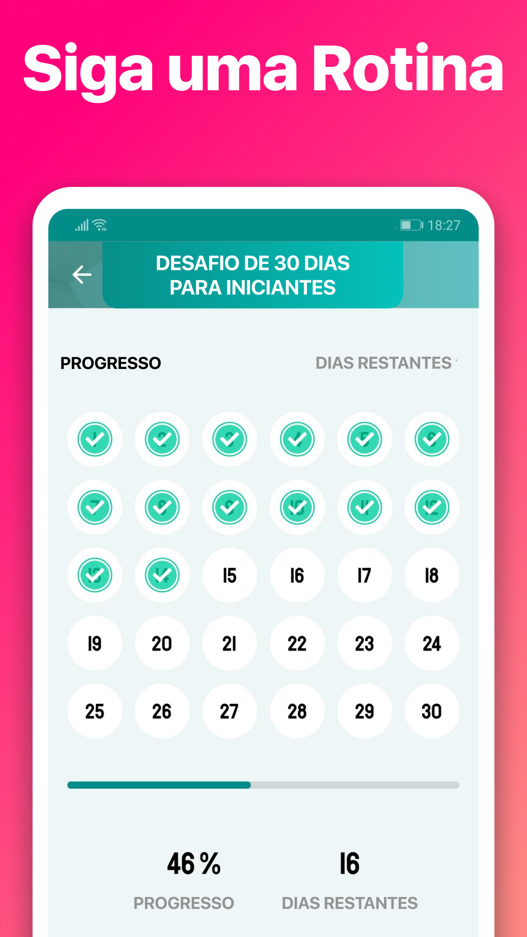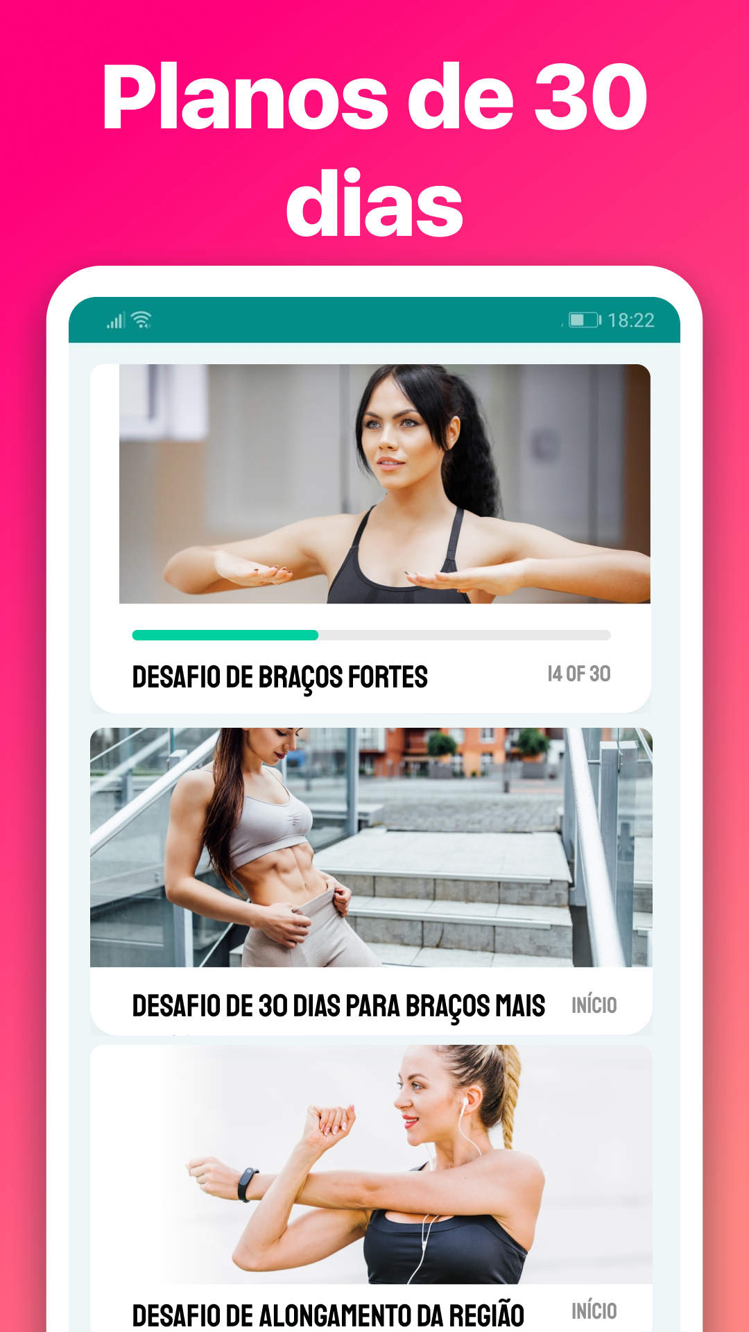 Desafios de 30 diasNossos desafios de 30 dias irão guiá-lo ao seu objetivo em 4 semanas e oferecer 3 níveis de dificuldade diferentes. Os treinos estão ficando um pouco mais difíceis a cada dia, então, ao final do desafio, você poderá iniciar um novo desafio com um nível de dificuldade mais alto.