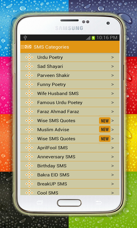 The best SMS app is here , Which is the best Urdu SMS app whole over the world. Our user can send SMS to whole over the social media like Facebook, whatsapp, pinterest, Instagram and many more.It is in the Top best Sms categories. The Best top ten SMS lists are here. "Urdu Poetry ", "Sad Shayari ", "Parveen Shakir", "Funny Poetry", "Wife Husband SMS", "Famous Urdu Poetry", "Faraz Ahmad Faraz", "April Fool SMS", "Anniversary SMS", "Birthday SMS", "Bakra EID SMS", "BreakUP SMS", "Cool SMS", "Good LUCK SMS", "Diwali SMS", "Dua SMS", "Exam SMS", "Funny SMS", "Good Morning SMS", "Good Night SMS", "Miss You SMS", "New Year SMS", "Ramzan SMS", "Sorry SMS", "Valentine DAY SMS", "Urdu Poetry SMS", "English Poetry", "Love SMS", "Islamic SMS", "Eid SMS", "Sardar SMS", "Pathan SMS", "Life SMS", "Jokes SMS", "AfterNoon SMS", "Friendship SMS", "Relational SMS" Easy to use easy to share every one....