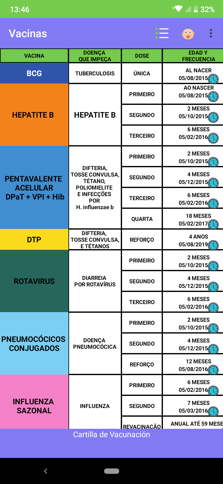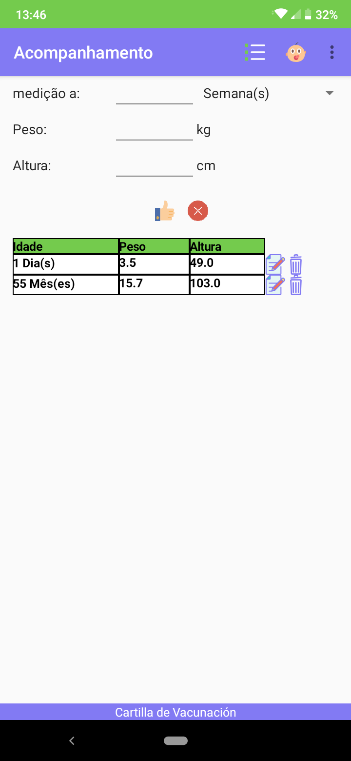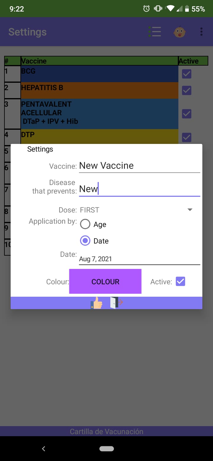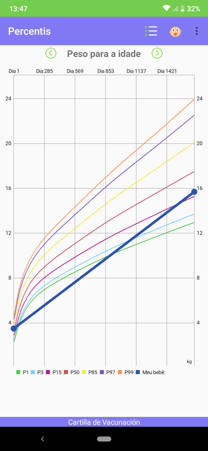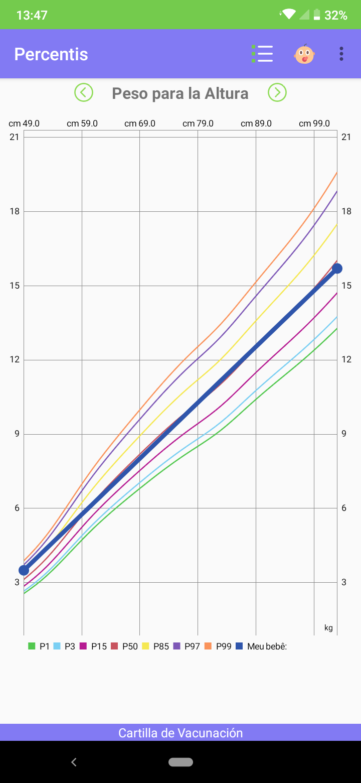 O registro de imunização inclui: * Registro de vacinas, configure o esquema de vacinação atual em seu país. * Configuração dos alarmes de vacinas a serem aplicadas. * Registro de informações gerais da criança, grupo sanguíneo, apgar e alergias. * Armazenamento de dados somatométricos de peso, altura e cálculo do índice de massa corporal. * Gráficos de percentis de peso para idade, altura para idade e peso para estatura, com dados da Organização Mundial da Saúde (OMS). * Registro nutricional da criança de acordo com as recomendações do seu profissional de saúde. * Acompanhe as receitas médicas que seu bebê recebeu. Anexe a imagem de suas receitas e tenha o histórico de medicamentos em mãos. * Cadastre notificações de medicamentos, alimentos e outros tipos de notificação. * Backup e restauração de uma cópia de backup do Google Drive.