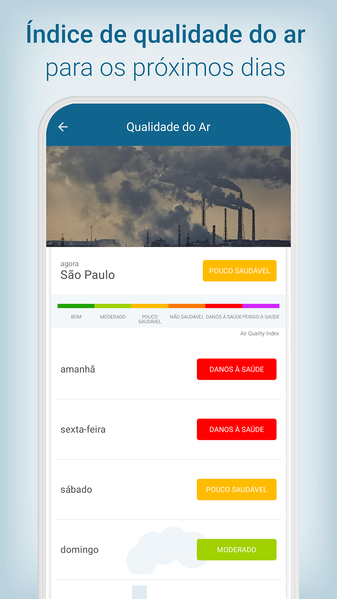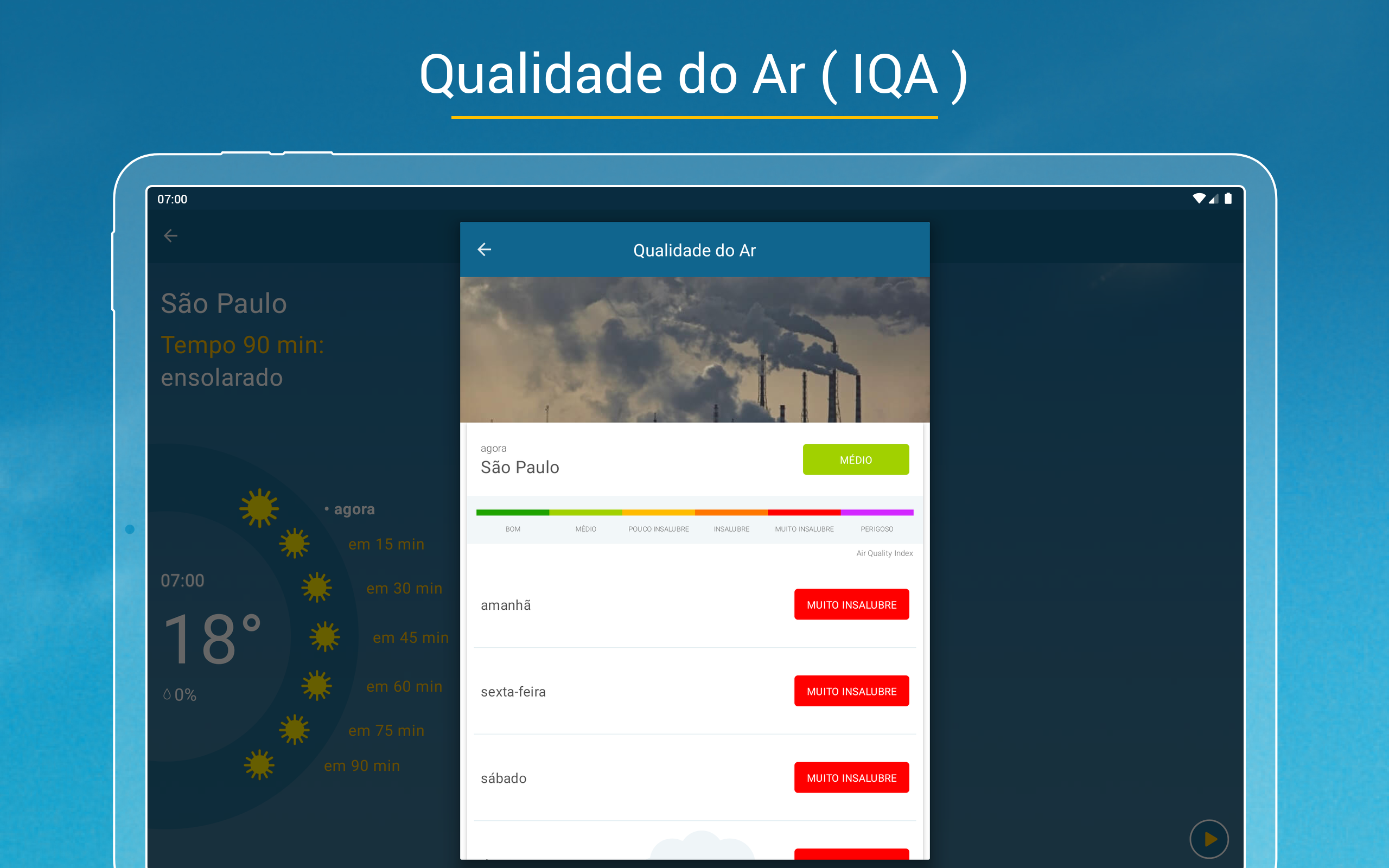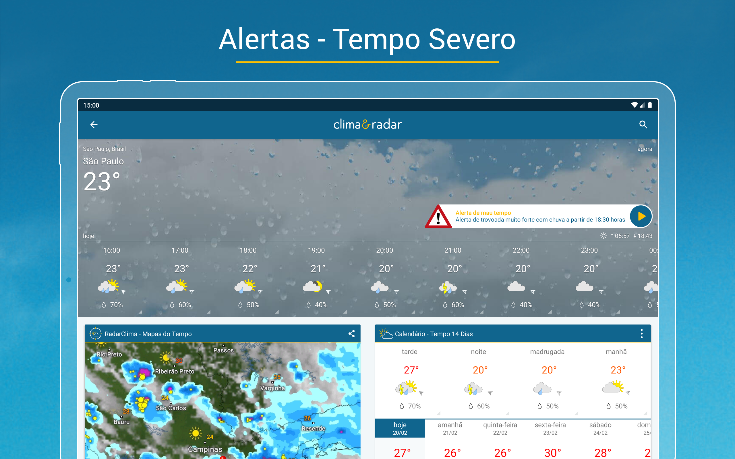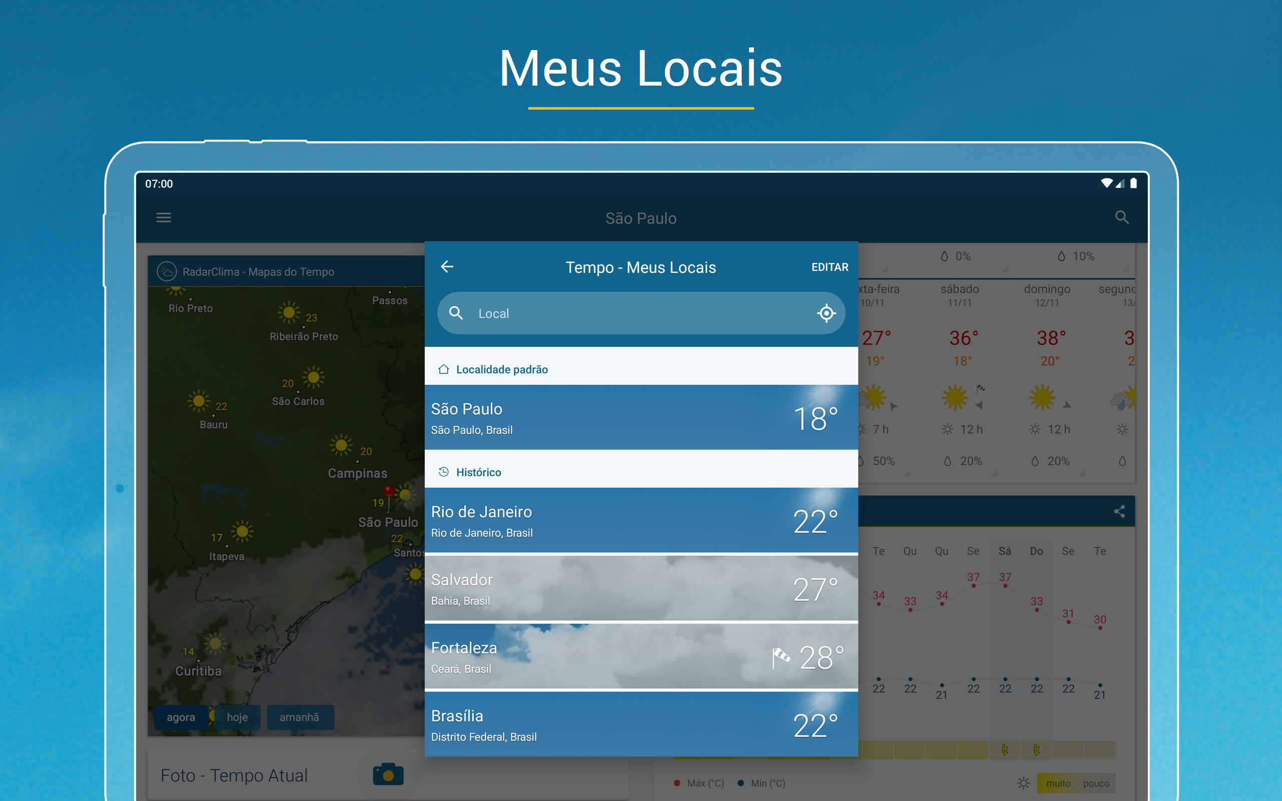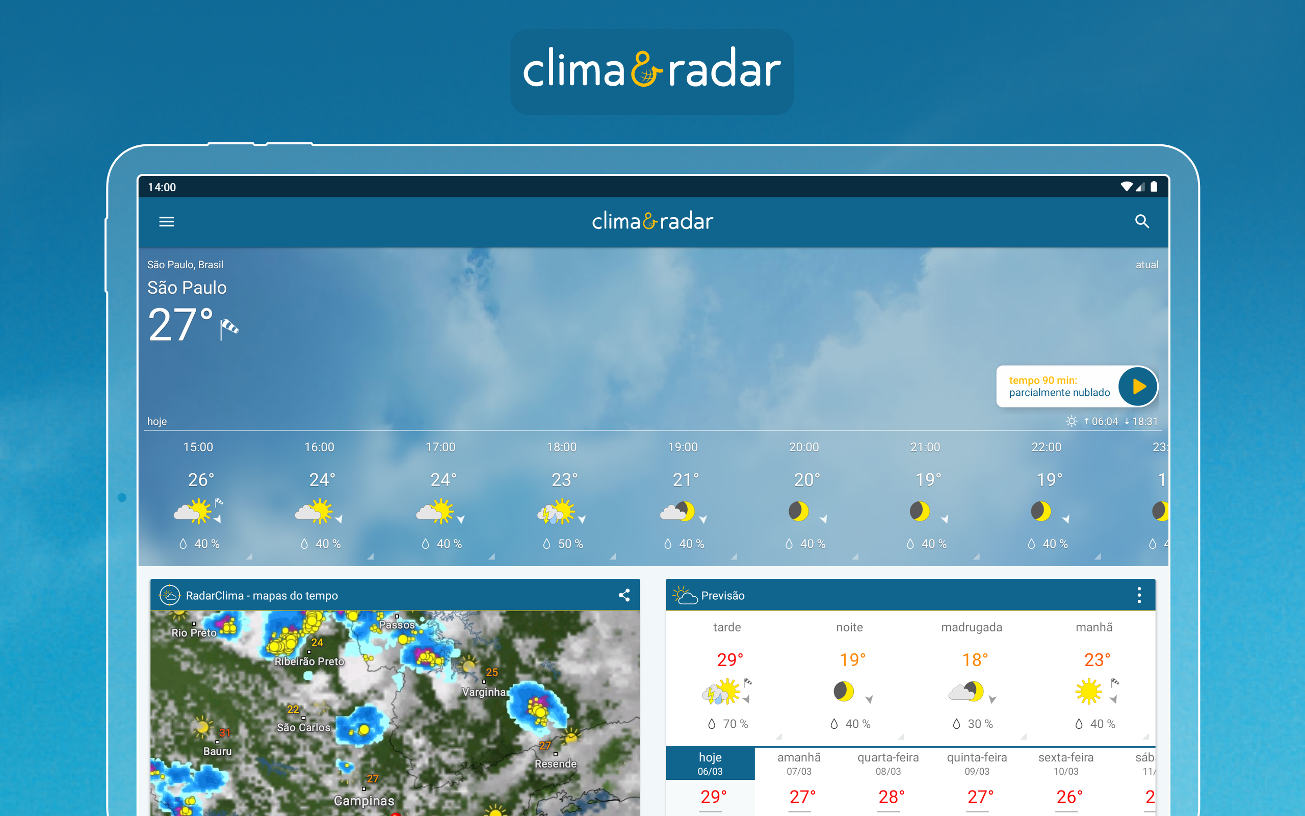 Meteorologia na palma da mãoPrevisão do tempo em todo lugar! Informações meteorológicas direto no app: precipitações (chuva, raio, granizo e neve); temperatura média (madrugada, manhã, tarde e noite); sensação térmica; temperatura máxima e mínima do tempo hoje e de 14 dias; nuvem; vento; temperatura da água no litoral; hora do nascer e do pôr do sol; fases da lua; umidade relativa e pressão do ar; risco de tempestade; índice ultravioleta (IUV); qualidade do ar (AQI). E muito mais!