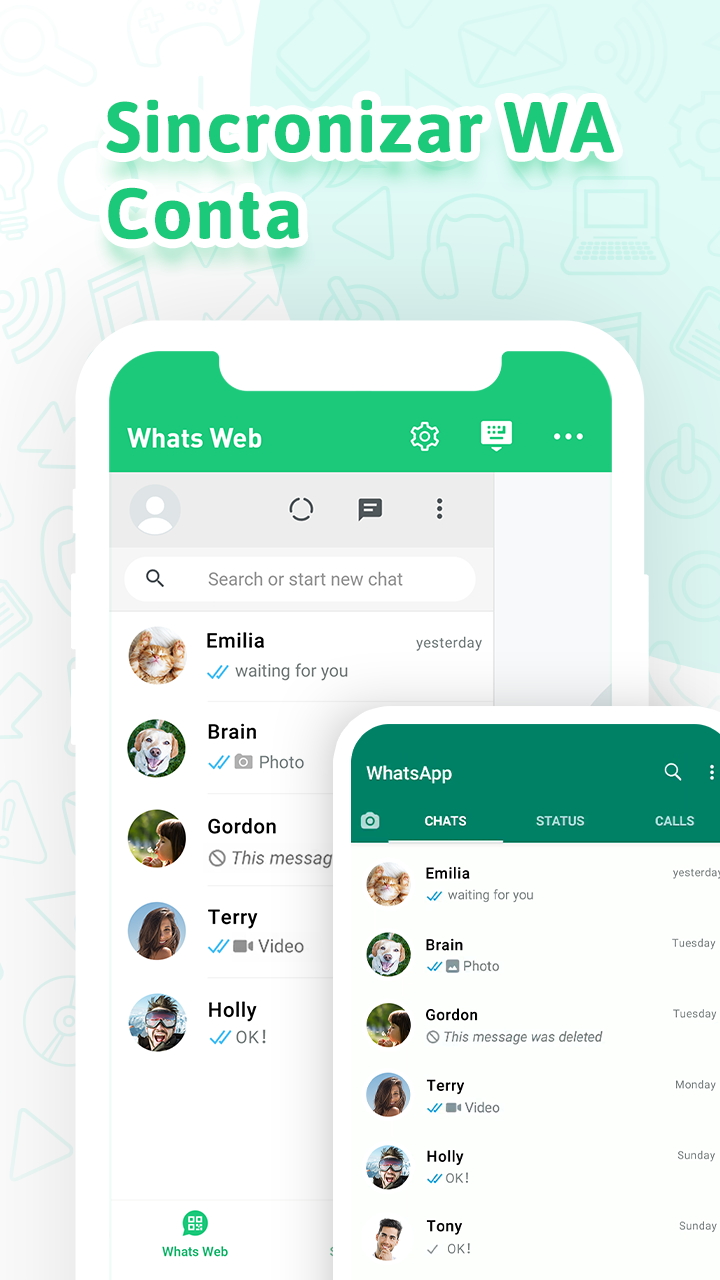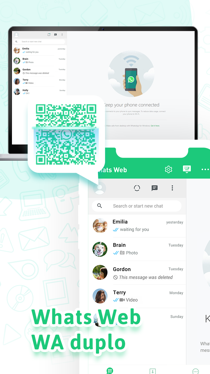 Whats Web for WhatsApp é um aplicativo QR Scanner para que você duplique contas do WhatsApp ou copie a conta WA em dois dispositivos. Ele também fará o download do status do WhatsApp, incluindo vídeos e imagens, e você pode gerenciar todos os seus arquivos do WhatsApp com eficiência. Além disso, este é um Segundo WhatsApp Messager para você bater um papo direto com seus amigos sem adicioná-los ao seu contato.