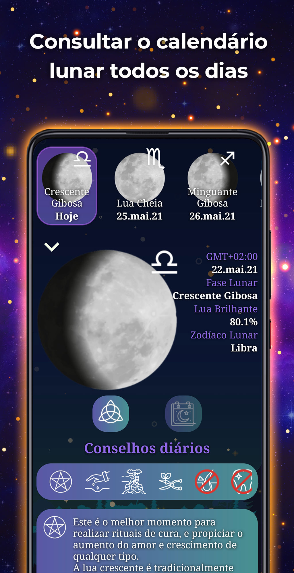 ⛤ Calendário Lunar: Aceda ao calendário lunar para ver a fase lunar actual. Descubra dezenas de dicas de acordo com a fase lunar. Graças ao calendário, pode antecipar e saber quais serão as fases lunares nas semanas ou meses seguintes.