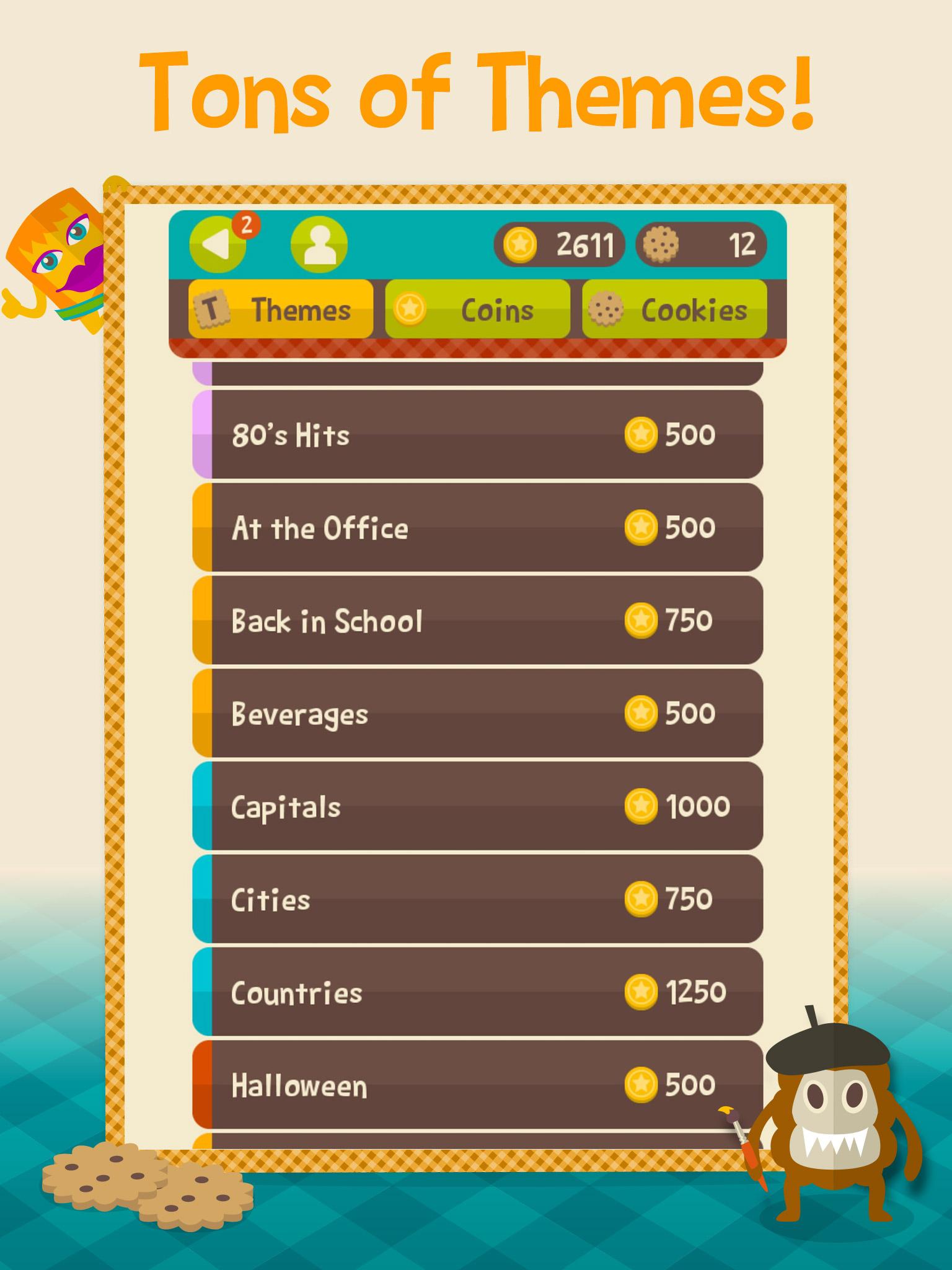 INÚMEROS TEMAS! Divirta-se com mais de 25 temas cheios de palavras relacionadas ou desbloqueie vários outros – comprando ou ganhando!
