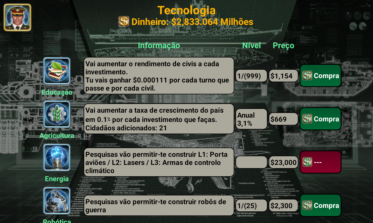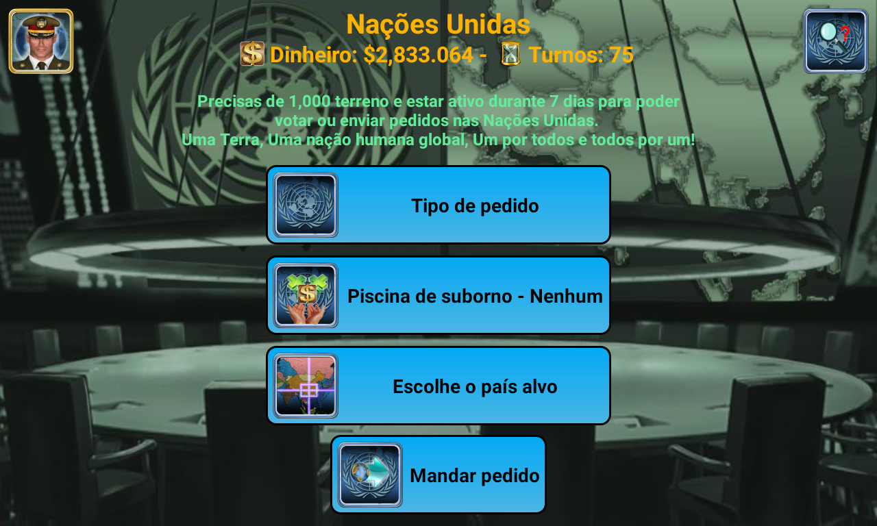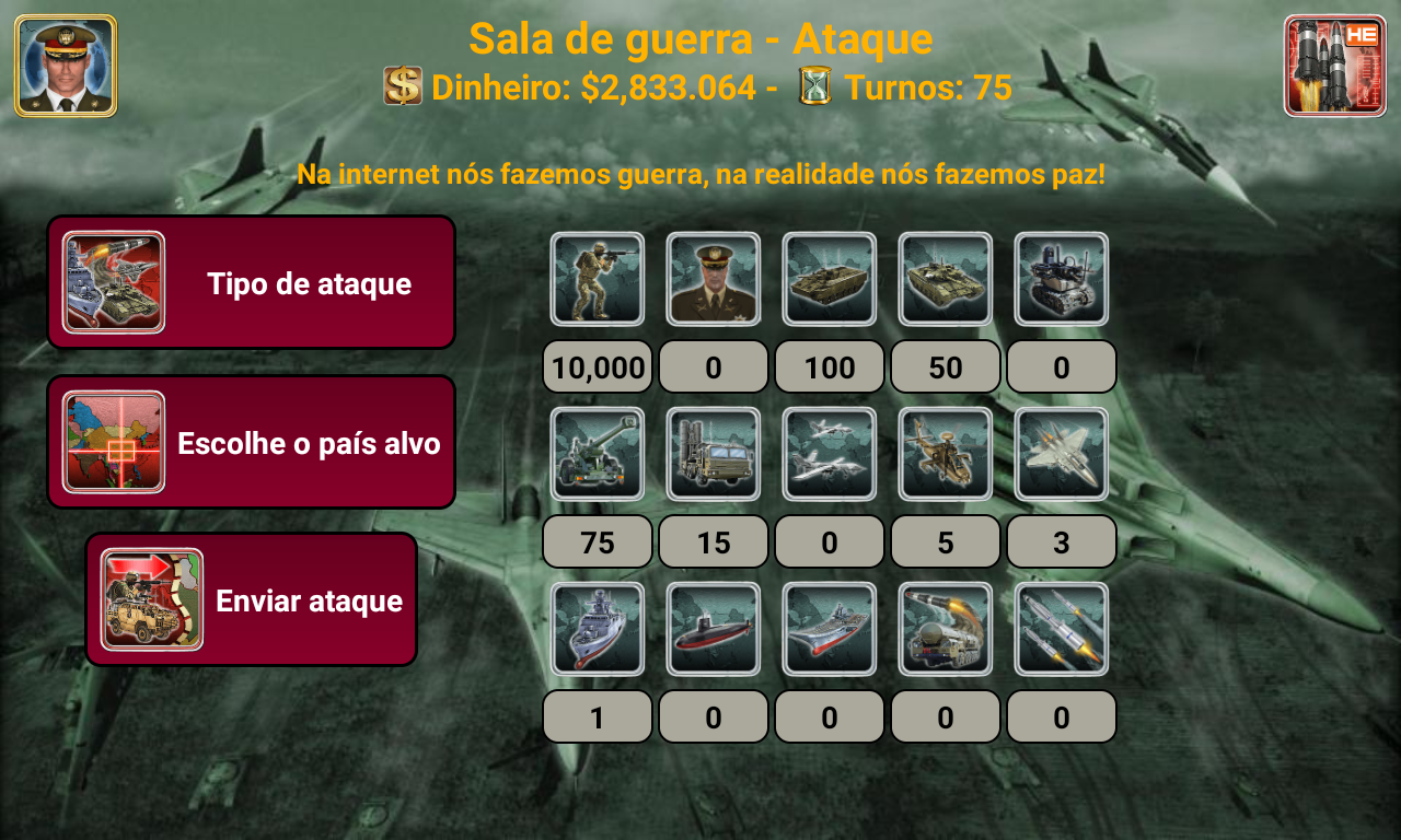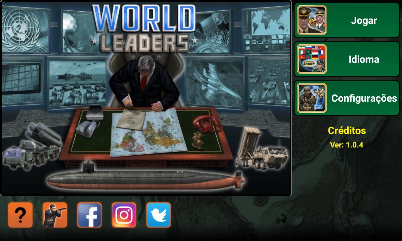 🔥História do jogo🔥 A criação de uma nova Terra começou, e com isso, a maior batalha pelo domínio do mundo. Vais lutar para ser o líder do país mais poderoso do planeta. Contudo, ao mesmo tempo, milhares de outros jogadores começaram a perseguir os mesmos objetivos. O teu sucesso dependerá de maximizares as tuas capacidades de liderança e construir um novo país, fazendo novas amizades à volta do mundo e prova que és o melhor líder do mundo! 🕹️ Este é o jogo perfeito de guerra para entusiastas de jogos baseados em turnos! 🕹️Novo líder mundial Uma grande revolução tirou do poder o governo em funções no teu país. Como líder da revolução tens autoridade ilimitada no país que comandas e vais reconstruir. O governo elegeu-te e à tua estratégia para transformar o país num império. 🕹️Esta nota é exclusiva para ti... O nosso novo país precisa de ti como nosso novo líder, nós vamos ajudar-te e seguir-te qualquer que seja o desfecho... Lidera-nos até à vitória para que o teu nome seja relembrado mundialmente e todos falarão desse feito nos próximos tempos. Tens todas as ferramentas para desenvolver as tuas capacidades de liderança e contruir o nosso país, procura aliados e amigos à volta do mundo. Estás pronto para liderar Comandante Supremo? 🕹️ Líderes Mundiais é um jogo de estratégia baseado em turnos onde tu vais ter de construir um império. Usa o teu tempo de forma sensata para implementar as táticas e estratégias certas! 🕹️Vais começar como líder de um país pequeno e através da diplomacia, estratégia e habilidades, vais expandir o teu domínio sobre todo o mundo. O teu objetivo é de te tornares o líder supremo de todos os outros e liderares centenas de jogadores do mundo todo. Utilizando tudo desde diplomacia até guerra, deves lutar para construir um império, quer económico quer militar. 🕹️O jogo contém: Recursos, Fábricas, Bolsa de Valores, Mercado de Armas, Diplomatas, Alianças, Nações Unidas, Centro de Espionagem, Sala de Guerra, Um Sistema Económico, Tecnologia, Eventos Mundiais, Notícias Globais e uma Inteligência Artificial muito avançada. 🕹️Armas no jogo: Veículo Blindado de Transporte de Pessoal (VBTP's), Tanques, Artilharia, Mísseis Antiaéreo, Helicópteros, Aviões Caça de Combate, Navios, Submarinos, Robôs de Combate, Veículos Aéreos Não Tripulados (VANT's), Porta-aviões e Mísseis Balísticos... 🕹️Opções do líder: Centenas de espiões, guerra, possibilidades diplomáticas e económicas que te ajudarão a decidir como queres construir o teu império. 🎖️Top Mundial de Líderes - Hall Of Fame🎖️ Líderes que se mantenham em #1 por mais de 7 dias consecutivos entram automaticamente no Hall Of Fame mundial. O estatuto do líder vai ser guardado e a nossa equipa vai entrar em contacto com o líder para receber uma recompensa da iGindis. As recompensas vão alterando a todo o momento e novos desafios aparecerão. (Por favor lê mais nas nossas redes sociais) 🕹️Jogos iGindis iGindis é a tua forma de fazer amigos em todo o mundo sem qualquer barreira linguística. Usando o tradutor dentro do jogo, as mensagens serão automaticamente traduzidas para que todos consigam comunicar e entenderem-se uns aos outros instantaneamente. Líderes Mundiais é um jogo multijogador abrangente capaz de suportar milhares de jogadores em cada mundo. Boa sorte na tua missão Comandante!
