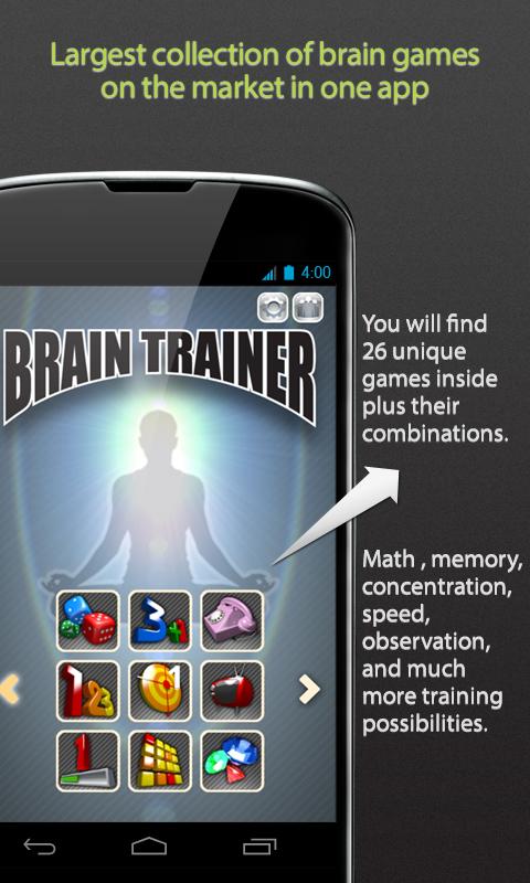 Brain Trainer is the LARGEST collection of brain games on the market. Brain is like a muscle and the more you train it, the better results you get in everyday life.