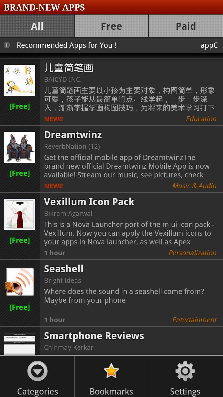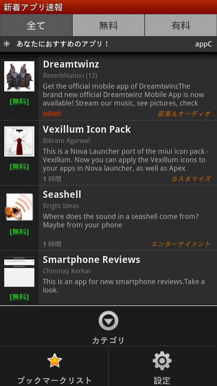 The fastest information of brand-new apps on Google Play Store (Old Android market). When you launch the app, latest information is displayed. Touch the list, to access the app page of Play Store. Detection of new apps is a one-hour intervals. Check frequently. [Browse function] ・Category select ・All/Free/Paid tabs [Bookmark] Bookmark the app of interest. You can download later. [Share] Facebook, Twitter, E-mail, etc. You can share the app. (With icon image) There is also a PC site of this application. http://brandnew-apps.com/ Review: Make It Easy & Fast To Find Newest & Good Apps - AppEggs.com http://www.appeggs.com/apps/growth.apps.brandnew,41728.html Tags: PlayStore,market,fastest,brand-new,newest,new,news,release,information,published