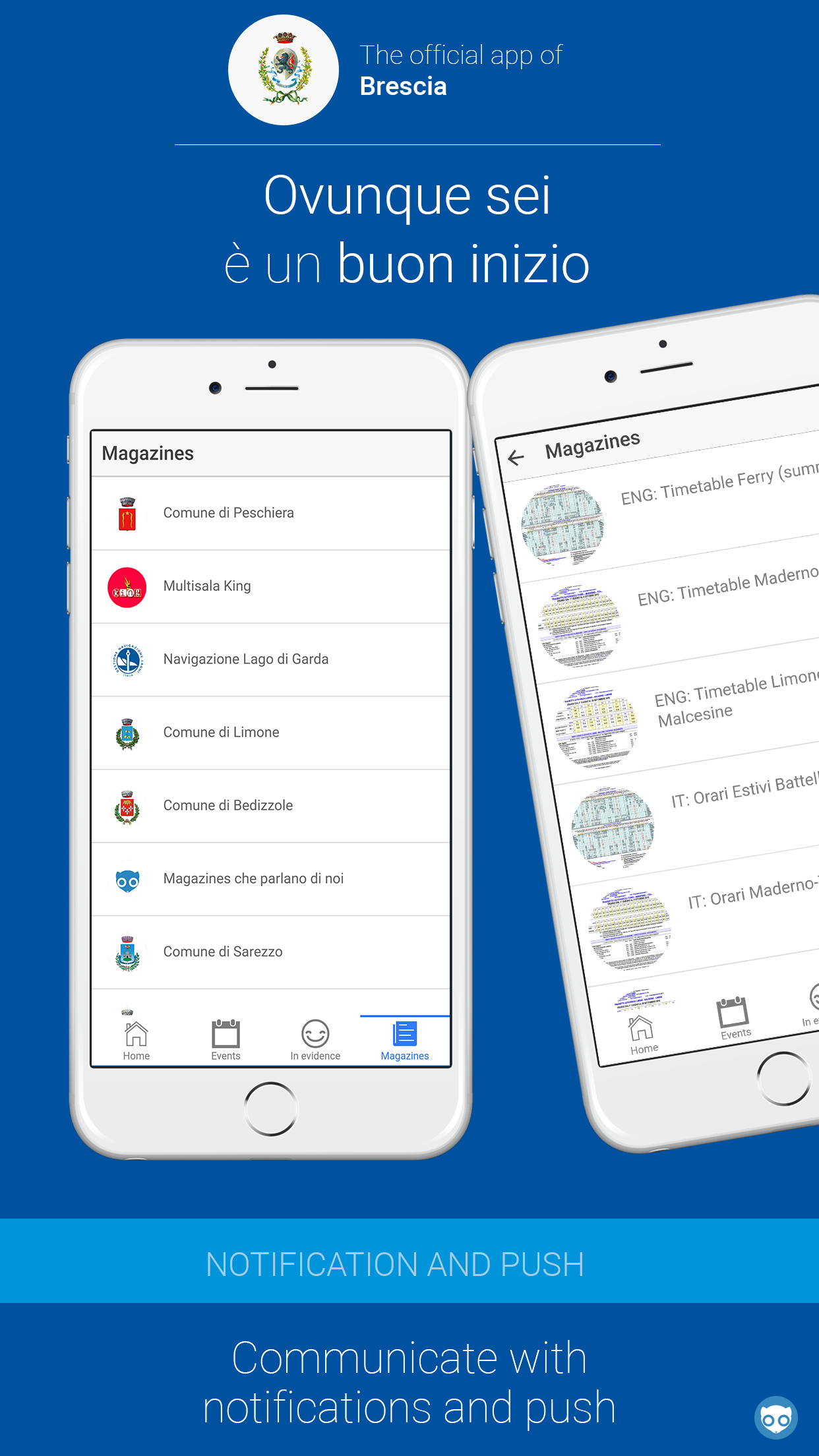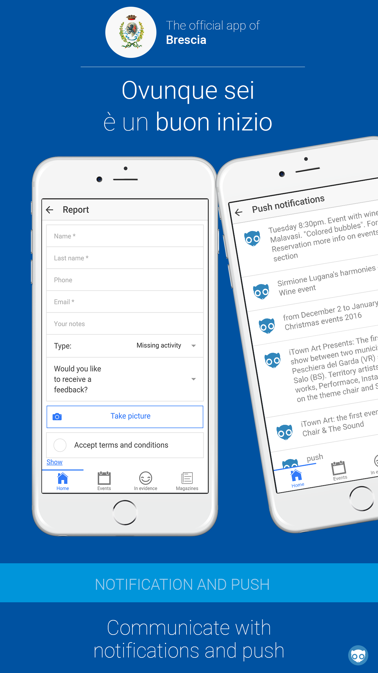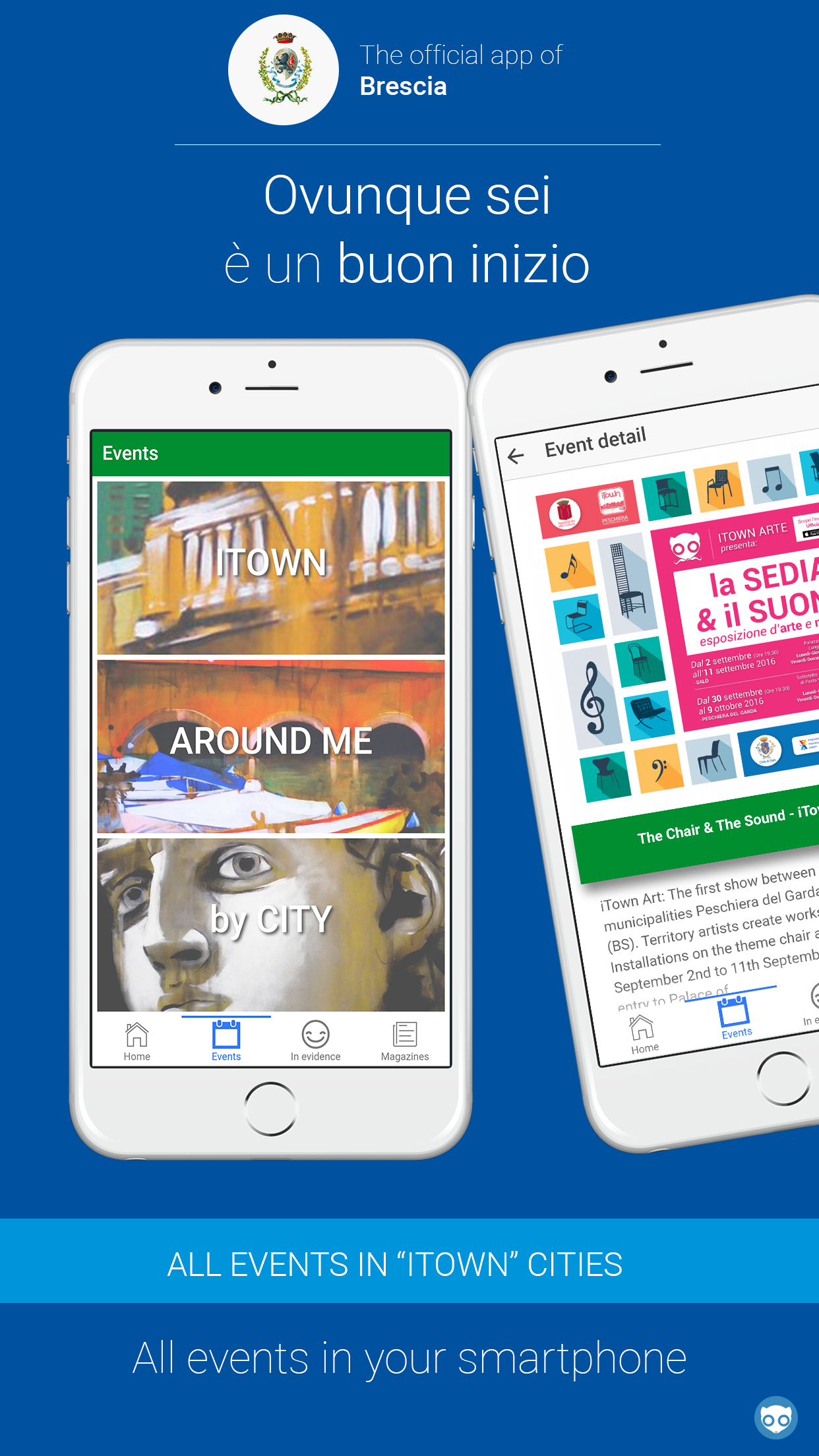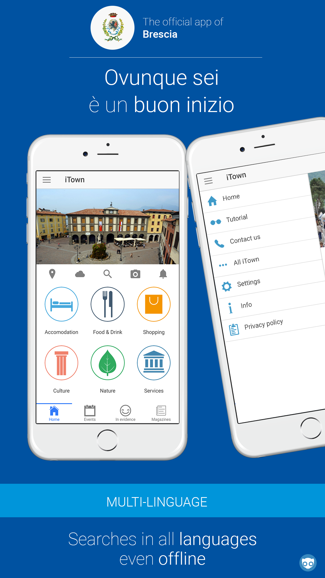 The App includes all the information you need about the town you live in, and is the best way to find out what's going on: from notifications of arts, cultural and sporting events, to information on services for both local people and visitors. "iTown" is the first and only pioneering communication tool aimed at creating a network of Italian towns, and enabling sharing of events, promotions and magazines in local areas. Also: √ Searches in all languages, even offline The app recognises your device's language setting and shows all categories and key information in your chosen language √ Events in your town and other "iTown" towns Gli utenti potranno essere informati sui principali eventi attorno a loro con aggiornamento in tempo reale di data, orario e geolocalizzazione √ Detailed geolocalised profiles Get information on major events in your local area with real-time updates on dates, times and geolocation √ Promotions and profiles shared with other "iTown" apps No need to download a new app every time you want to find a nearby company or promotion, you'll find them all in the "Showcase" network √ Magazines in pdf format that can also be viewed offline Download pdf magazines from the "news-stand" section and view them offline anywhere, at any time √ Up-to-date weather information Plan your day according to the weather forecast √ Keep up to date with push notifications Get information and updates directly and in real time, and you’ll never miss out on anything again √ Communicate via notifications Actively participate in initiatives such as urban environment, waste management, safety, roads, health, etc. by sending notifications And a lot more is coming...