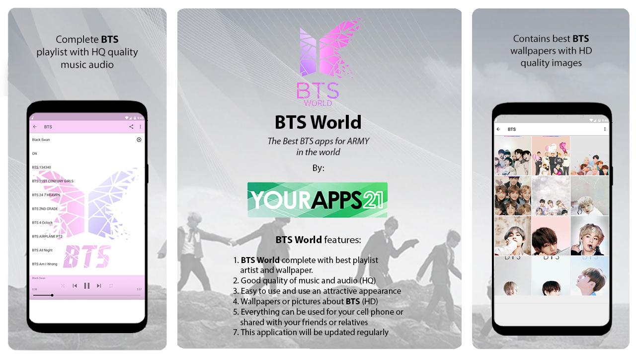 BTS World (Package Name: com.YOURAPPS21.btsworld) is developed by YOURAPPS21 and the latest version of BTS World 1.4 was updated on October 1, 2020. BTS World is in the category of Entertainment. You can check all apps from the developer of BTS World. Currently this app is for free. This app can be downloaded on Android 4.1+ on APKFab or Google Play. All APK/XAPK files on APKFab.com are original and 100% safe with fast download.