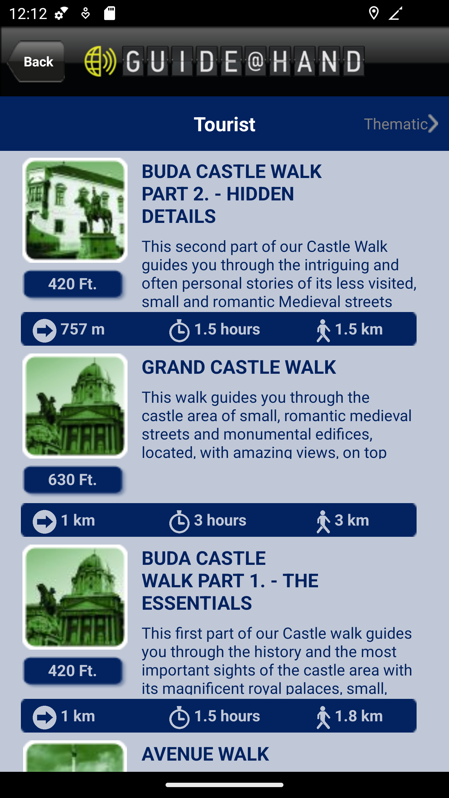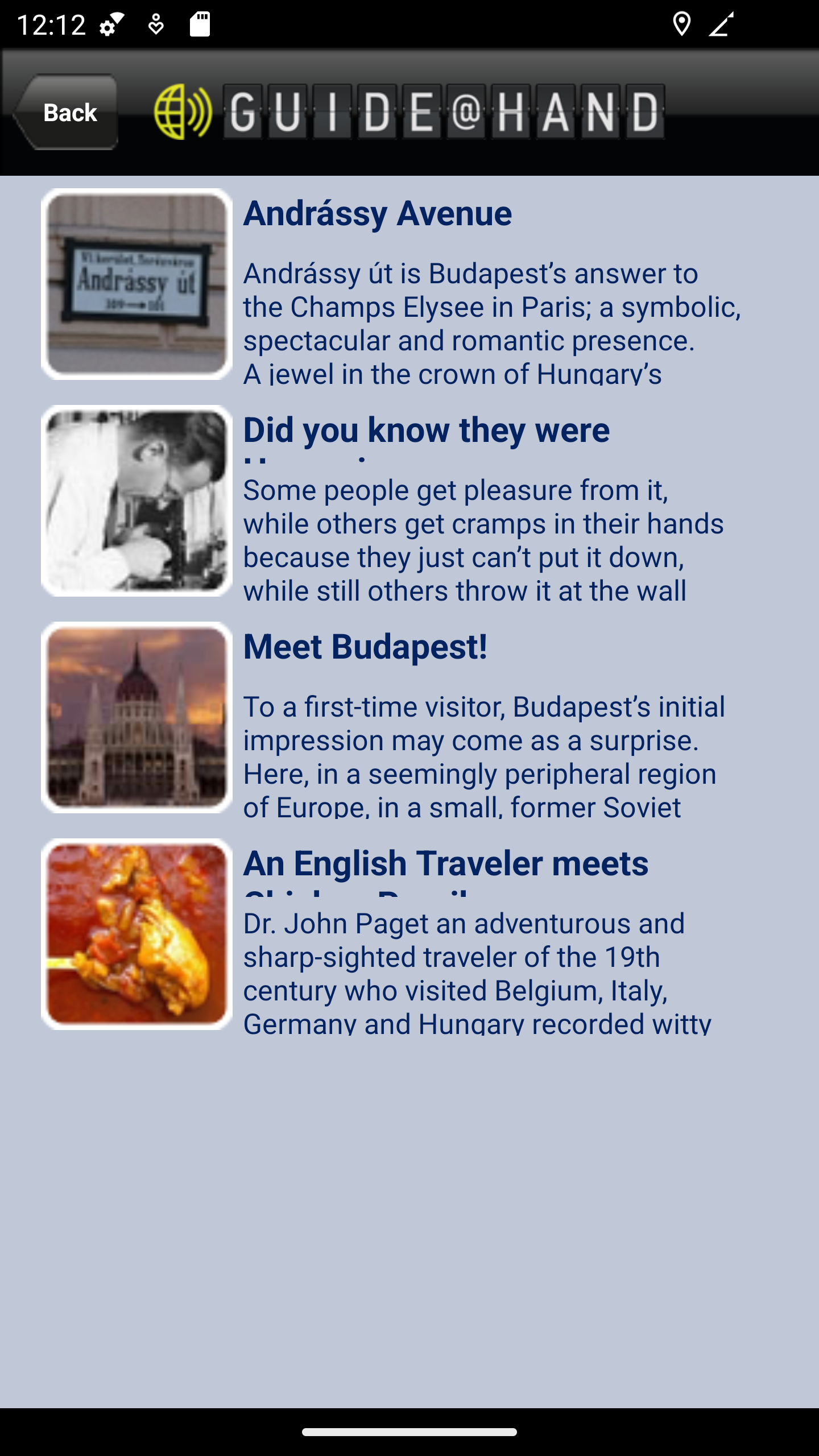 GUIDE@HAND - City Audio Guide ENGLISH: GUIDE@HAND‘s full audio sightseeing content, tourist information, map and software is available in English, German and Hungarian. You can choose the default language when installing GUIDE@HAND to your mobile. MAGYAR: A GUIDE@HAND teljes turisztikai és a városnéző tartalma, térképe és szoftvere elérhető magyar, angol és német nyelven. Az alapértelmezett nyelvet az installálásnál kiválaszthatja, és az alább írtakat magyarul olvashatja és hallgathatja. DEUTSCH: Die ganzen touristische Informationen, Inhalt der Stadtbesichtigung, Plan und Software von GUIDE@HAND sind erreichbar in der Ungarischen, Englischen und Deutschen Sprache. Sie können die Default-Sprache während der Installierung wählen und Sie können den unten geschriebene Text Deutsch lesen und hören. The GUIDE@HAND Walks are created to help you see new places, objects and patterns and discover the past and present of cities with a fresh perspective. All Walks take 2, 3 or 4 hours, so you get to know everything in an easy, fun and adventurous way. Our Guided City Walks are designed in a way that you can simply use your mobile device as an Audio Guide. Just put it in your pocket, and it will help your discovery by navigating you from one point of interest to the next and you will be presented all information and stories at the right time. With GUIDE@HAND you can always determine your location, see where you are on the map. You can also view pictures/images of the sights or read what you have heard previously. You can take a break from your walk any time and resume sightseeing later. EXPLORE WITH OFFLINE MAP You can also discover the city’s points of interest on your own, using the “Explore” tab and our offline city map. Whenever you approach a point of interest your device will automatically provide you with basic relevant information. You can then choose to listen to additional, related stories. TOURIST SERVICES YOU CAN SEARCH AND DISPLAY ON YOUR MAP GUIDE@HAND also helps you choose from a range of handy tourist services near you such as restaurants, bars, shops etc. which you can display on your map. What to gain by getting GUIDE@HAND? INSTALL: By installing GUIDE@HAND, you already have access to our offline city map. Your current location will be indicated on the map and you can easily browse various services (POIs) available in the city. You can set the default language here. DOWNLOAD A WALK: By downloading one or more of our city walks from the "Walks" tab, you will enrich your map with many new sightseeing information, points of interest, pictures and descriptions. All this new information will be available in your „Explore“ tab so that you can visit, read or browse them any time. PURCHASE A WALK: If you decide to buy a Walk, your device turns into an Audio Guide: not only can you read all the information available on each point of interest but you will also be able to listen to it all and follow guided walks with audio navigation that take you from one sight the next. TASTER WALK - The Inner City Walk (2 hours/3 km): This Walk guides you through the most visited, intriguing part of downtown Budapest. It is designed to take you through the places that offer just that: a lively atmosphere, where cafes and terraces meet architectural grandeur, romantic details and interesting stories. Starting from central Deák square, this walk takes you along Andrássy út, one of Europe’s most beautiful avenues. You will see the Opera House, walk by the imposing St. Stephen’s Basilica and then on to Chain Bridge, where, beneath the stone lions, a magnificent view opens up revealing the majestic river Danube. The Walk delivers you back to the heart of the city: Vörösmarty square and Váci utca. Have fun and enjoy discovering!