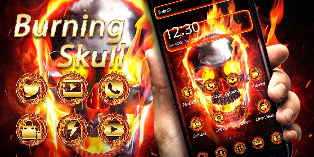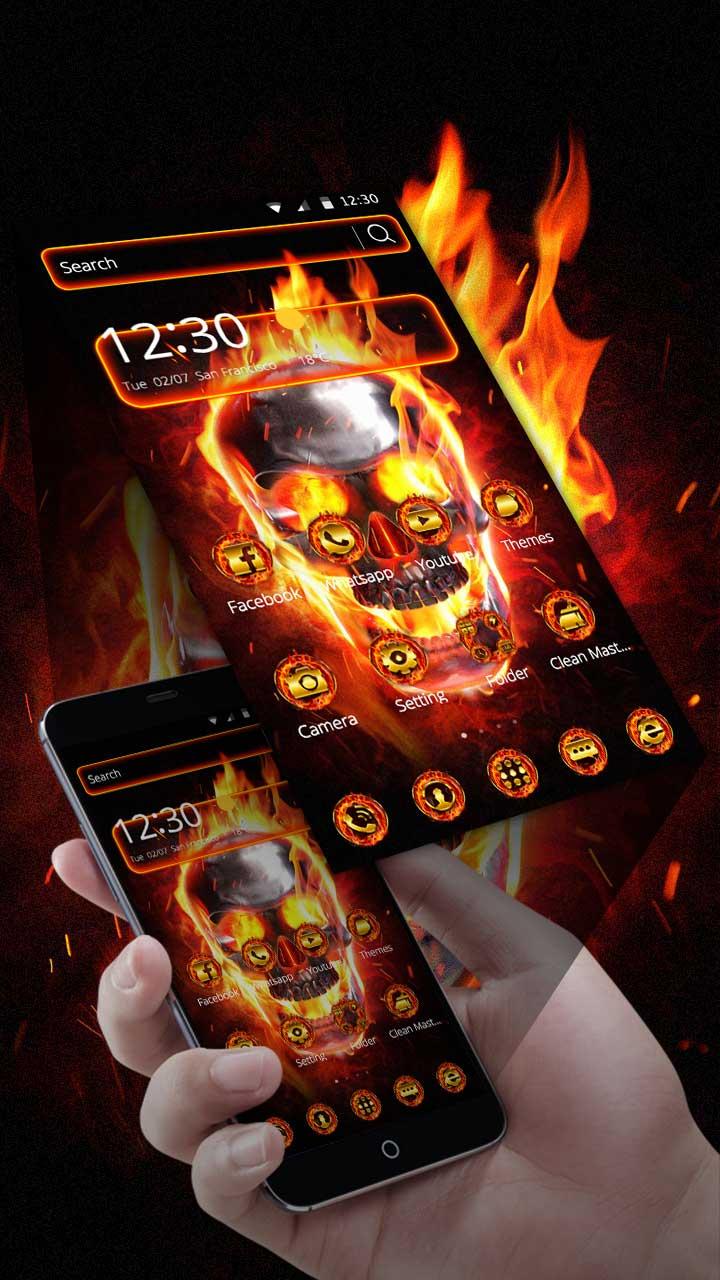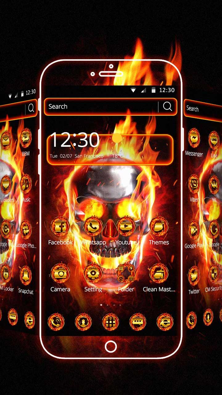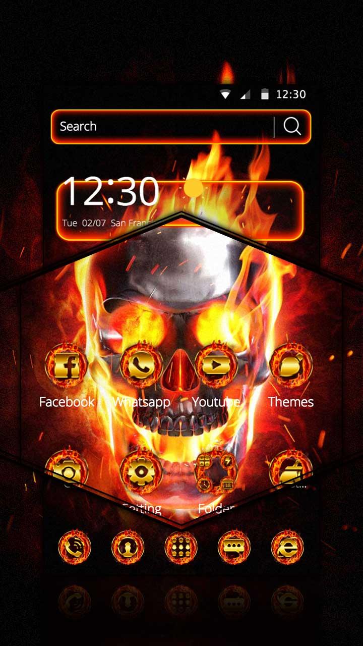 You can get Burning Skull phone theme with flame live wallpaper and hell fire lock screen and flashing golden flame icons pack! Burning Skull is an Android mobile theme with 3D effects, 3D weather, delicate app icon packs and fire skeleton wallpaper. Burning Skull Theme is supported on most Android devices. Install the theme for a 3D home screen and to make your phone look elegant!