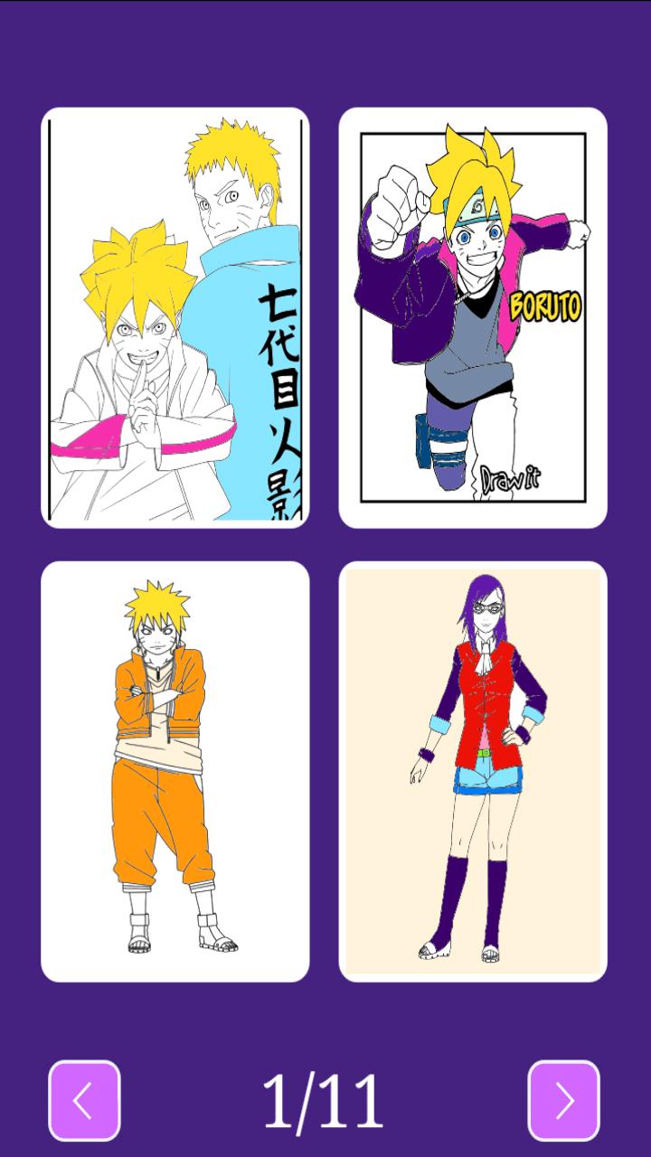 It is a enjoyable game for children and also for adults. A nice coloring game, heroes of cartoons: Naruto uzumaki, Sasuke, , Madara uchiha, Gaara, itachi uchiwa, jiraya, pain, obitu uchiwa, Hokage tsunade, Kakashi Hatake, Sakura Haruno, Boruto ,Sarada ... This app was designed for fans of boruto: naruto next generations anime, and Mitsuki, Sarada Uchiwa, Konohamaru Sarutobi , ninja academy, the most famous shōnen manga in the world, and for Nijna warrior and samurai fans. Your can paint, draw or scribble when you want. Scribble, painting and drawing has never been so easy and fun. Let your kid be creative by downloading this amazing free app: Naruto and Boruto coloring game for kids, with many photos that can be drawn, painted or scribble New naruto and boruto, and ninja shinobi characters will be added regulary! Integrating learning with play is the best way to teach kids. Turn your smartphone or tablet into a fun toy . You like watch anime, you are a fan of naruto shippuden manga, so install this top free app and the coloring chunin exam begins ! Rate our app 5 stars in order to encourage us to shine more, thanks. you would find in this application: * Spiders in action * Easy to play * Share your work * Save and load your work * Cancel button * Zoom button * Colored buckets * an eraser