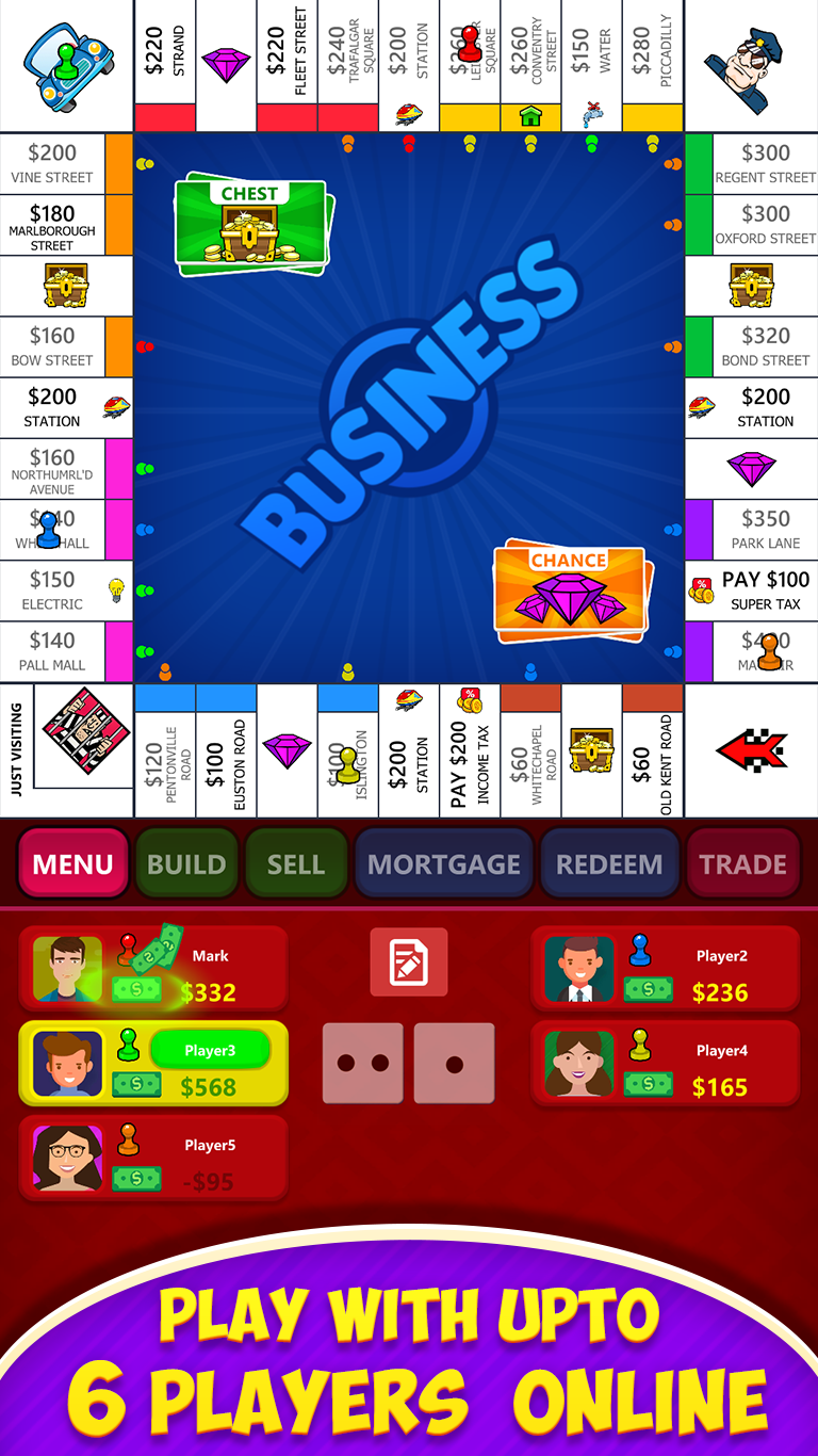 Embark on a journey to own it all - The Business Board: United Kingdom Game! Build your own empire! Pack your bags and embark on a world tour of some of United Kingdom’s most exciting cities in Business Board. Wheel and deal in the most exotic cities and exciting cities with property values in the millions! It's a fun twist on a classic board games favorite! The objective of the game is simple: Make as much money as you can, and drive your opponents into bankruptcy. Roll the dice, buy a property, pay rent, pass go, and collect $200. Repeat. Roll the dice, travel around the world, trade your property, win auctions, catch the opportunities, create your business: build houses and hotels, charge fees and run the world as a real Businessman. Business Board is a great game for 2 - 6 players. It is a board game where players roll two six-sided dice to move around the game board, buying and trading properties, and develop them with houses and hotels. Players collect rent from their opponents, with the goal being to drive them into bankruptcy. Money can also be gained or lost through Chance and Community Chest cards, and tax squares; players can end up in jail, which they cannot move from until they have met one of several conditions. There are other places on the board which can not be bought, but instead require the player to draw a card and perform the action on the card, pay taxes, collect income, or even go to jail. Play with your Facebook friends, against the computer, against your friends in Local Multiplayer or with millions of Business Board players around the world in Online Multiplayer Mode. You can also create Private Rooms and invite your friends to play in Play with Friends Mode. Don't forget you can trade the properties with your opponents. Be lucky on chases and chances, try to escape from jail. So go ahead, build your business, rule the world and act wisely not to become bankrupt. Buy up whole neighbourhoods and create a capitalism empire as you watch all your money grow. Remember, it is not enough to win, others should lose! It's time to spice up your old board game by adding some twist to it. Remember those good, old childhood days, where you spent the entire day playing board games? Now that you are all grown up, you probably want those moments back, right? Thats why we have Business Board, the fun Dice game for Board game lovers, now release on the Play Store! Incredible fun & brain racking, this Business Board: United Kingdom Dice game is a must have in your game collection. Download Business Board United Kingdom for Free and have hours of Dice Game fun!!!! ◆◆◆◆ Business Board: United Kingdom Features◆◆◆◆ ✔ Create Private Room and Invite Friends and Family ✔ Play with Facebook Friends or as Guest ✔ Play with players across the world ✔ 2, 3,4,5 or 6 Player Mode ✔ Play with Local Multiplayer Don’t forget to rate and review Business Board: United Kingdom. Your Reviews matter and we’re listening!