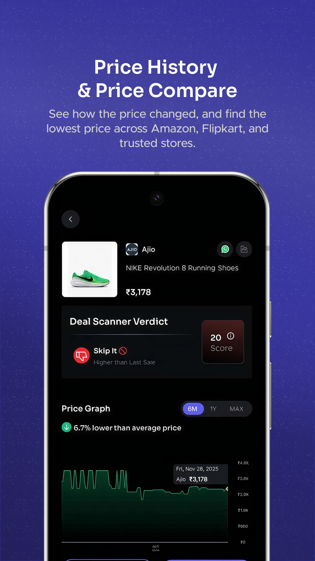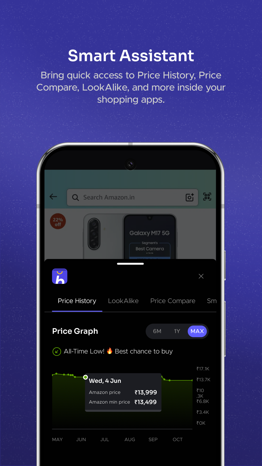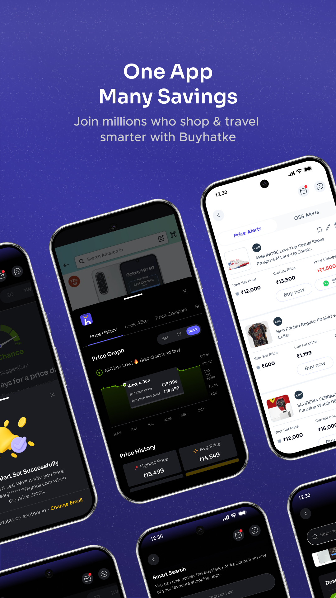 Buyhatke is your go-to app for AI enabled shopping in India. Compare prices across online e-commerce stores. Get price history and trends. Discover exclusive coupons and offers. Set price alerts and receive notifications when prices drop to your set limit. Save time and money with this price tracker. We have for you many great features to improve your experience. Price Graph: It shows a product's price changes over time in various e-commerce stores. It allows users to see how the price has changed, highlighting trends, peaks, and drops. This feature helps shoppers make informed decisions. It shows them when the product was at its lowest price. This lets them buy their favorite products at the best deal. Price drop alert: One of the most stand-out features of the Buyhatke app is the price drop alert. You can set it for your favorite products. It then notifies you when the price falls to your desired level. This feature works on major shopping sites, like Amazon, Flipkart, and more. It ensures you get the product at the lowest price. Lookalike: Save more on every buy. This feature helps you find the visually similar products at different e commerce apps Coupons: This feature shows you all the discount coupons, promo codes, and daily offers. All you have to do is select a coupon or offer you like and complete your shopping. Compare Prices: It helps users quickly compare product prices on various e-commerce sites. By tapping "compare price," users can see the product's price on various e-commerce sites. It helps users find the cheapest option. Automated checking replaces manual site reviews, reducing time and expense. Spend lens: Find your lifetime spent on any site like flipkart, amazon, myntra, ajio, meesho, booking, airbnb Watch lens: Find your time spent till date on any netflix or youtube Cab comparison: Compare Uber, Ola, Rapido and Namma Yatri and get the best prices. Not just that we also help you fetch the best pickup location that saves you more using smart pickups
