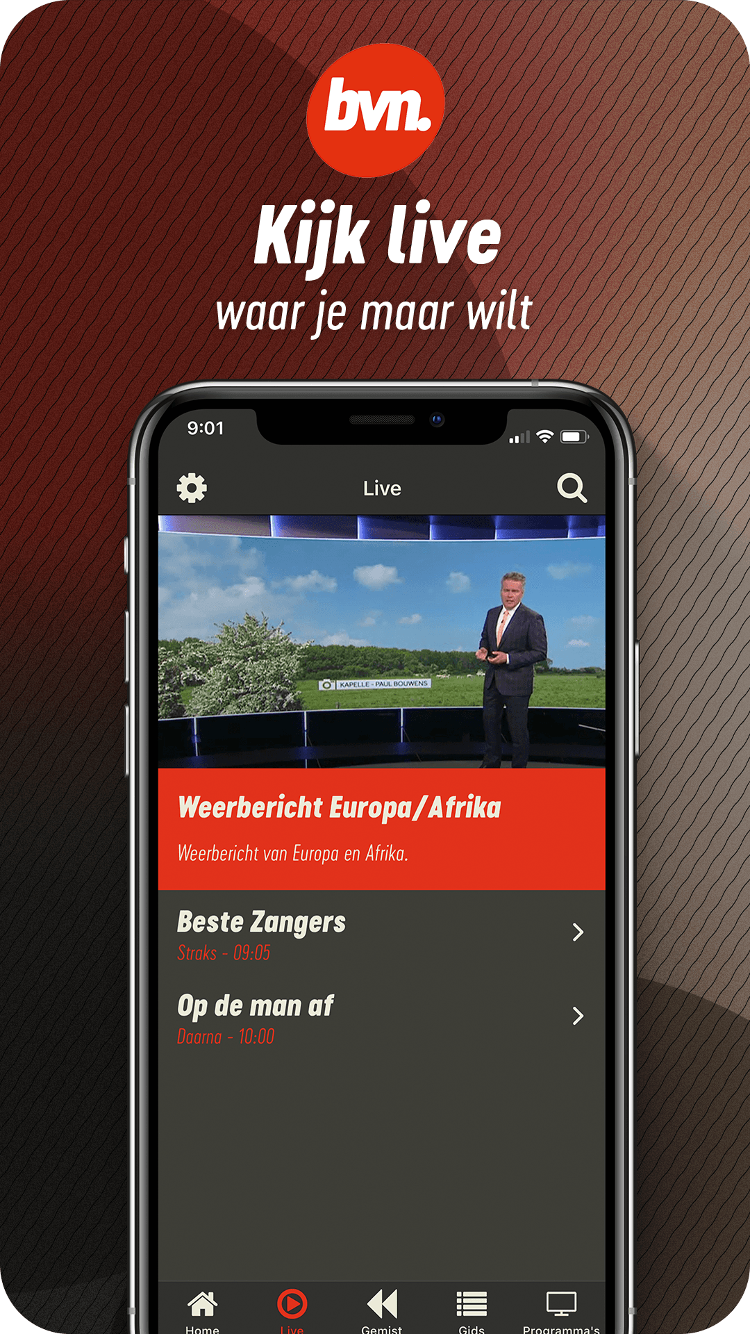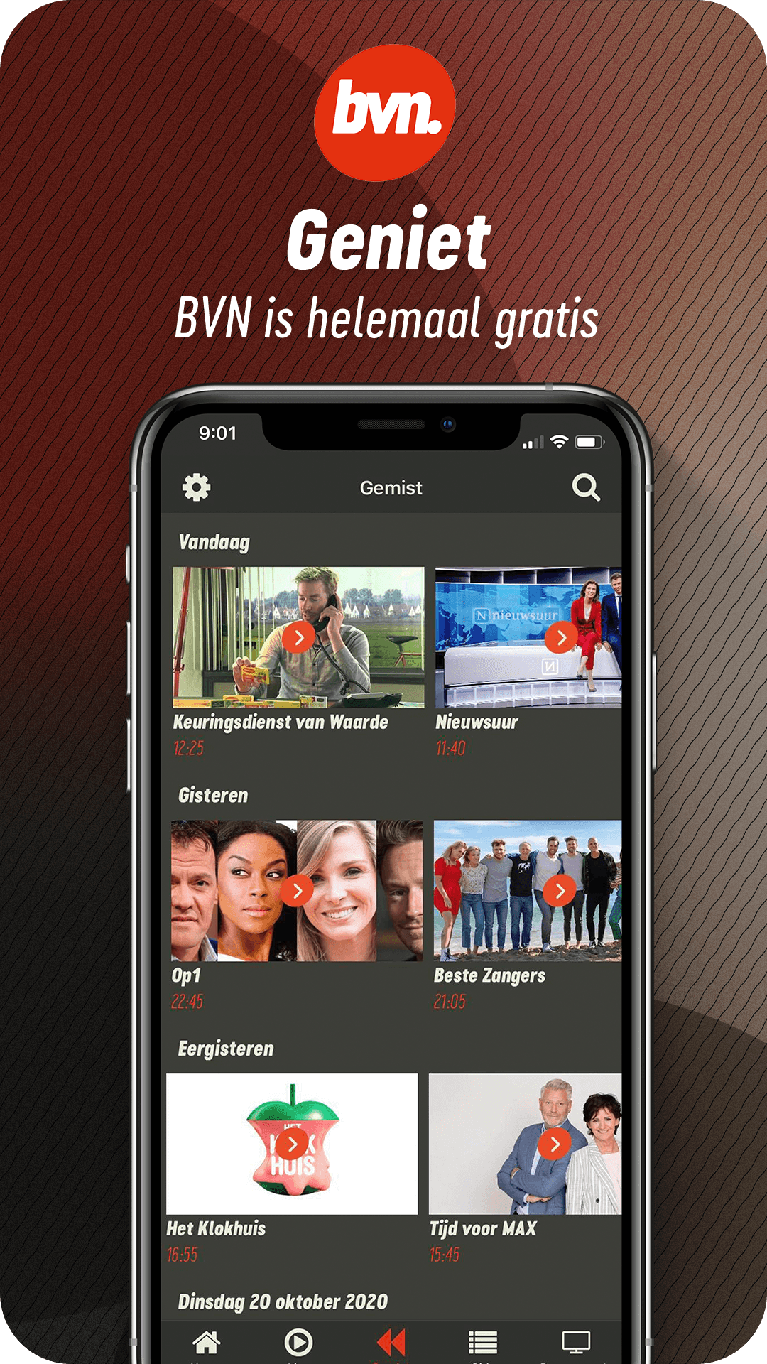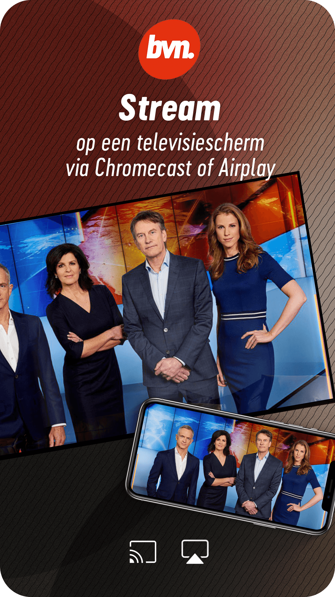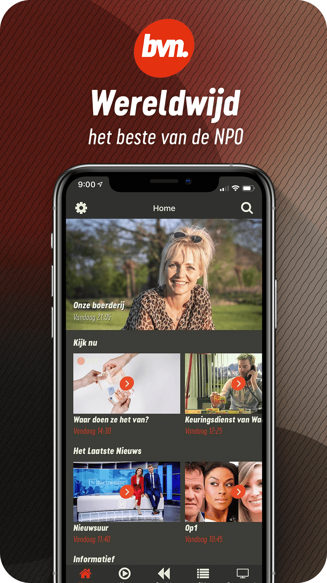 With the BVN app you can watch BVN live worldwide, wherever and whenever you want. Did you miss a program? Then watch most programs easily. BVN (Beste Van NPO) is the public television channel for Dutch speakers outside the Netherlands. BVN offers a daily selection from the current television offer of the NPO: news and backgrounds, Dutch-language drama, events, education and information, human interest, sports, entertainment and children's programming. BVN is available via satellite in a significant part of the world and worldwide via the live stream on bvn.tv and via this BVN app. With the BVN app you can: - Watch BVN live. -Rewind: rewind the live stream up to 12 hours - Missed: watch a lot of programs back. - TV guide: see what's being broadcasted at BVN, in your broadcast times location. - Programs: search in all programs. - Connectivity: watch BVN via Chromecast or Airplay on your television screen. At BVN you can watch, among other things: NOS Journaal, Farmer Searches Woman, Cops Rotterdam, Op1, NOS Studio Sport Eredivisie, I'm leaving, De Rijdende Rechter, Best Singers, Keuringsdienst van Waarde, Met het Mes op Tafel, De Slimste Mens, Podium Klassiek , BinnensteBuiten, Dream House Wanted, NOS Studio Football, Between Art and Kitsch, Who is the Mole, Spoorless, Buitenhof, Het Klokhuis, Sesame Street, Youth News, EenVandaag, Nieuwsuur, Time for Max and much more. With the BVN app you can watch TV online wherever and whenever you want! Free, without login or subscription.