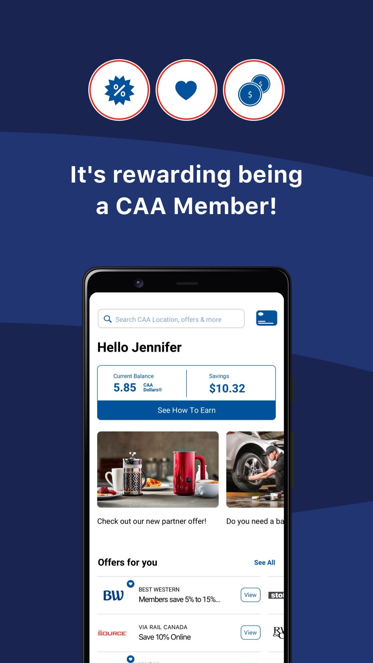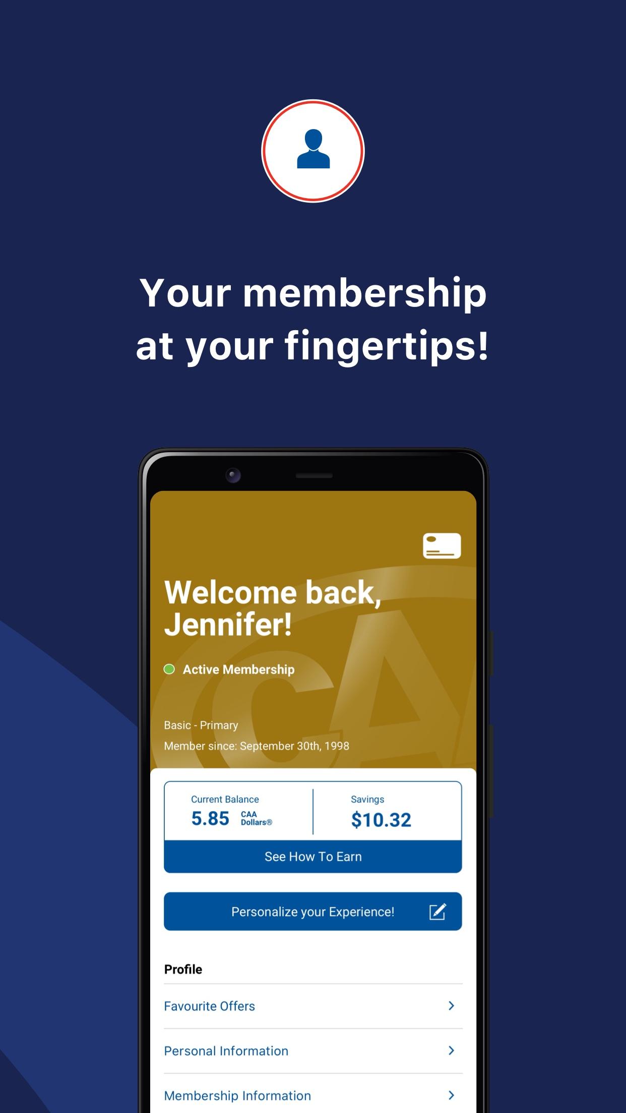 Access your Membership, right at your fingertips. With the CAA Mobile app, we are only a click away. Whether you have a flat tire, have run out of gas, get locked out of your car or if you need a tow or a battery boost, CAA is there to help. CAA Roadside Assistance also covers Battery Testing & Replacement, Emergency Fuel Delivery, and Lockout Help. * Our 24/7/365 service is backed by 35,000 service vehicles and over 100 years of experience. After you call for assistance, use the app to track your CAA driver’s location and estimated arrival in real time. You can even share your status with family and loved ones. CAA Members can take advantage of instant savings or earn CAA Dollars® at over 124,000 Rewards partner locations across North America. With so many opportunities to save, easily keep track of all of your favourite offers in the app. The new CAA Mobile app brings all of these benefits together in one location making them easily accessible. Key features of our newly redesigned CAA Mobile app include: • Search for nearby offers, CAA branch locations, CAA Approved Auto Repair facilities, in app content, and more. • Easy access to main menu items: Home, Messages, Roadside Assistance, My Account, and More • Access Member-exclusive Deals – get savings and rewards from 124,000 participating retail locations and services, across North America. • View Current Balance and Savings on the Home screen • Quick access to your digital Membership card and add it to G Pay. • View and update Account information • Enjoy peace of mind, Members can easily Request Roadside Assistance • Receive notifications of special offers and CAA tips The Canadian Automobile Association (CAA) is one of the largest Member-based organizations in Canada. We help provide freedom and peace of mind to over 6 million Members through 9 automobile Clubs: AMA, BCAA, CAA Niagara, CAA Atlantic, CAA South Central Ontario, CAA North and East Ontario, CAA Saskatchewan, CAA Manitoba and CAA Quebec. Please note: This version does not support Android tablets. *Based on availability.