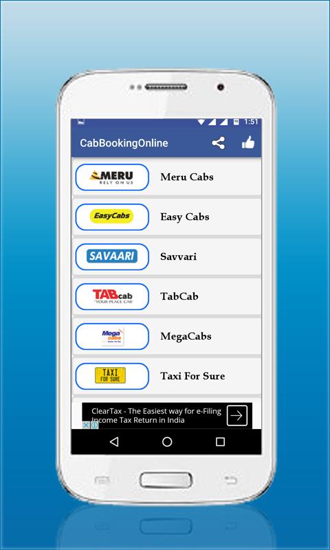 Cab Booking Online is a free android Application. This unique All in one mobile online Cab booking or taxi booking application offers you some of the major online cab booking or online taxi booking apps in one interface.