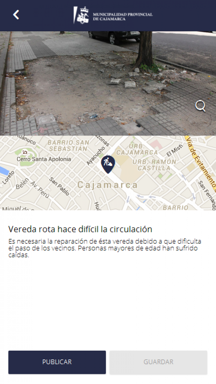 Cajamarca es un mapa interactivo y participativo en donde los vecinos tienen la posibilidad de generar reportes ciudadanos de sus barrios, votar reportes de otros vecinos y difundirlos en las redes sociales. Así, los ciudadanos pueden impulsar acciones vecinales y recuperar el sentido de comunidad.