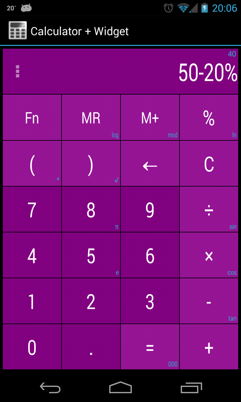 Calculator + WIDGET * 21 motifs * free * lockscreen widget features(Android 4.2) * history stores the last 30 results * resizeable widget (Android 3.1 and later) * changing fonts size * setting precision the expression * widget -Added a banner ad in the settings, but widget has no ads. Please do not give bad rating due to banner ad because it is only banner ad, no icon ads and no notifications ads. -See Pro Version of this app, it is no ads and has more features. See Pro version (no ads, more features, less permissions): https://play.google.com/store/apps/details?id=makatea.pro.calculator.widget IF YOU LIKE THIS APP PLEASE RATE IT WITH 5 STARS. IT MOTIVATES US TO FURTHER IMPROVE THE APP AND WORK ON NEW INNOVATIVE FEATURES. THANK YOU IN ADVANCE CALCULATOR WIDGET used to : - subtraction - addition - multiplication - division - parenthesis - division - percentage - square root - log logarithm - mod remainder of division - ln natural logarithm is the logarithm to the base e - power - sin - cos - tan - memory copy paste, you can copy and paste for example from SMS - parenthesis - vibration - pi constant - e constant INTERFACE : - 21 motifs (holo dark and light, purple, green, standard, black transparent, blue transparent, grey transparent, white, sky blue) - history (stores the last 30 results) - changing fonts size - setting precision the expression - actions in the history menu (delete, copy equation, copy expression, copy result) - lockscreen widget (Android 4.2) - resizeable widget (Android 3.1 and later) - option show extra bar (Fn, MR, M+, %) - option show subscripts - option show superscripts (it shows the current result) - option vibration Permissions Explanations: -android.permission.INTERNET only for download and show banner ads in settings but widget on homescreen is no ads -android.permission.ACCESS_NETWORK_STATE to check access to the internet, if device is online and user go to settings then see banner ad -android.permission.READ_PHONE_STATE to read device id which is unique and it is required for ads -location is needed to set special characters in calculator, -internet history to copy and paste results from/to browser NOTE -If the calculator no longer responds to the buttons, remove the widget from the homescreen and put it again into homescreen.