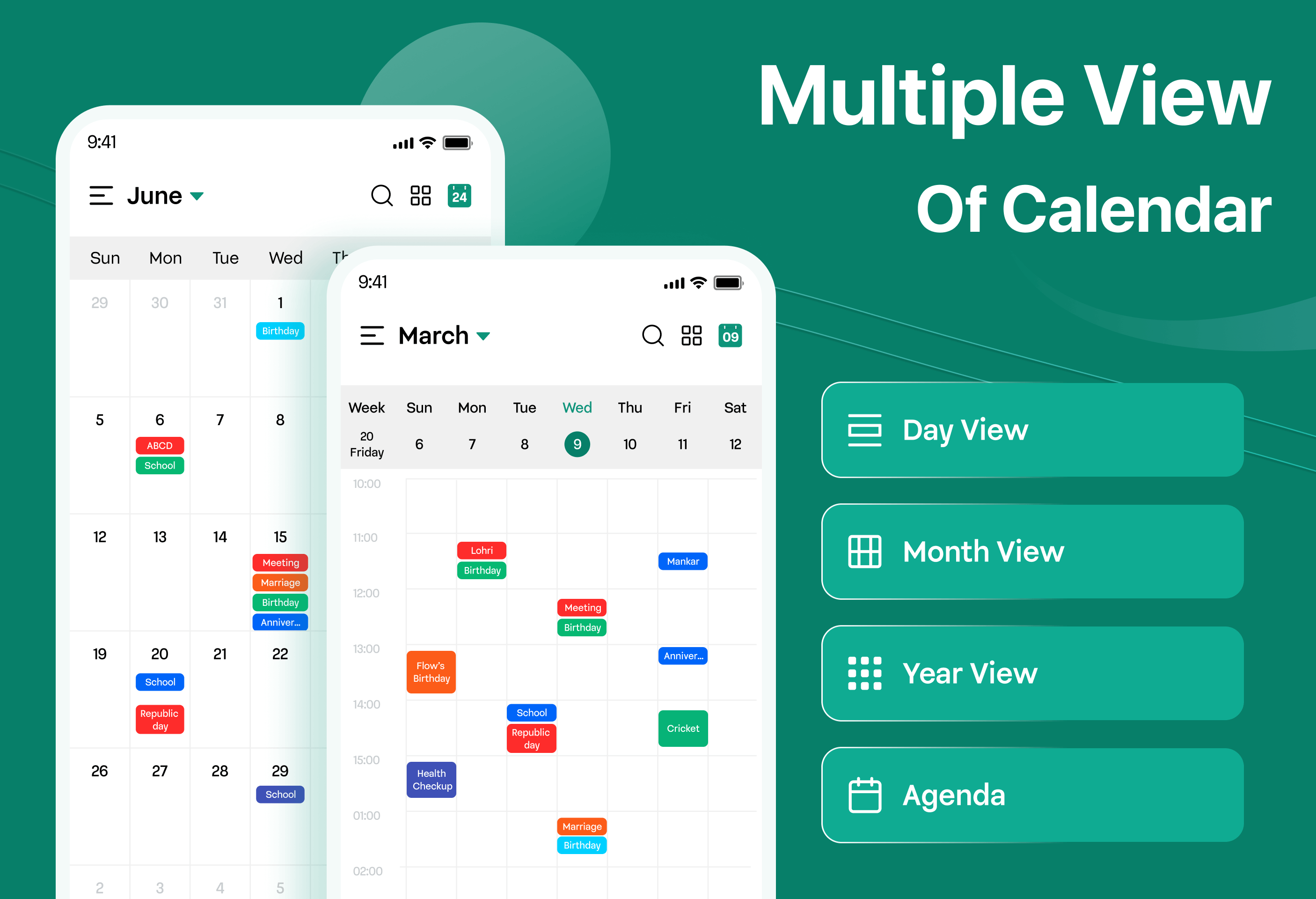 Choose from multiple views to suit your scheduling style: Year View, Month View, 3-Day View, Week View, or Day View. Find the perfect way to visualize your plans!