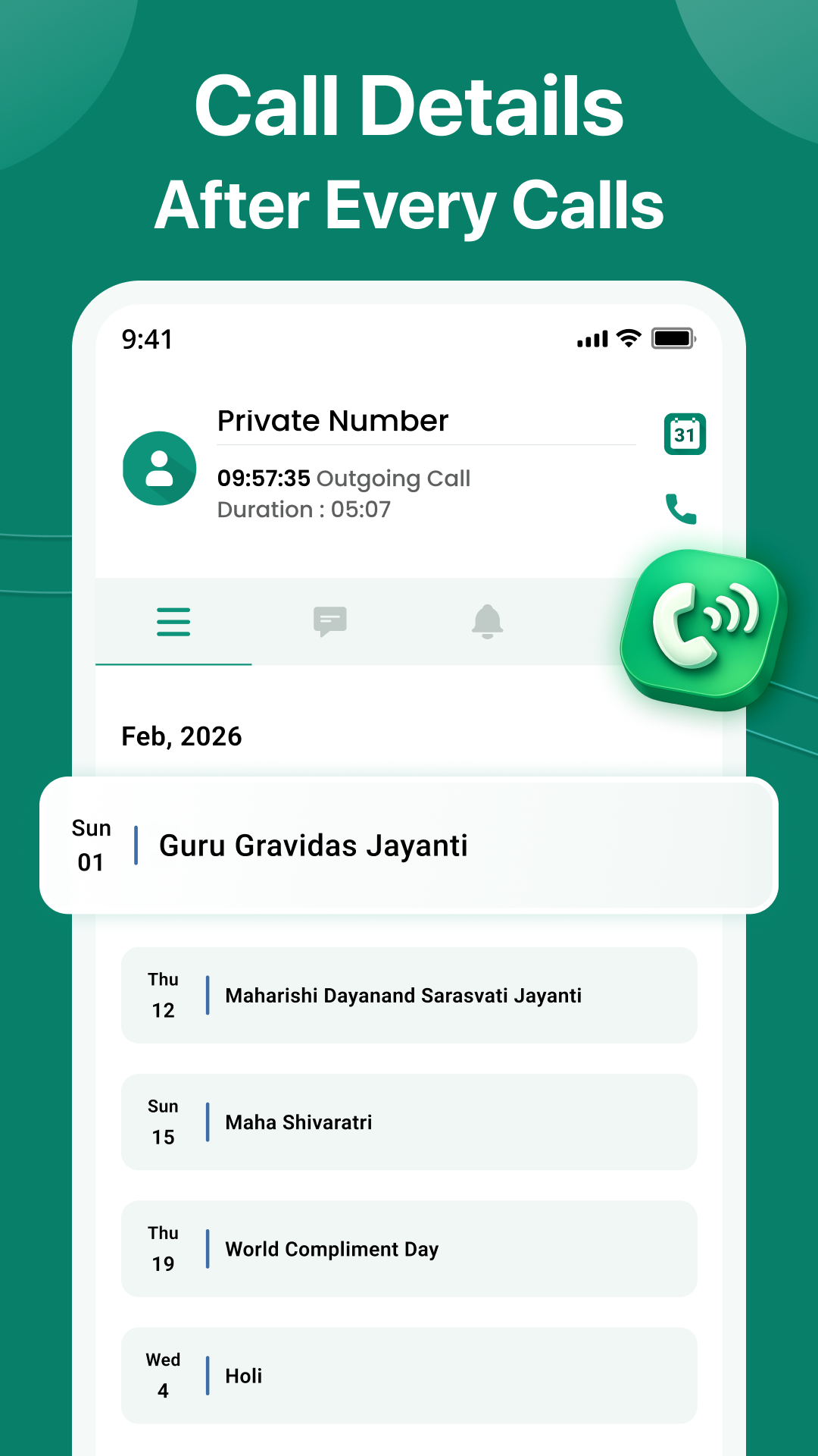 Calendar shows an aftercall enabling you to identify incoming calls as they happen so you can manage your tasks, set reminders immediately after the incoming call. This enables users to instantly keep track of events and dates just after calls.