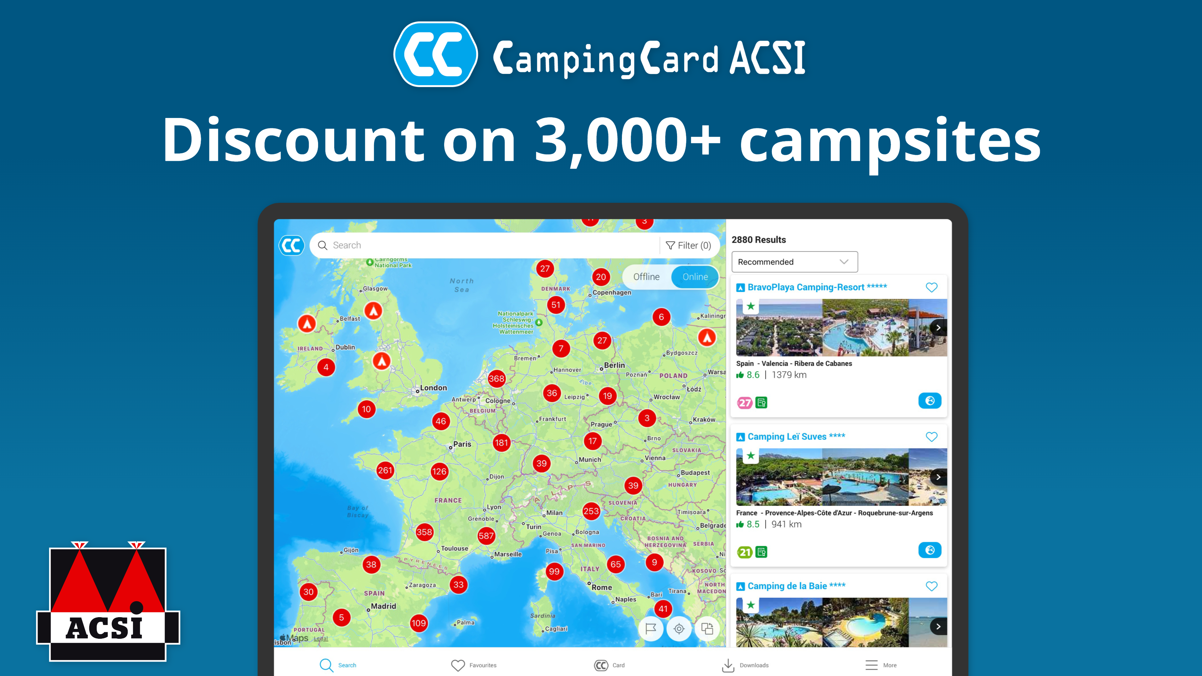 Do you want to camp affordably in the low season? With the CampingCard ACSI discount card, you can save up to 60% on your overnight stay thanks to fixed low rates. You can stay overnight for a rate of 13, 15, 17, 19, 21, 23, 25, or 27 euros per night. And (grand)children (up to 3 children up to 5 years old) stay for free at more than 400 campsites. No surprises—just affordable camping. And the best part? You can purchase the digital CampingCard ACSI discount card directly in the app, allowing you to enjoy the benefits anywhere and anytime. Whether you have a tent, trailer tent, caravan, or motorhome, the app makes it easy to find campsites that meet your preferences. For motorhome travelers, the app includes more than 9,000 motorhome pitches. Already have a paper CampingCard ACSI discount card? Then you can use the app to find participating campsites or suitable motorhome pitches. With the CampingCard ACSI app, you can search among 150+ facilities such as a swimming pool, WiFi, pet-friendly options, playgrounds, seaside locations, wellness facilities, and more to find the campsite that best suits your holiday needs. You can use the app to book directly or save your favorite campsites for later booking. You can find campsites throughout Europe in the CampingCard ACSI app. Discover campsites in countries such as: • France • Italy • Croatia • Netherlands • Austria • Spain • Germany • United Kingdom Perfect for motorhome travelers Do you regularly travel by motorhome? The campsite information is expanded with details on more than 9,000 motorhome pitches, all inspected by real motorhome travelers. Additionally, you can use the purchased information on three devices simultaneously, ensuring you always have access to your data. Offline use Once you’ve downloaded the app, you can also use it offline. This is especially useful when you’re on the road or have limited internet access. You can use the app on three devices simultaneously. Camping reviews Curious about other campers' experiences? In the app, you can read reviews from fellow campers. You can also write your own detailed review. Over 60 years of experience All campsites in the CampingCard ACSI app are inspected annually by ACSI. ACSI has over 60 years of experience in the camping sector. The app collects technical data that developers can use to improve the app.