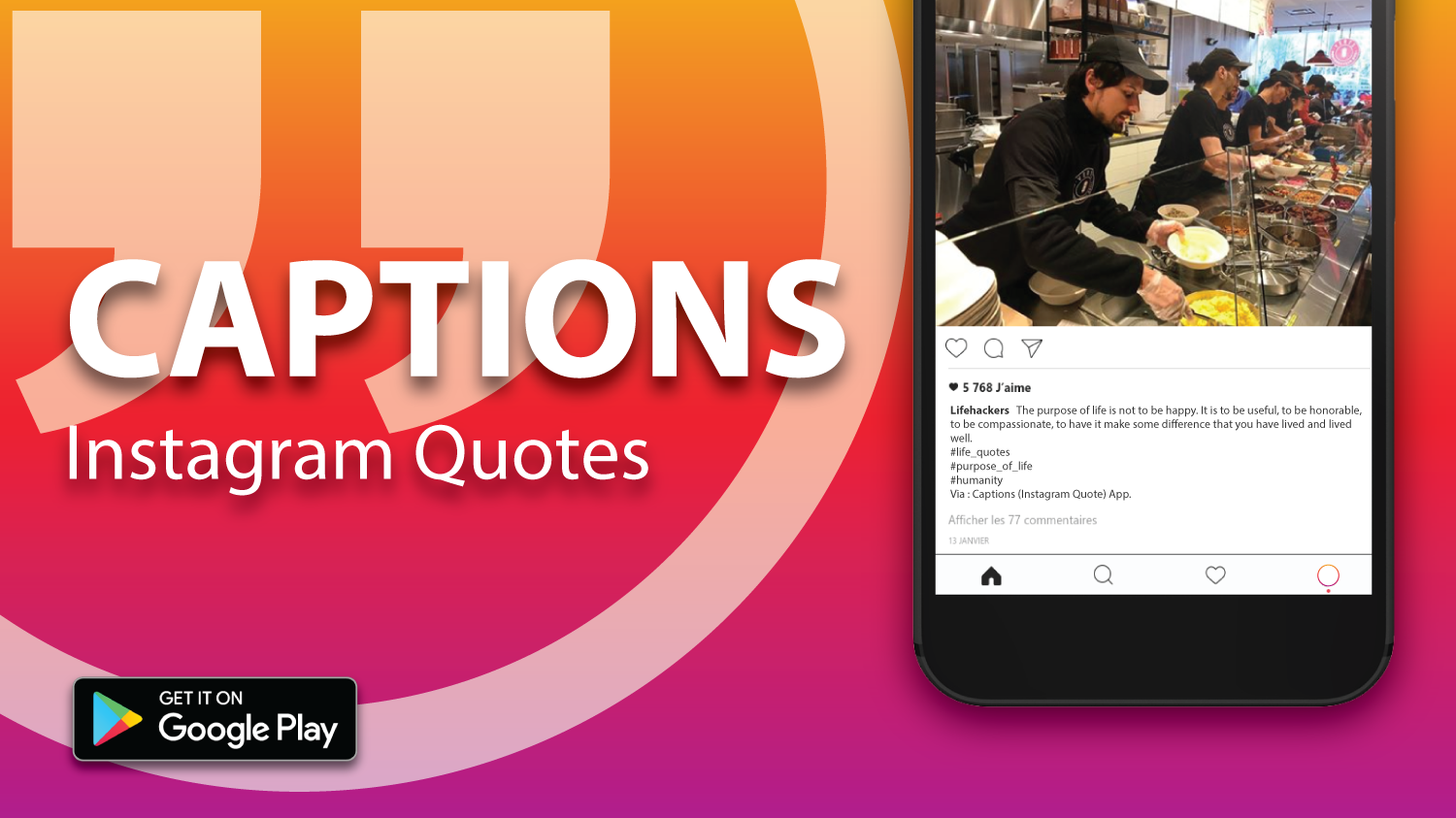 Captions (Instagram Quotes) (Package Name: com.lifehackers.insta.quotes) is developed by Lifehackers Inc. and the latest version of Captions (Instagram Quotes) 1.0 was updated on January 28, 2017. Captions (Instagram Quotes) is in the category of Social. You can check all apps from the developer of Captions (Instagram Quotes). Currently this app is for free. This app can be downloaded on Android 4.0.3+ on APKFab or Google Play. All APK/XAPK files on APKFab.com are original and 100% safe with fast download.