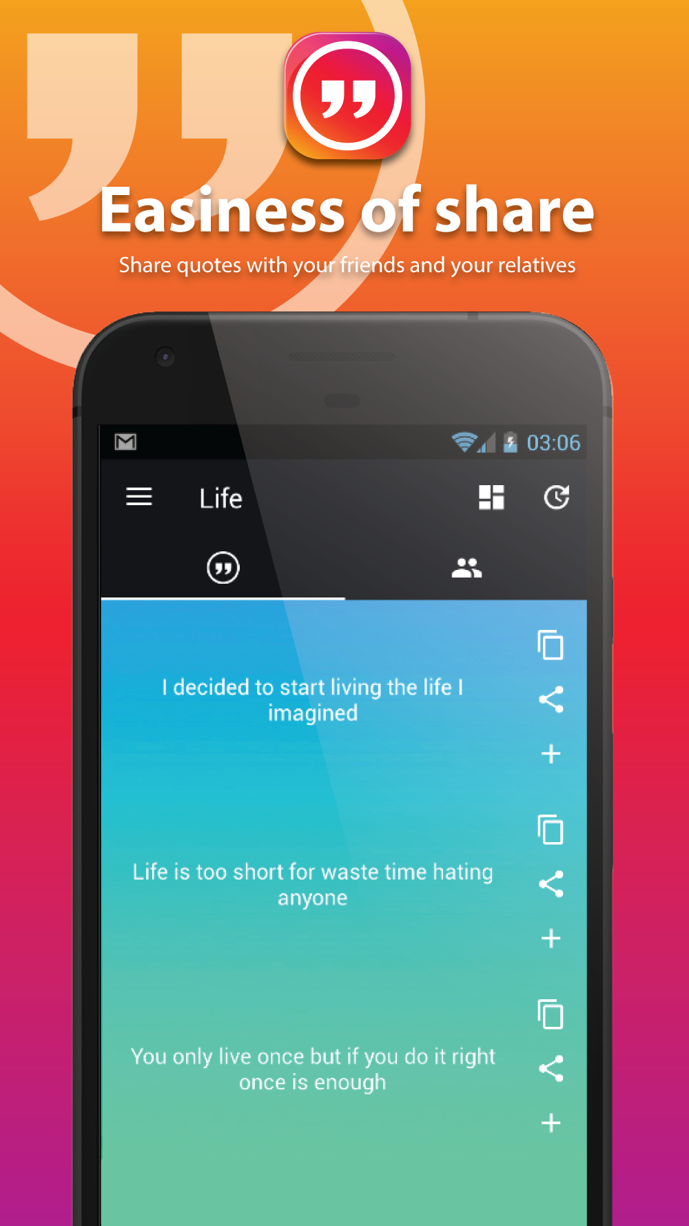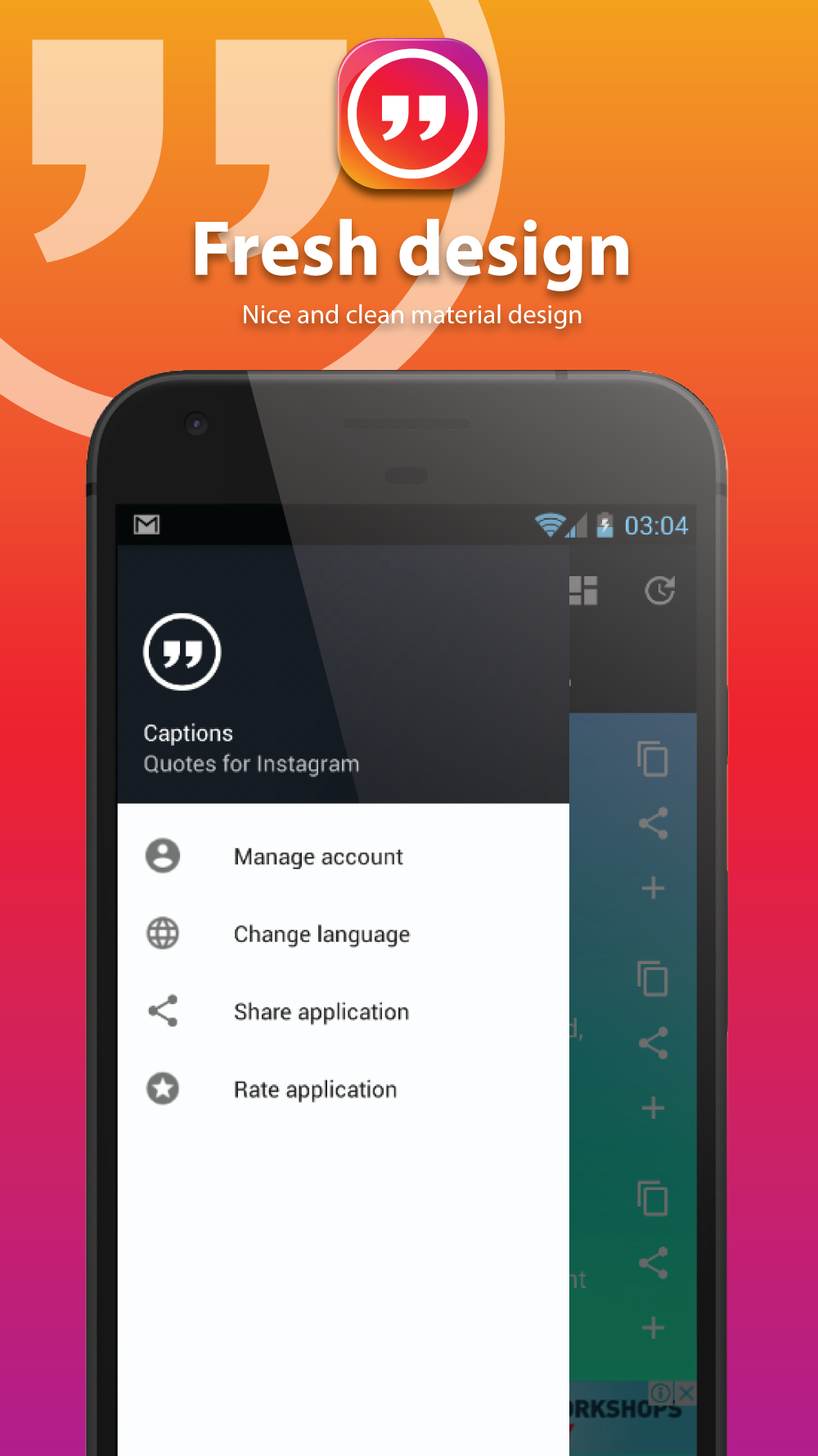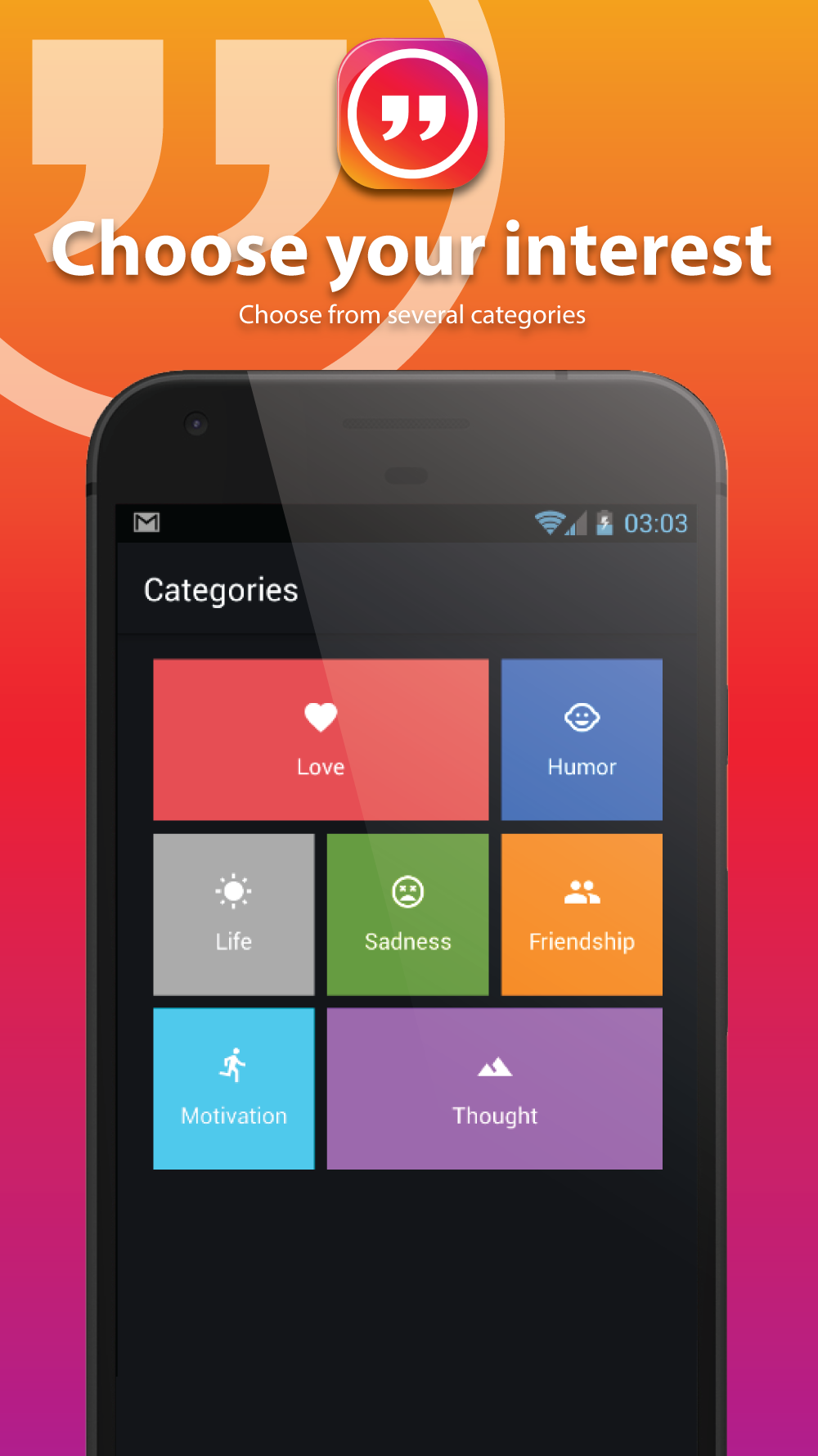 Inspirational Quotes and Sayings for your Instagram Photos Captions. In fact, you can use those quotes and sayings for all of your social media captions / status like Whatsapp, Facebook .. Quotes for all your feelings, with this app you will always find the right words. With the help of this application, have the thoughtful Instagram, Facebook & Whatsapp Profile between your friends. Save your favourite quotes & cites and touch the hearts and souls of your friends. Thousands of great sayings, quotes and motivational captions / profile status. Quotes & sayings categories: • Love quotes for Instagram. • Humor sayings. • Life quotes for Facebook Messenger. • Sadness quotes. • Friendship quotes. • Interesting thoughts for Instagram Photos captions. • Motivational quotes. • Get famous with your wise captions with us. You can share any quote you liked with your friends. Thank you for all your support! We welcome your feedback and suggestions and if you like this app, please rate it 5 stars! ★★★★★
