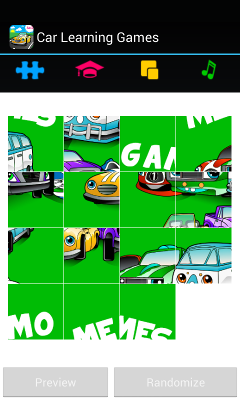 Hallo driver boy!!! Car games for little kids is fun-filled and educational activity app for junior car lovers. So put on your seat belt and strap and enjoy this super fun addicting games without car crash. Your little mechanic will learn vehicle names, colors, shapes, letters, horn beep, rev engines, car sounds and noises. This cool car games for girls and boys features two educational games and two skill games. So its not a racing game but your children will drive for fun with slide puzzles and memo games. New vehicles will be added constantly to this fun kindergarten learning games! List of fun activity games: -MINI CARS PUZZLES -FUN LEARNING NAMES OF CAR IN ENGLISH LANGUAGE -CAR FAMILY TRIP WITH MEMORY FLASHCARDS FOR TODDLERS -COOL CAR TONES 1.BRAIN & PUZZLE GAME WITH BEAUTIFUL CARTOON PICTURES Is for preschoolers from 3yr old. Its great for development of skills and abilities of children. When you finish one of the educational car puzzles you will get a star and you can try different one. This cool game with beautiful cartoon pictures is also known as slide, sliding block, sliding tile, the 15, fifteen or the magic puzzle square. 2.TODDLER VOCABULARY, LANGUAGE AND RECOGNITION SKILL Its great early learning for baby, toddlers and preschoolers. With child friendly dictationery your little mechanic can learn first abc words. Include english words: race car, van, off road car, muscle car, cabrio and formula. New car names like truck, sports car, buggy and minivans will be added constantly to this Car games for little kids. 3.FUN MATCH FLASHCARDS Car match games especially for 3 years old child. But whole family can have fun ride with this memo games. Include vehicle matching game, kindergarten educational games shapes cards and colours. This toddler memory games also encourages: -Train memory. -Color recognition. -Eye coordination. -Early math skills. -Recognition skills. 4.COOL CAR TONES In car games for kids under 5 years can explore the fun world full of car sounds and noises. When you tap the sound card you can hear interactive funky car sounds. Features motor skills for 3 year old and motor skills games for kindergarten. New noises like horn beep, car alarm and car horns will be added constantly to this little mechanic memory games. Car games for little kids works perfectly on tablets and mobile phones. If you like the game please press +1 button. This game is totally free so enjoy it!!