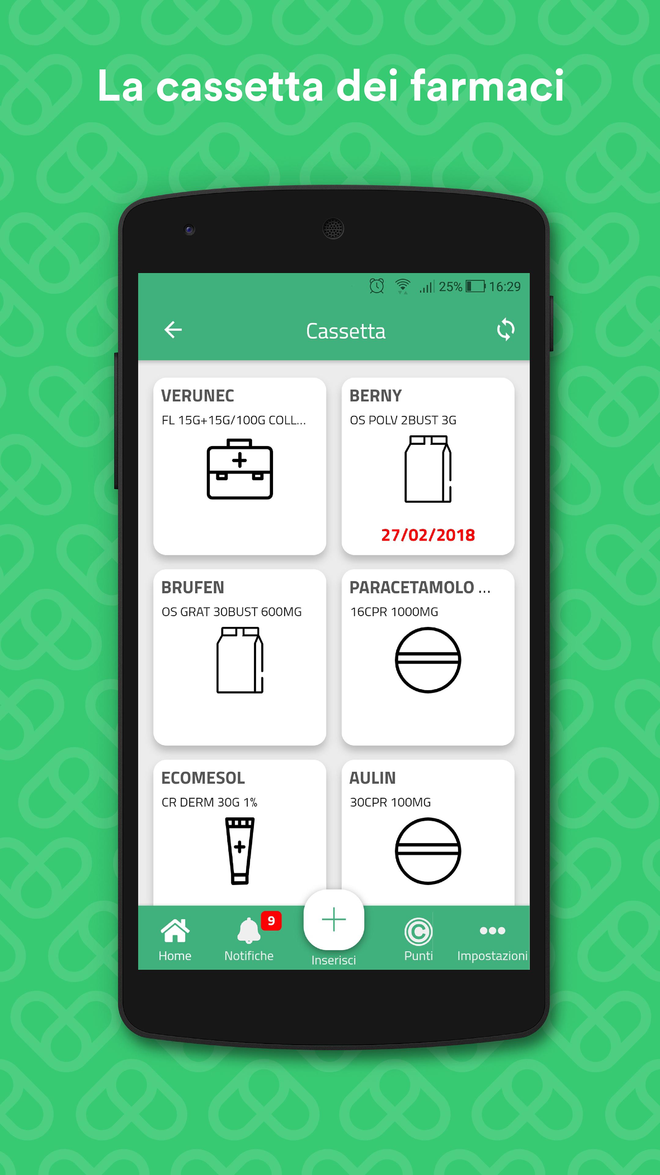 Carepy, considered among the best medical apps in circulation, helps you to better manage your health and to take care of your loved ones in a simple and efficient way. The application indicates when taking medicines and making measurements, when going to a medical appointment or returning to the pharmacy, provides personalized advice and promotions and gives the user the ability to stay constantly updated on health news. Carepy assures you a direct channel with the pharmacist and the doctor, who can support you at any time. MAIN FEATURES - Product Box: allows you to monitor stocks and deadlines of drugs, parapharmaceuticals and medical devices in your home. - Activities: a simple and intuitive system reminds you to take medication and make measurements at the scheduled times; the app also allows the management of the therapies of non self-sufficient people you care for (like the elderly in the family). - Team: a virtuous network is created between pharmacist, doctor, patient and family, to keep under control the health status, the availability of the products and the correct management of the therapies and measurements, all in a discrete and efficient way. -News: users can choose to receive health and wellness news by selecting them among the categories they are interested in. - Premium system: the more you use the app, the better you care, and the more you receive points to spend on promotional vouchers at your trusted pharmacy. HOW DOES IT WORK With Carepy you can upload all the medical products present in your home in your virtual box, scanning the barcode with your mobile phone camera, or searching for them by name. So you can know at any time which products you already own, how many doses are left and when they expire. After a medical examination, you can easily follow the medical indications from the measurements to the therapies prescribed for you and your loved ones: Carepy will remind you every day through personalized notifications the assumptions (with time, dose and other indications), automatically updating the related products in the box and measurements to be made at home with the related medical devices (eg blood sugar, pressure, cholesterol, etc.) with the ability to transcribe the values in the app by creating an archive of their data. Your trusted pharmacist will stock the products you need and invite you to come back in time, your doctor will follow the course of treatment and will provide you with useful advice, while your family will share with you the management of the box, for a unprecedented cooperation. ARE YOU A PHARMACIST OR A DOCTOR? Discover Carepy Pharma and Carepy Med by visiting our website www.carepy.com. You will have the possibility to also associate patients without smartphones, and to send them notifications via SMS. Live better, every day.