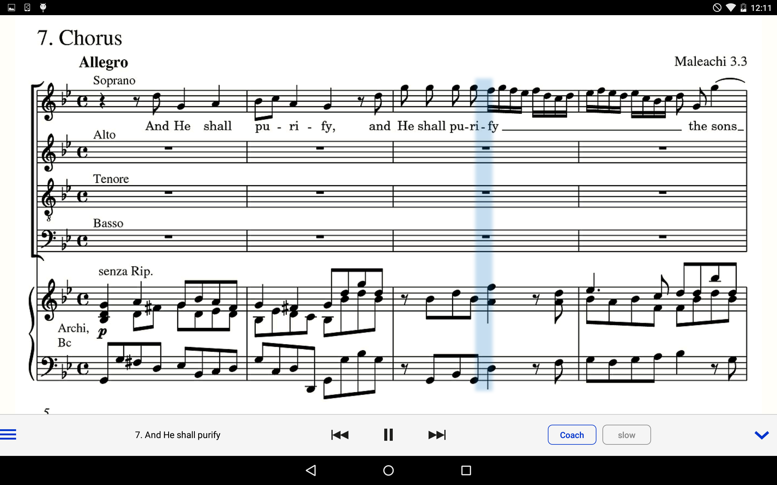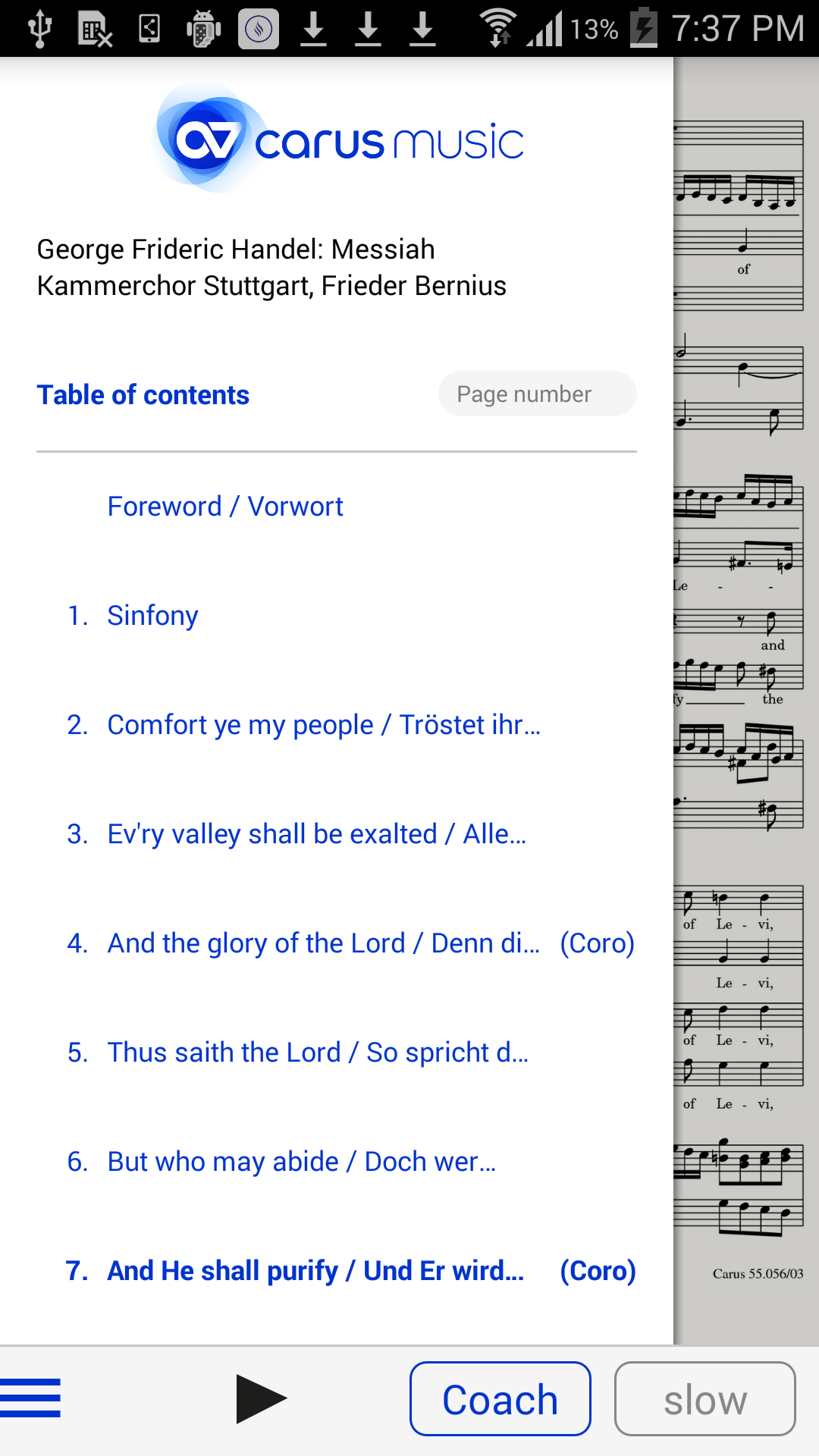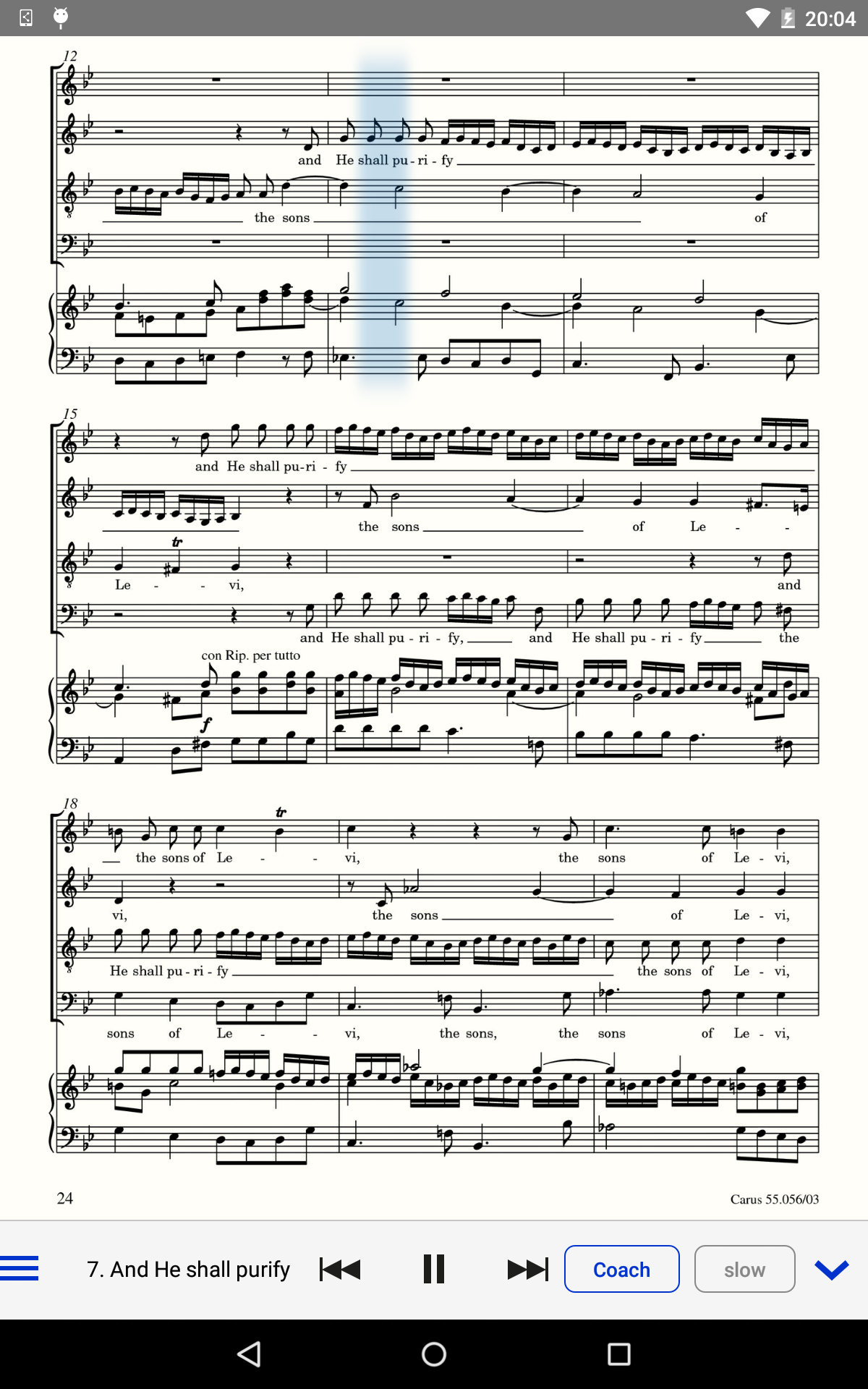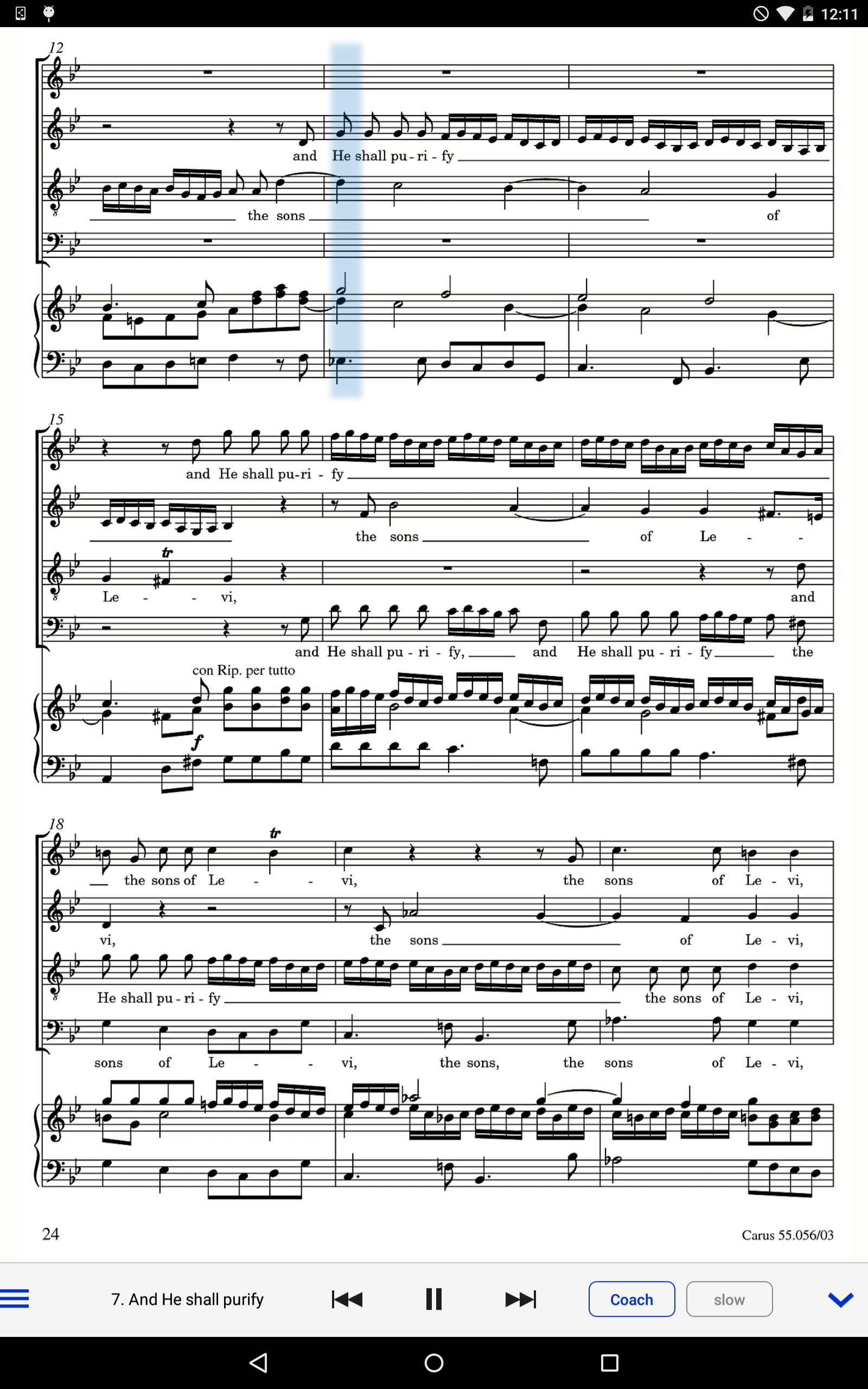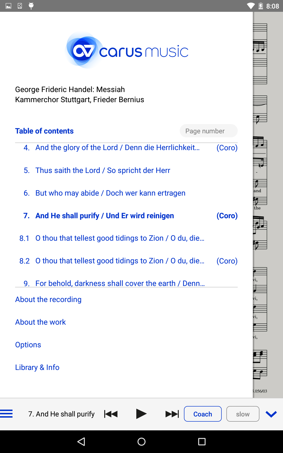 The app is based on carefully prepared Urtext music editions from Carus vocal scores synchronized with recordings by renowned interpreters. Every measure can be directly selected thanks to the intuitive navigation within each work, and the original recording starts exactly at this point. A marker that moves synchronously with the music simplifies the orientation. Turning pages occurs either automatically or manually. A special feature offered by carus music is a coach to help you learn the choral part. If the coach is activated, your own part is clearly emphasized and you can practice with the recording of your part within the overall sound. The slow mode can be used for fast and difficult passages – from now on you decide on your learning pace. Learning your own part will thus become a special experience and singing will be even more fun!