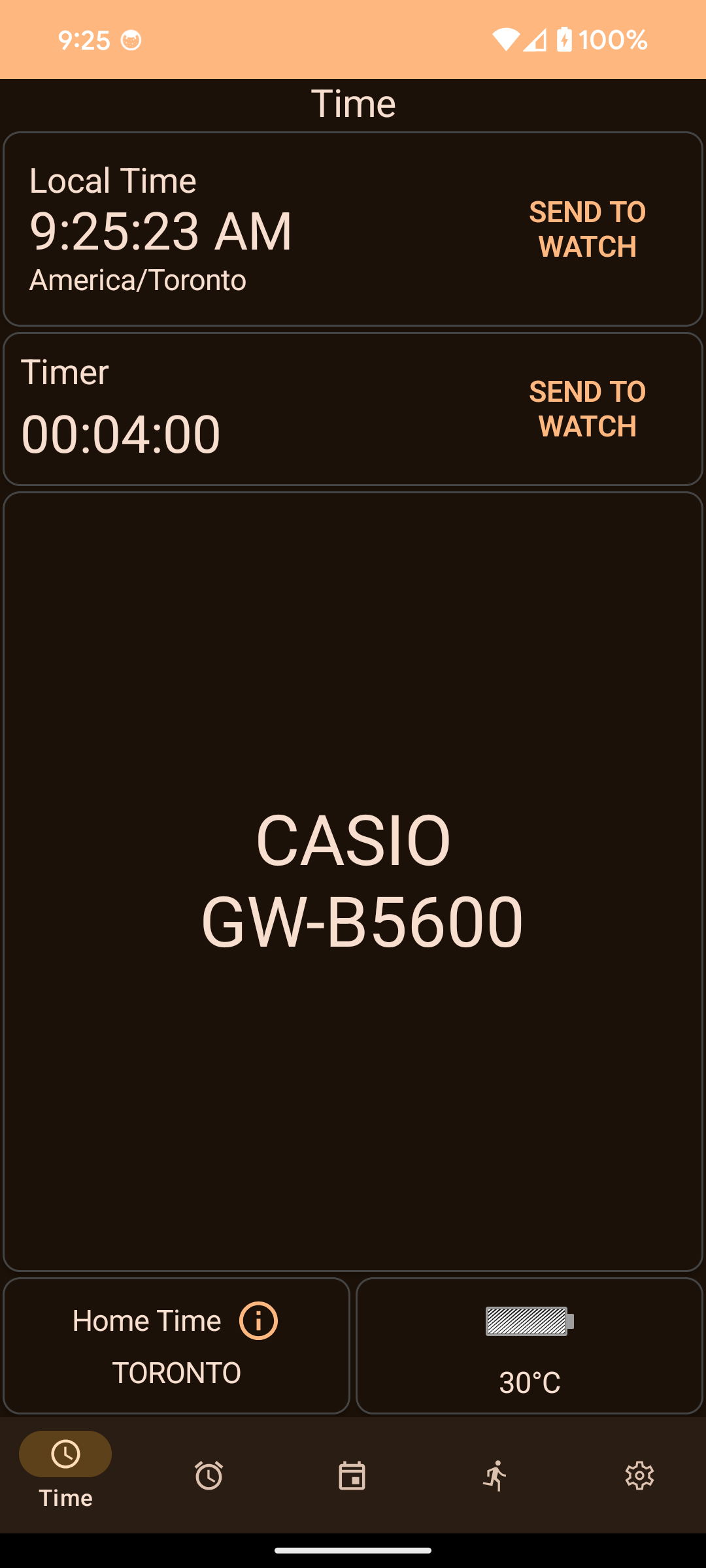 The local time can be set from the main screen by pressing the `Send to Watch` button next to the current time display. The app uses your current location to get the local lime. You can then set the watch time accordingly, without having to change your `World Time` selection on the watch.