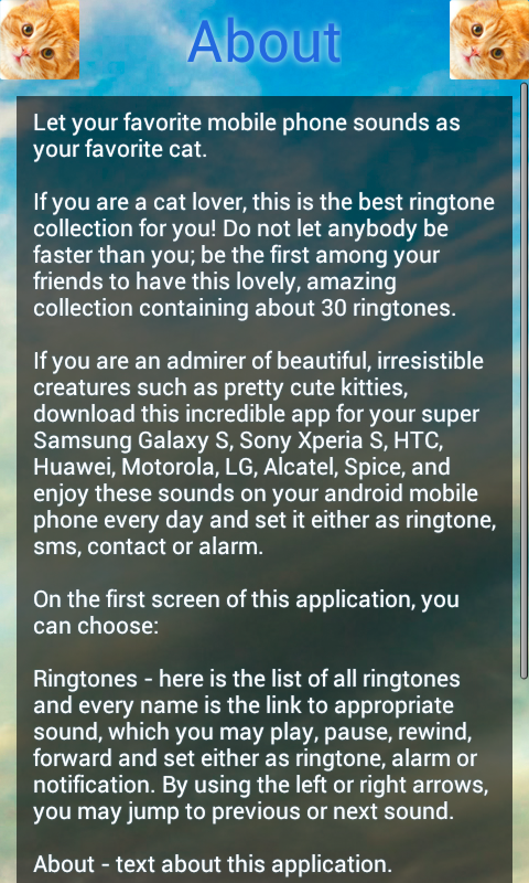 Let your favorite mobile phone sounds as your favorite cat. If you are a cat lover, this is the best ringtone collection for you! Do not let anybody be faster than you. Be the first among your friends to have this lovely, amazing collection containing about 30 ringtones. Using this sounds, you can have a lot of fun with your friends or your pets, cats and dogs. If you are an admirer of beautiful, irresistible creatures such as pretty cute kitties, download this incredible app for your super Samsung Galaxy S, Sony Xperia S, HTC, Huawei, Motorola, LG, Alcatel, Spice, and enjoy these sounds on your android mobile phone every day and set it either as ringtone, sms, contact or alarm. On the first screen of this application, you can choose: Ringtones - here is the list of all ringtones and every name is the link to appropriate sound, which you may play, pause, rewind, forward and set either as ringtone, alarm or notification. By using the left or right arrows, you may jump to previous or next sound. About - text about this application. Privacy Policy More Apps - from where you can search for other applications directly. In order to be free, this app may contains ads.