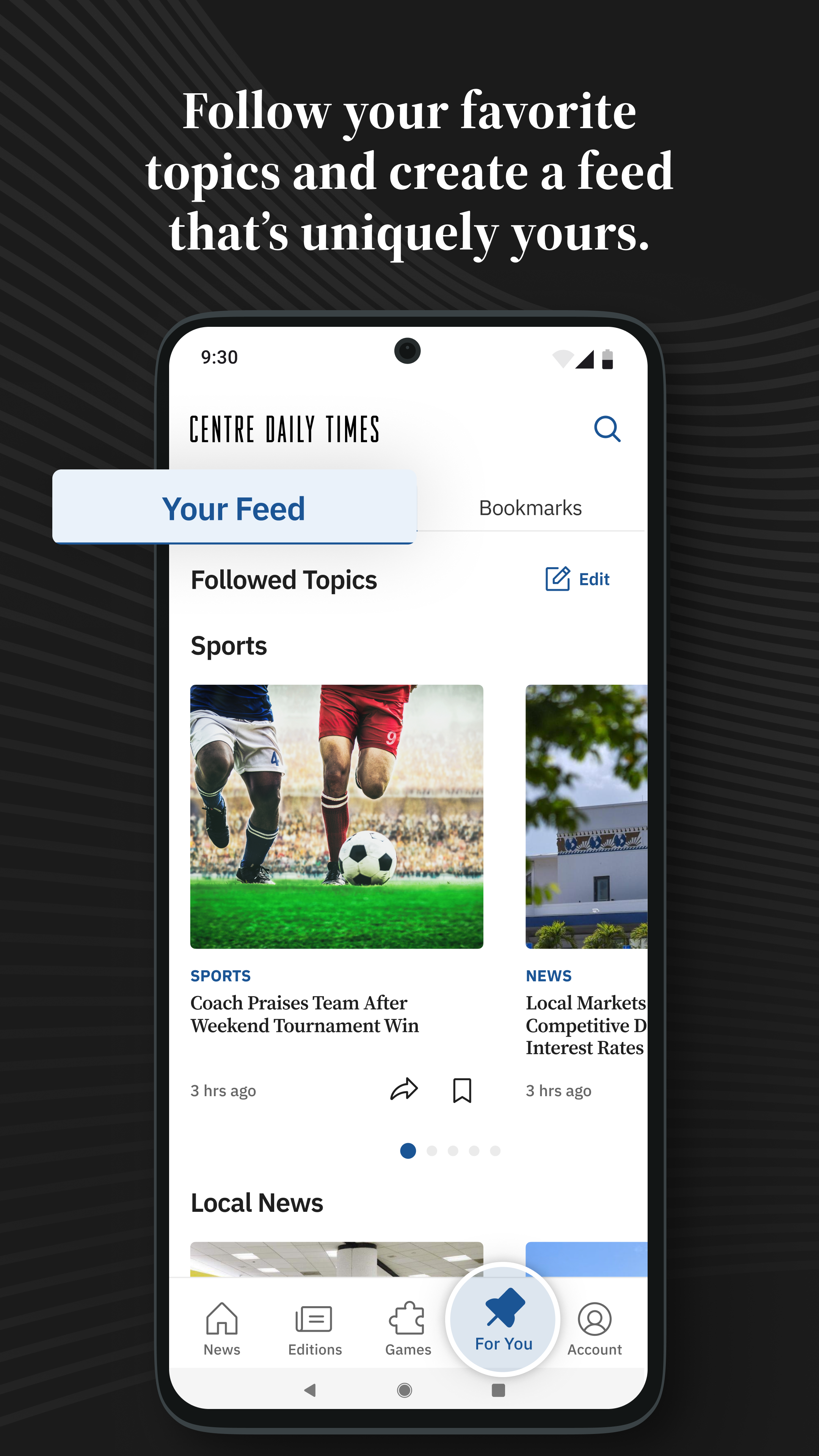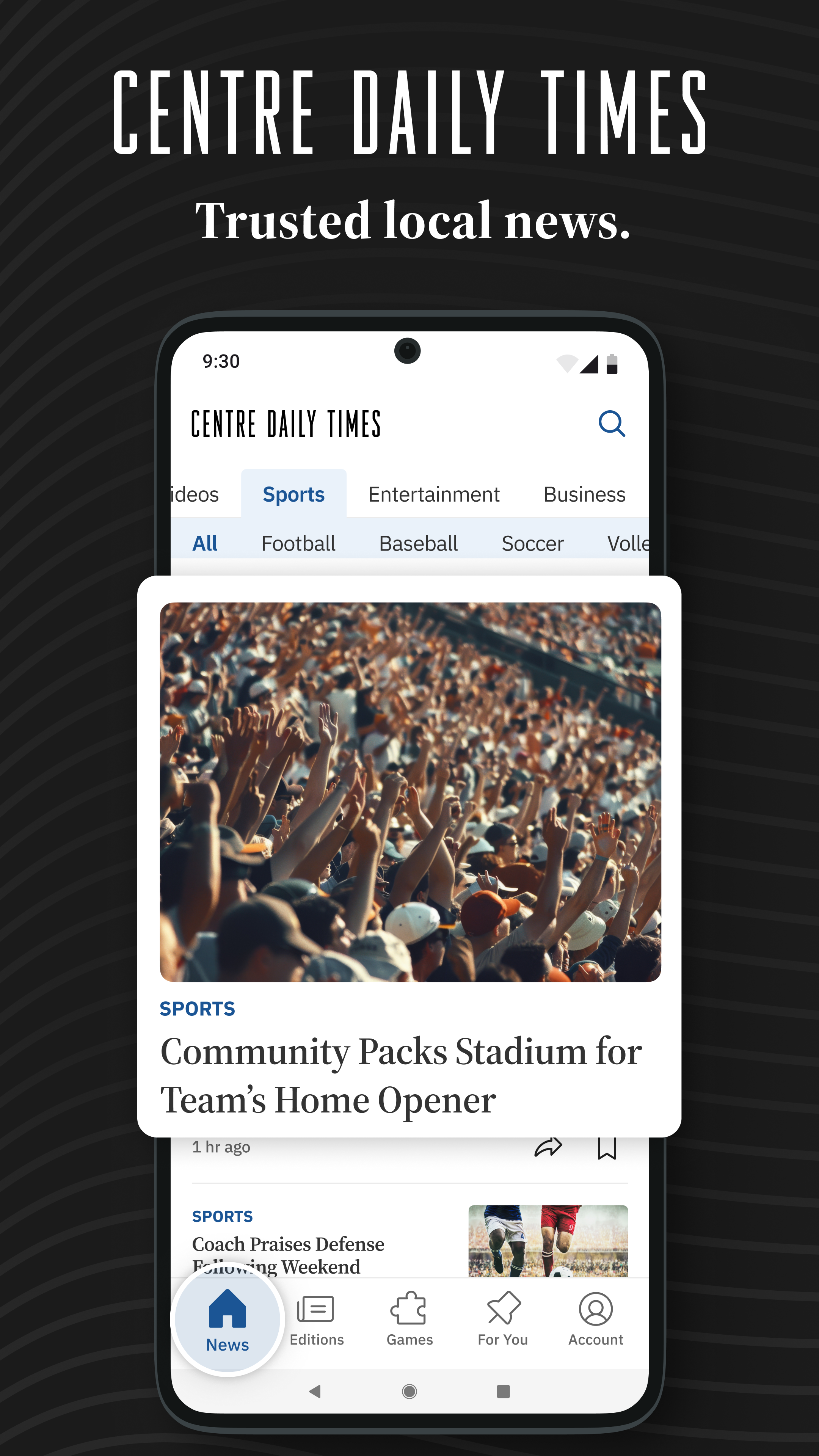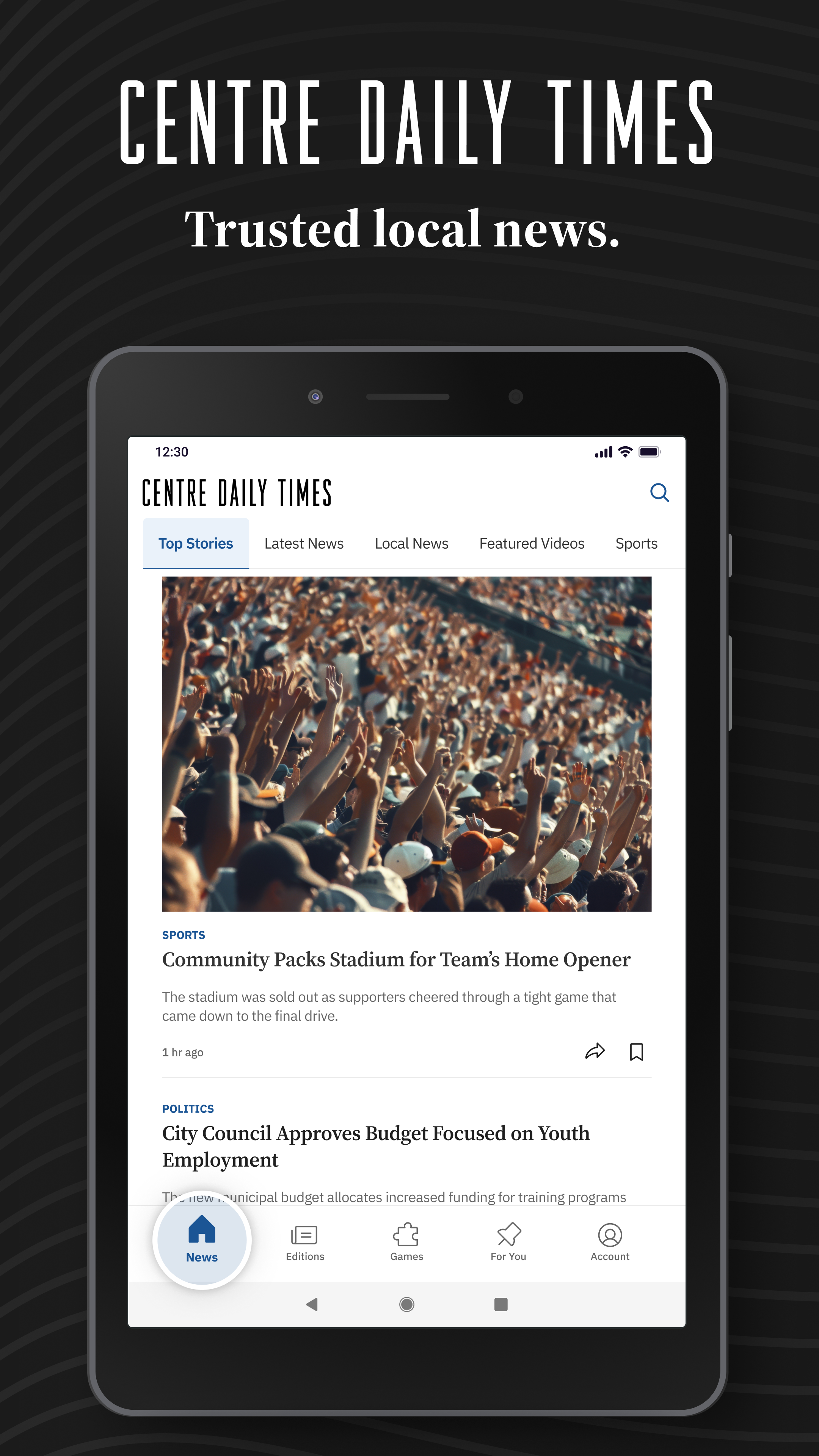 The Centre Daily Times newspaper app is faster and easier to use. Read or watch daily local news coverage, investigative reporting, national headline news, crime, sports, local business, and more. The Centre Daily Times is your trusted source for local, daily news and stories from State College, Bellefonte and Happy Valley Pennsylvania. LOCAL NEWS • Daily local news and stories from around the Happy Valley area. • AI-generated summaries on all articles reviewed by our newsroom. • The Centre Daily Times opinions, editorials and columns you love. • Edition, a digital destination for the latest news, features, and insights. Like the printed newspaper, it is intended to be a complete report of the day’s news compiled by our editors overnight. LIVE VIDEO • Watch live video of local news stories and national news coverage. • View stunning photos and videos of local news and community events. LOCAL SPORTS • Full coverage reporting on local, pro and college sports teams • Stay connected to your favorite teams and favorite sports writers. PERSONALIZATION • Stay informed on the topics and articles that matter to you. • Favorite topics to get personalized feeds. • Search for news articles, videos, games and more. • Bookmark news articles to read later. • Read articles your way with full support for dark mode and light mode. Other Features • Browse articles by category. • Share articles on Facebook, X (Twitter) or by email. • Comment on news articles. • Access and download previous issues of our newspaper. • Recharge and unwind with our puzzles and games. GET DAILY NEWS AND MORE WITH THE CENTRE DAILY TIMES NEWS APP Download our local newspaper app today to stay informed on local daily news, crime, sports, national headlines, and more. Read our Privacy policy here: https://mcclatchy.com/privacy-policy Read our Terms of Service here: https://www.centredaily.com/customer-service/terms-of-service/text-only/ For California Residents: To learn more about managing your sharing preferences and Do Not Sell My Info rights visit https://www.mcclatchy.com/ccpa-pp