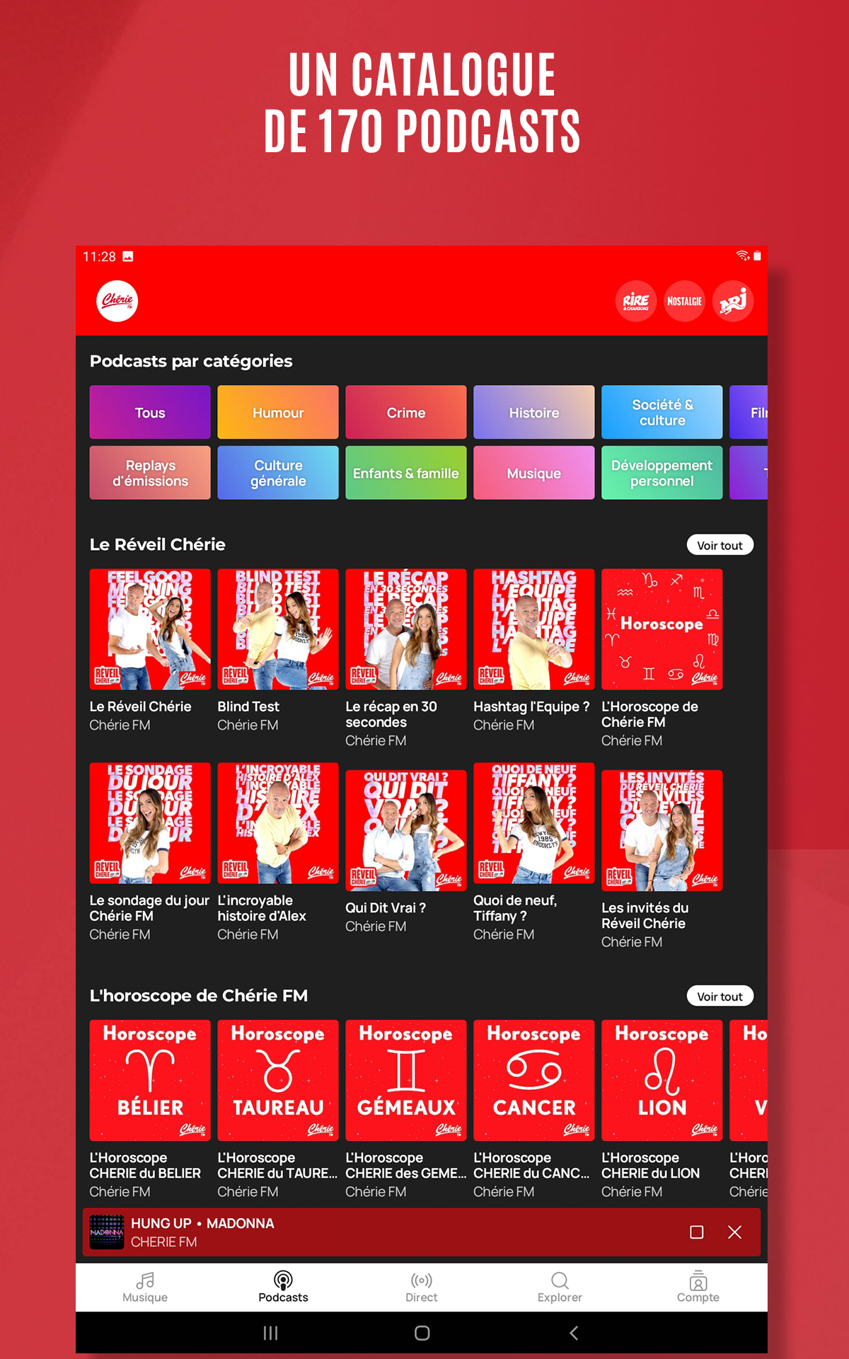 Designed to offer you an optimal listening and browsing experience, our app lets you enjoy unlimited, free access to 250 radio stations and nearly 170 podcasts, including original and exclusive creations, wherever you are.
