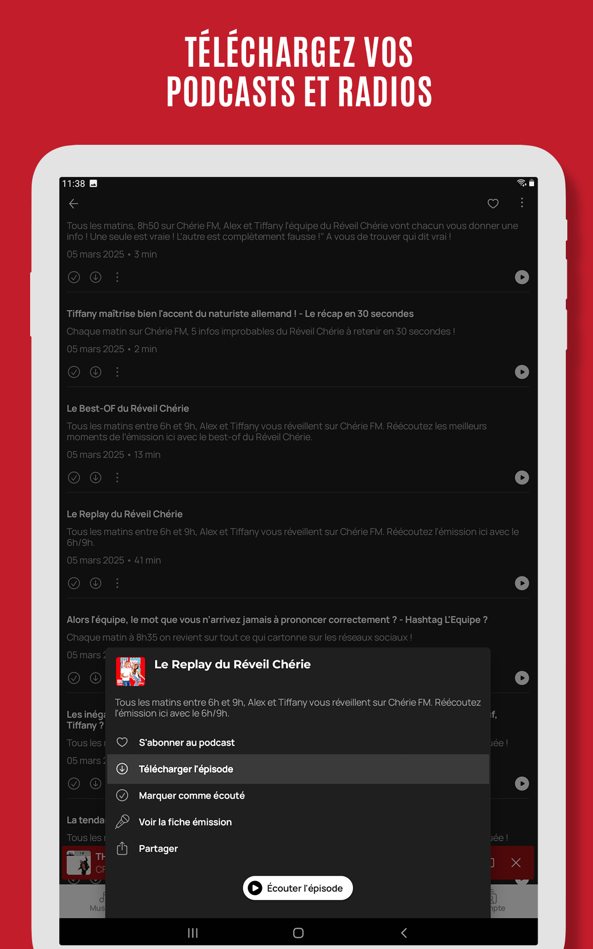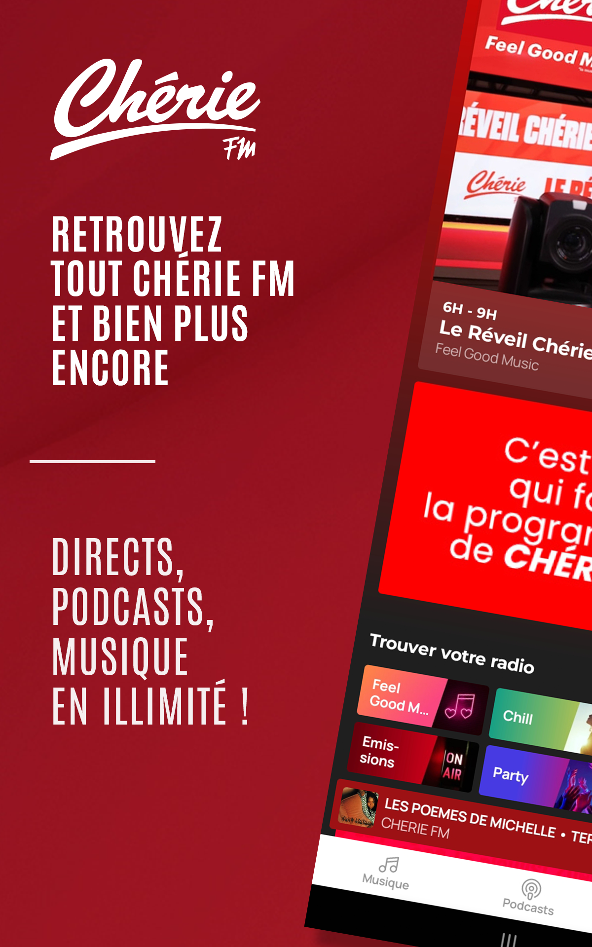 The Chérie FM app uses streaming technology to broadcast radio stations and podcasts. For smooth listening, please ensure your internet connection (3G/4G/5G/Wi-Fi) is stable and has a minimum download speed of 128 kbps. Unstable connections may cause audio interruptions.