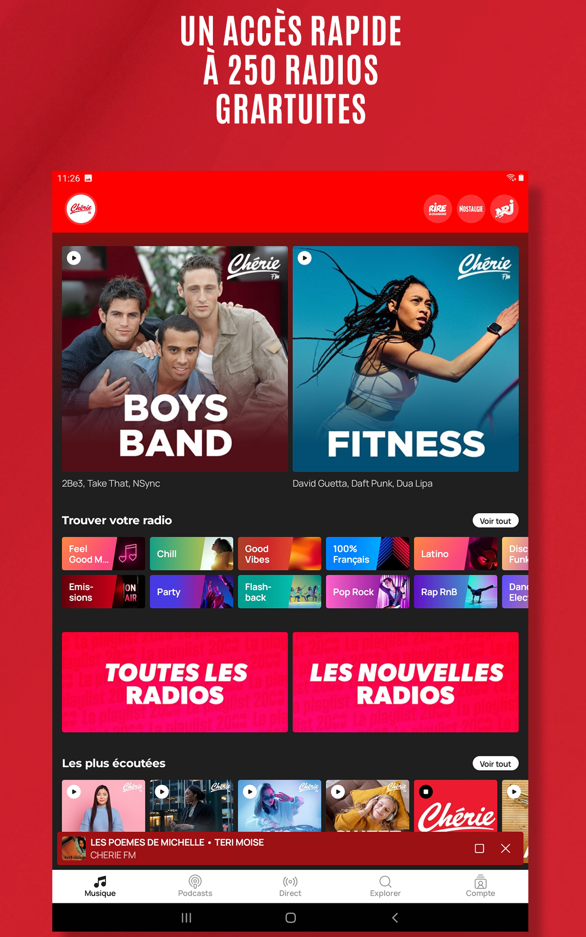 Chérie FM is part of the NRJ Group, which means you also have access to NRJ, Nostalgie, and Rire & Chansons directly from the app! Easily switch between the worlds of these four radio stations with a single click.
