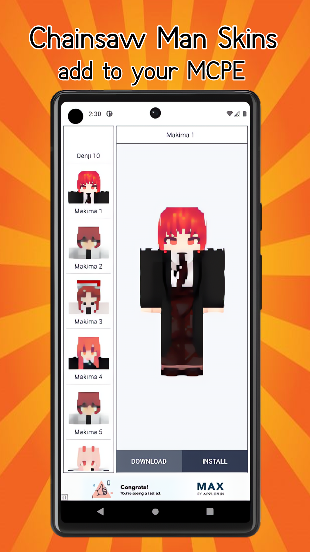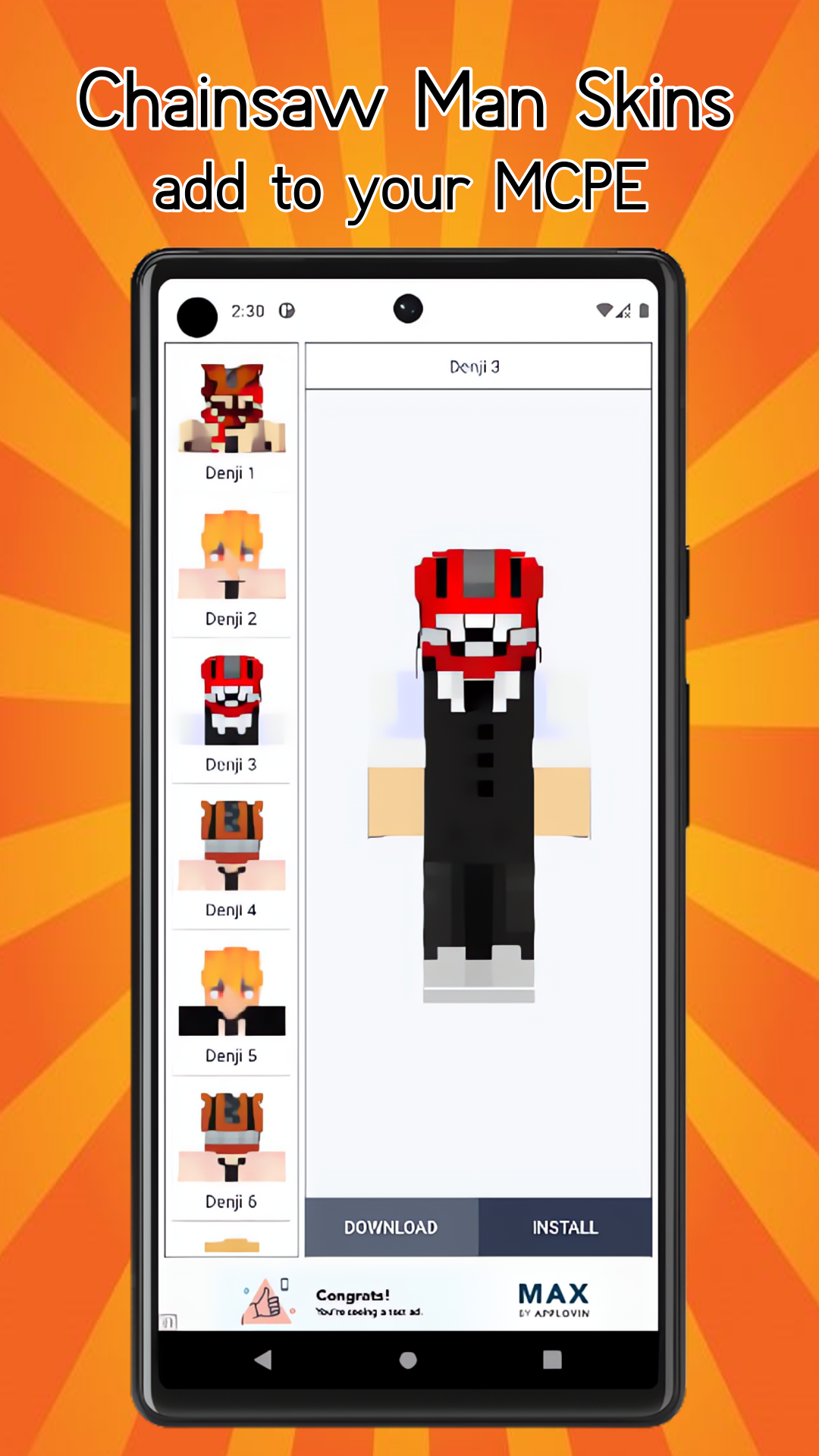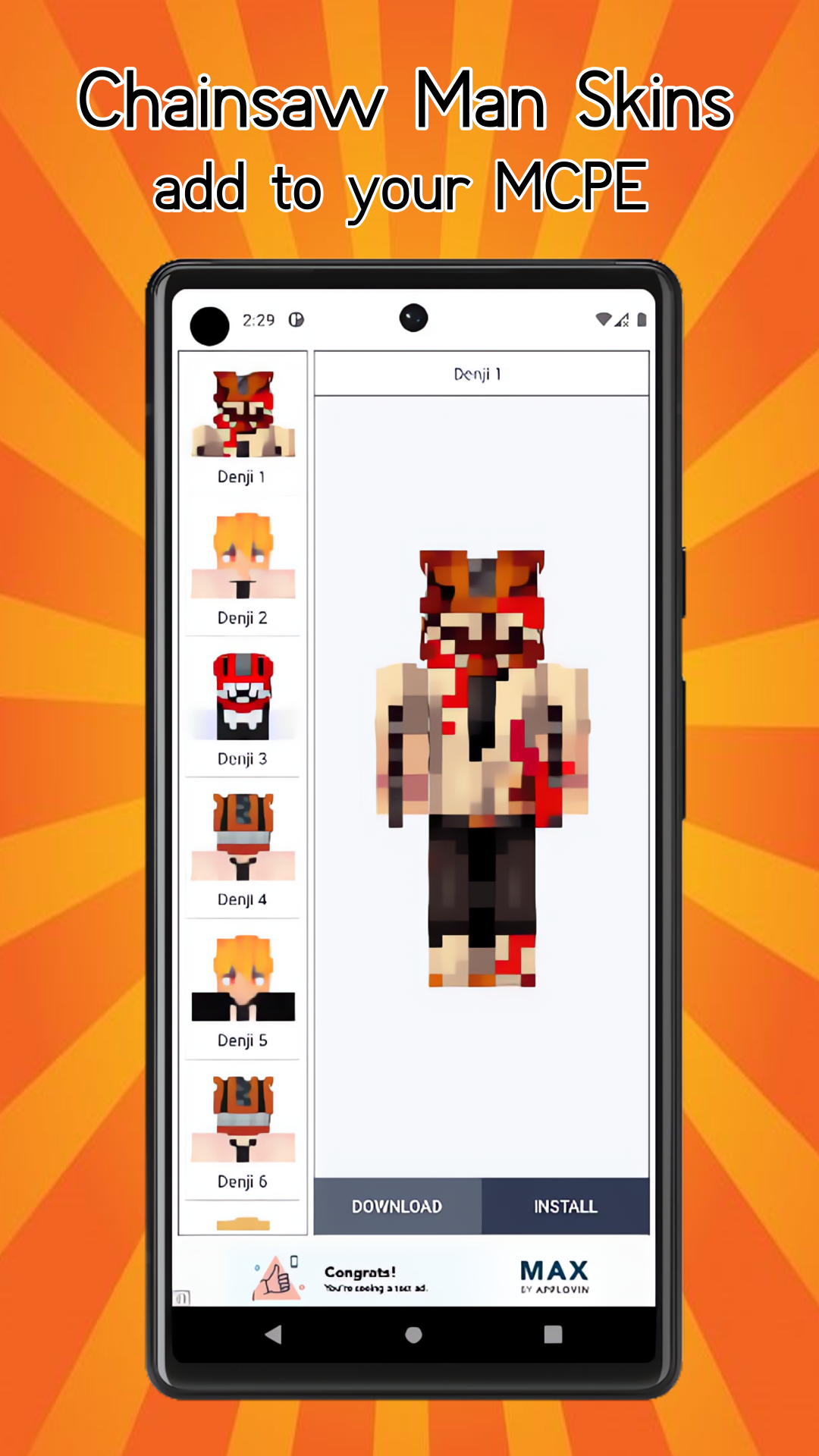 Our skinpack will add a lot of bright attractive images that you can use every day for free. In the skinpack there are skins that will appeal to every child. With the installation of Chainsaw Man Skins for MCPE (Pocket Edition) gameplay will become much more interesting and you will not be bored. A large number of skins and easy installation into the game will allow you to become the most interesting and popular player on the server.