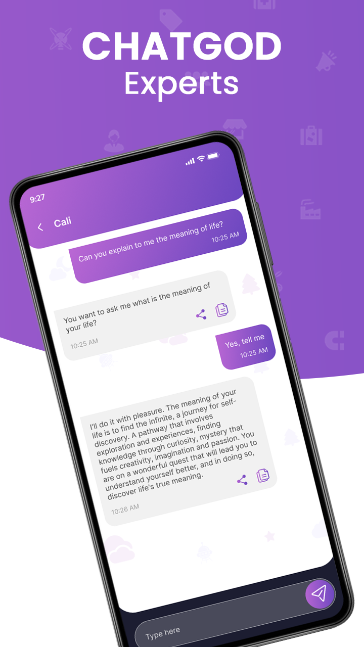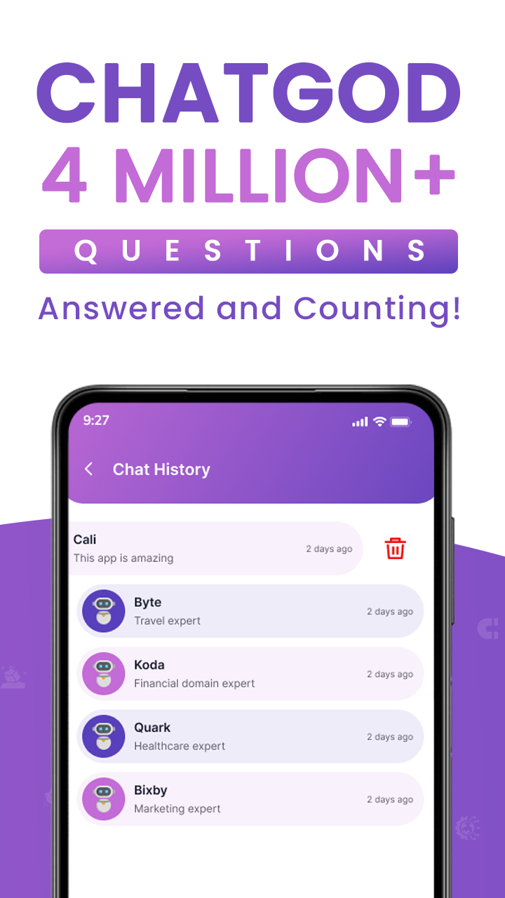 ChatGod is an advanced online chatbot that uses Chat GPT AI technology to answer all your questions instantly. Whether you're looking for information on a specific topic or just want to have a casual conversation, ChatGod is here to assist. Our AI model uses the same AI technology, GPT-3, which is been used by chat GPT. But ChatGod isn't just a chatbot - it's also a content generator capable of creating engaging text based on input. So if you need help to come up with ideas for your next project, ChatGod can help. And with the ability to talk with AI and search images based on your input, ChatGod is the ultimate AI companion. Here are some examples of how the major features of ChatGod, "Talk with AI" and "Image Generated by AI," can help users: Talk with AI: The "Talk with AI" feature allows users to converse with ChatGod using natural language. This can be helpful in a variety of ways: Getting answers to any questions: If you have a question that you need an answer to, you can ask ChatGod, and it will provide you with a response based on its knowledge and understanding of the topic; following are two examples that there can be many more: Writing copies: If you want to write an Email, Facebook and Google Ads, small blog, Quora answer, etc., you can use the "Talk with AI" feature. Having a casual conversation: If you just want to have a casual conversation, you can use the "Talk with AI" feature to engage in small talk or discuss a particular topic. Image Generated by AI: The "Image Generated by AI" feature allows users to search for images based on their input. This can be helpful in a variety of ways. Following are two examples there can be many more: Finding images for a project: If you're working on a project and need any images to include, you can use the "Image Generated by AI" feature to search for relevant images. Inspiring creativity: If you're feeling stuck and need some inspiration, you can use the "Image Generated by AI" feature to search for images that spark your creativity. But that's not all - ChatGod has a team of domain experts to assist you with specific queries. Meet GodBot, the expert of all domains, as well as domain experts in legal, agriculture, travel, education, human resources, and more. With over 45+ fields covered, ChatGod has you covered no matter what you need. Here are a few examples of how these chatbots could help: GodBot: If you have a general question that doesn't fit into any specific domain, GodBot is here to help. For example, you could ask GodBot about the history of a particular event or for advice on a personal problem. Legal domain expert: If you have a legal question or need assistance with a legal matter, the legal domain expert can help. For example, you could ask about the laws governing a particular type of contract or for advice on a legal dispute. Travel domain expert: If you have a question about travel or need advice on planning a trip, the travel domain expert can help. For example, ask about the best places to visit in a particular city, or for tips on finding affordable flights and accommodations. Education domain expert: If you have a question about education or need advice on choosing a school or program, the education domain expert can assist. For example, ask about the best schools for a particular subject or for tips on applying to college. Human resources domain expert: If you have a question about human resources or need advice on managing a team, the human resources domain expert can help. For example, ask about the best practices for hiring and training employees or for tips on resolving conflicts within a team. So whether you're looking for information on a specific topic or want to have a casual conversation, ChatGod is here to assist. Download ChatGod now and experience the power of AI and domain expertise at your fingertips.