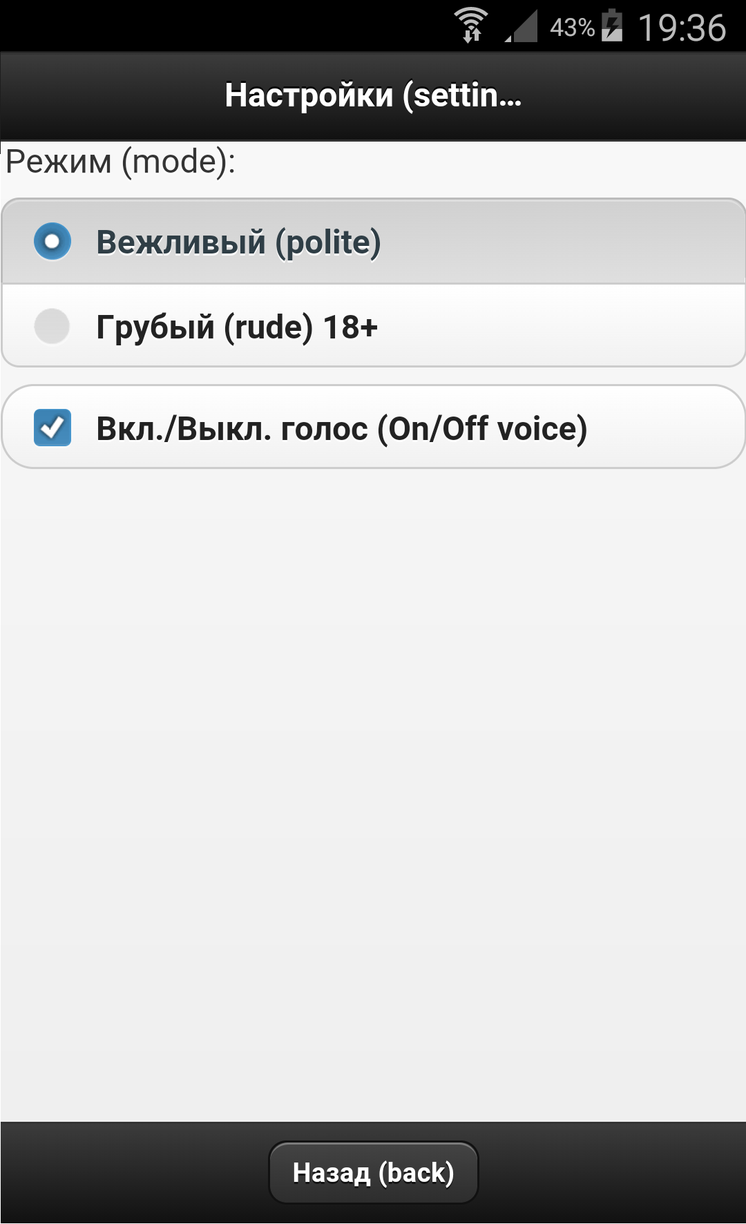 chatbot mode selection (modes: polite without foul language, rude and love).