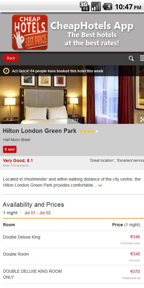If you are looking for a cheap hotel but do not want to sacrifice quality and time, this is your app. In just a few seconds locates all the cheap hotels in the area you choose with the best price. Deals last minute (last minute hotel offer) hotels in Andalusia (Sevilla, Córdoba, Málaga, Cádiz, Huelva, Almería and hotels in Granada), Valencia, Madrid, Barcelona, Andorra, San Sebastián, Cataluña, Las Palmas, Canary Islands, Mallorca, Ibiza and many other destinations.