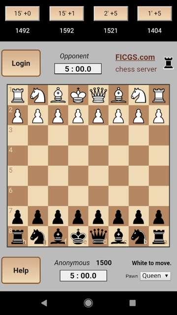 Play rated chess games online, learn & improve your rating - FICGS - No ads, totally free. - Play chess games instantly. - Stay anonymous or connect to FICGS. - Time control : 1, 2, 3, 5 or 15 minutes. - Increment : 0, 1, 2, 3, 5 or 10 seconds. - Real time countdown in tenths of a second. - Graphical interface, drag and drop pieces. - You can choose a 2D or 3D chess board. - Bullet, lightning, blitz and rapid games. - You can copy each ended game in PGN format. - Chess rating scale looks like FIDE ratings. Just click a game offer button, time control is specified, in example 5 minutes + 3 seconds per move. To move pieces on a phone, just touch it and keep your finger on it. When the square becomes yellow, you can move it. Warning: This application uses advanced technologies. The 3D version needs WebGL, just exit and restart if it does not work. Please update your Andoid system. To login or to play correspondence chess, you can also find the FICGS applications by clicking FICGS.com If you like this app, please give it five stars. This chess application may be not dedicated to all devices, please send an email to webmaster at FICGS.com if you encounter any problem, the author will try to fix it as soon as possible. FICGS is also on Facebook, you can like the pages and enter the groups to discuss your favourite games: Chess, Go (weiqi), Big Chess... You can find all FICGS chess apps at https://ficgs.com/ The only informations that are stored on the device are your chess rating and options like color and 3D. Note: There is no gambling at FICGS, there is no chancy game with entry fee & money prizes. It is not possible to entry a tournament with an entry fee via the applications. Free_Internet_Correspondence_Games_Server http://www.ficgs.com/chess-online_gbr.html