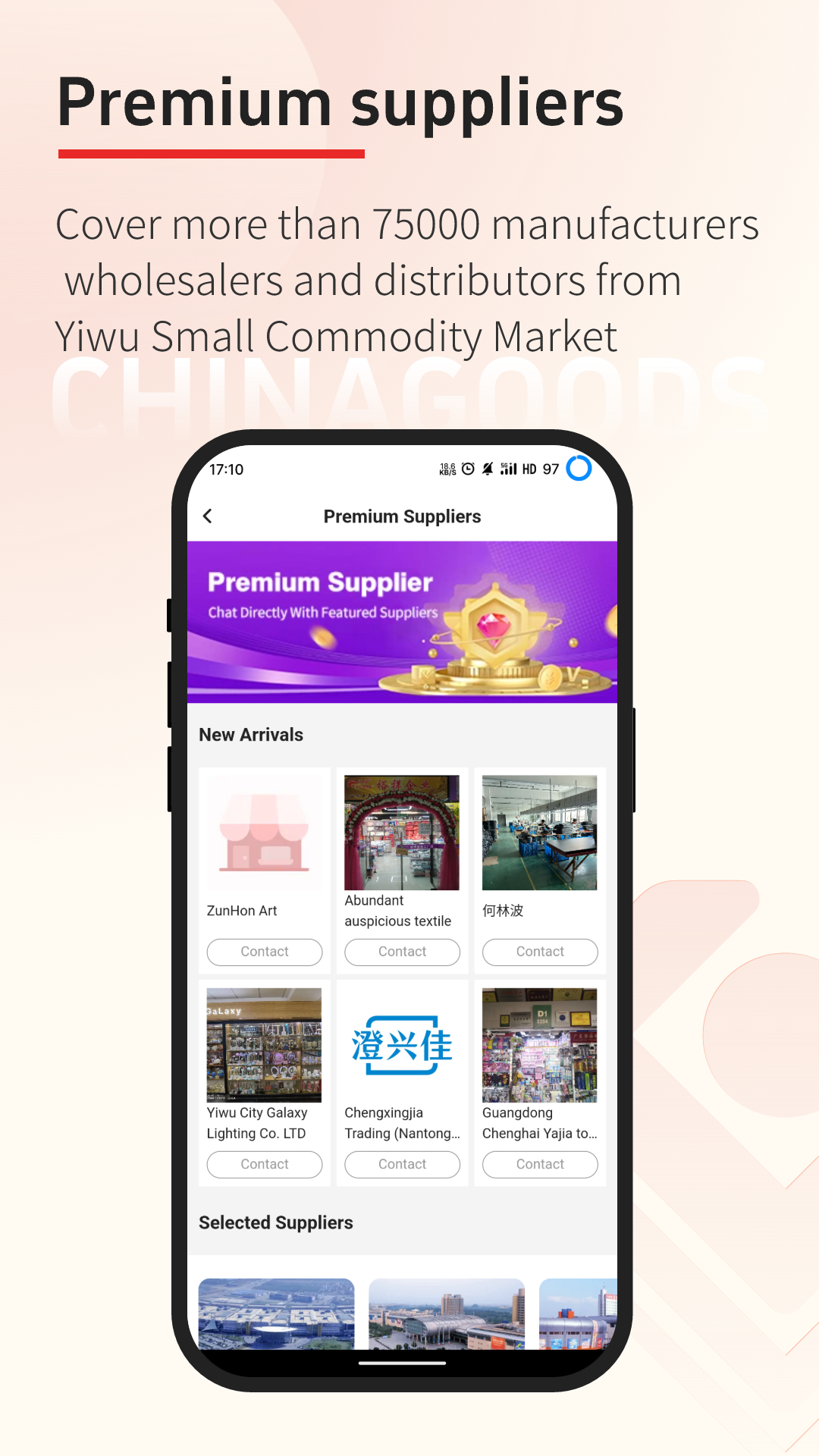 Chinagoods is an e-commerce platform for wholesale and retail shopping, pioneering direct sourcing from high-quality manufacturers. It is the only official designated app for the renowned Yiwu International Trade City (Yiwu Small Commodity City) globally. Procure goods directly from factories, seize first-hand low-cost sources, and enjoy cost-effective shopping for everyone. Open the Chinagoods app to embark on a new wholesale shopping experience.