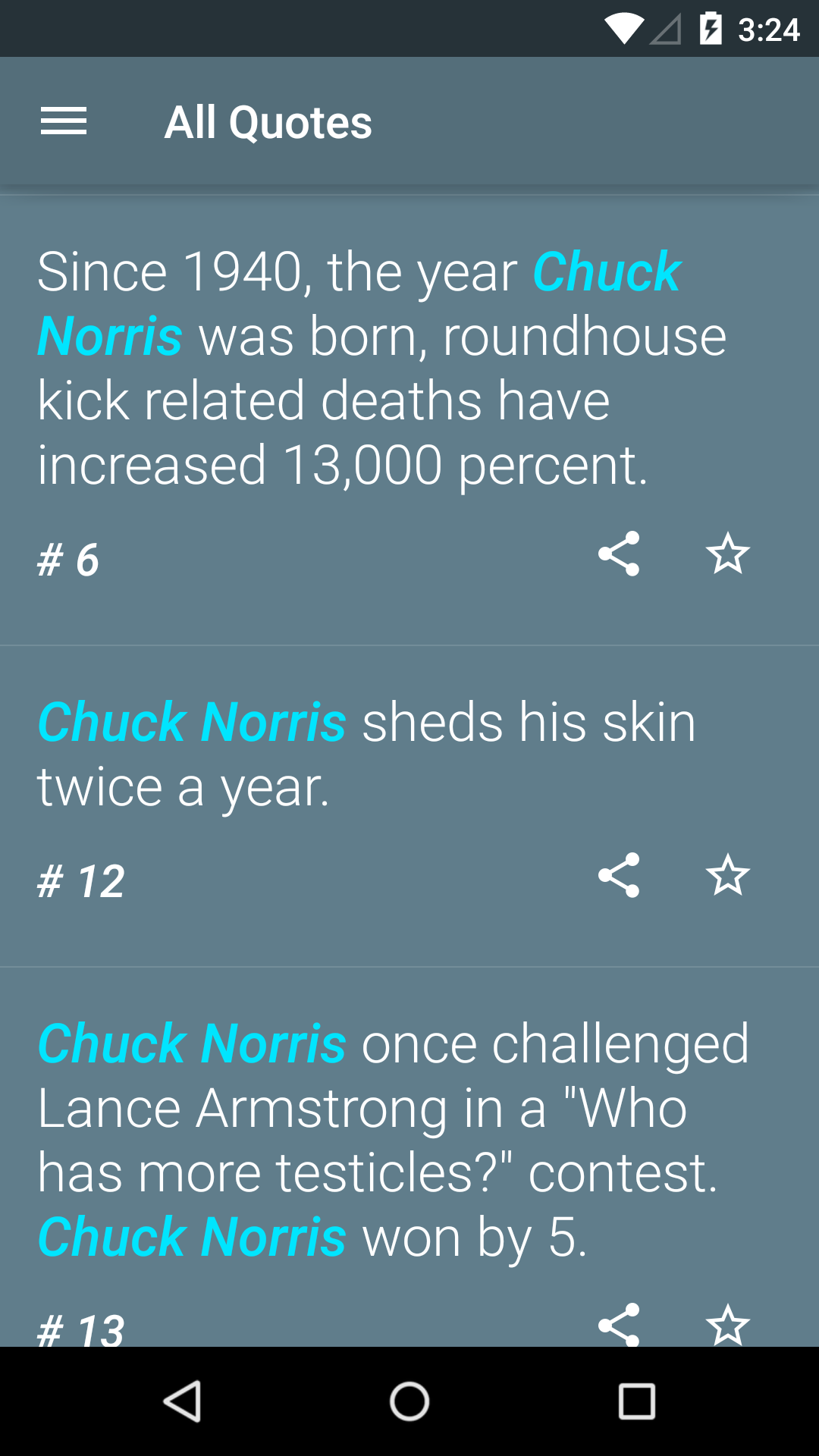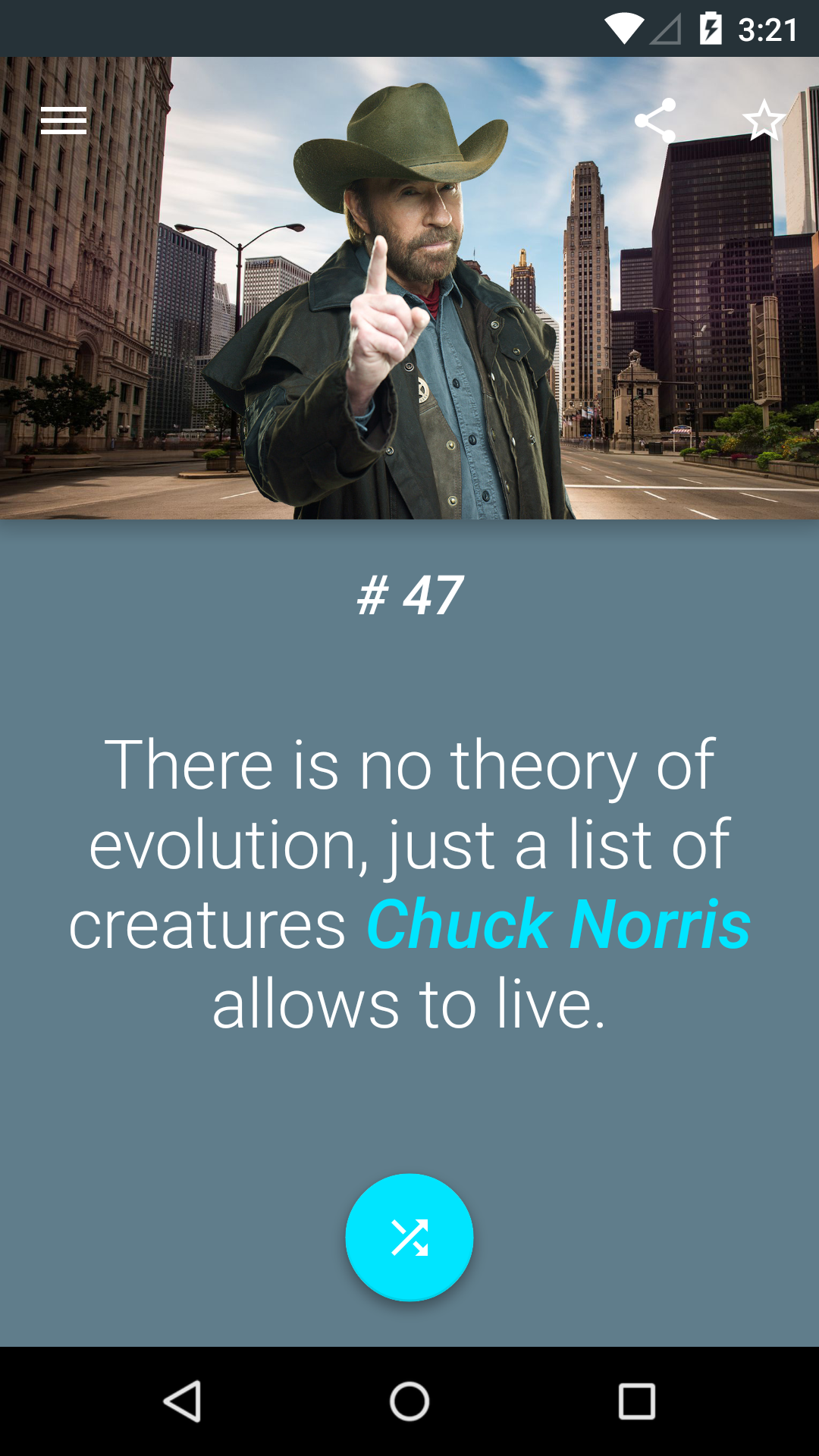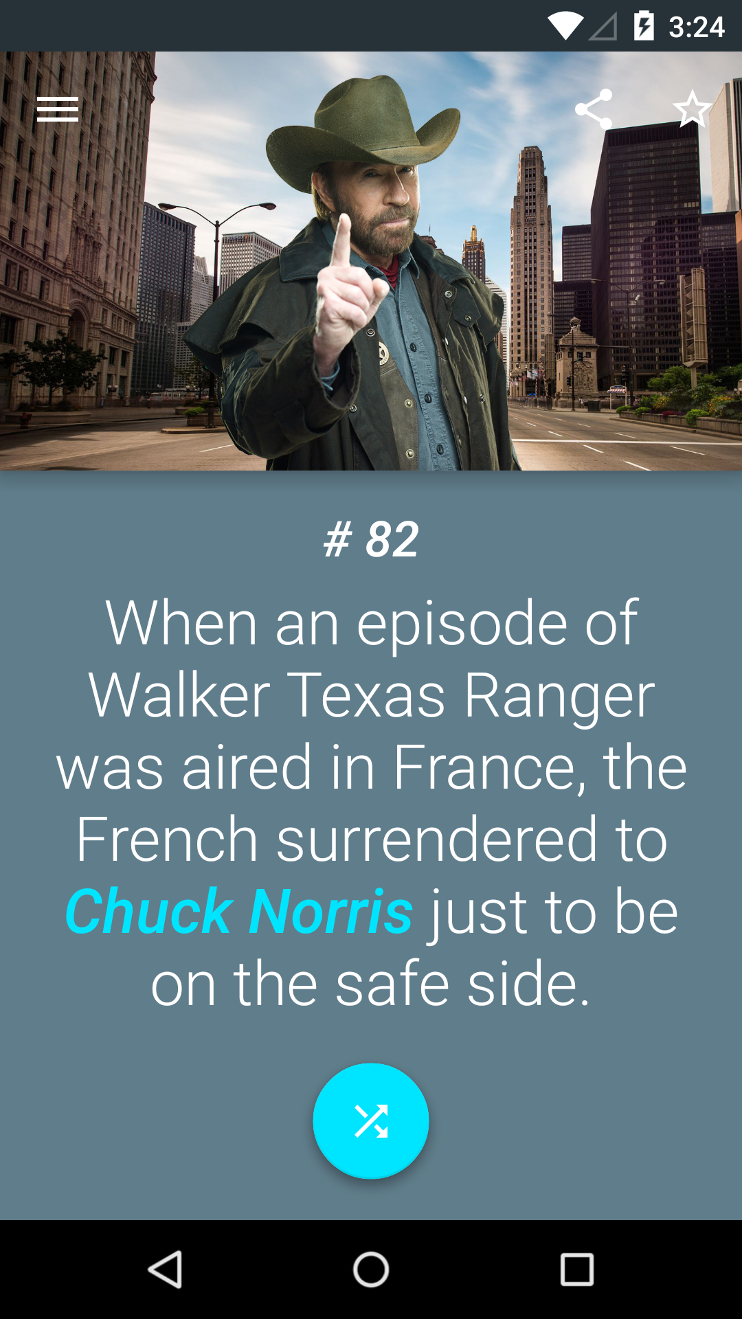 Read every awesome fact about the legendary Chuck Norris! I've made a gorgeous Material Design app just for you, and Chuck Norris of course! ______________________ At the moment, only facts in English are available. More languages will be supported soon.
