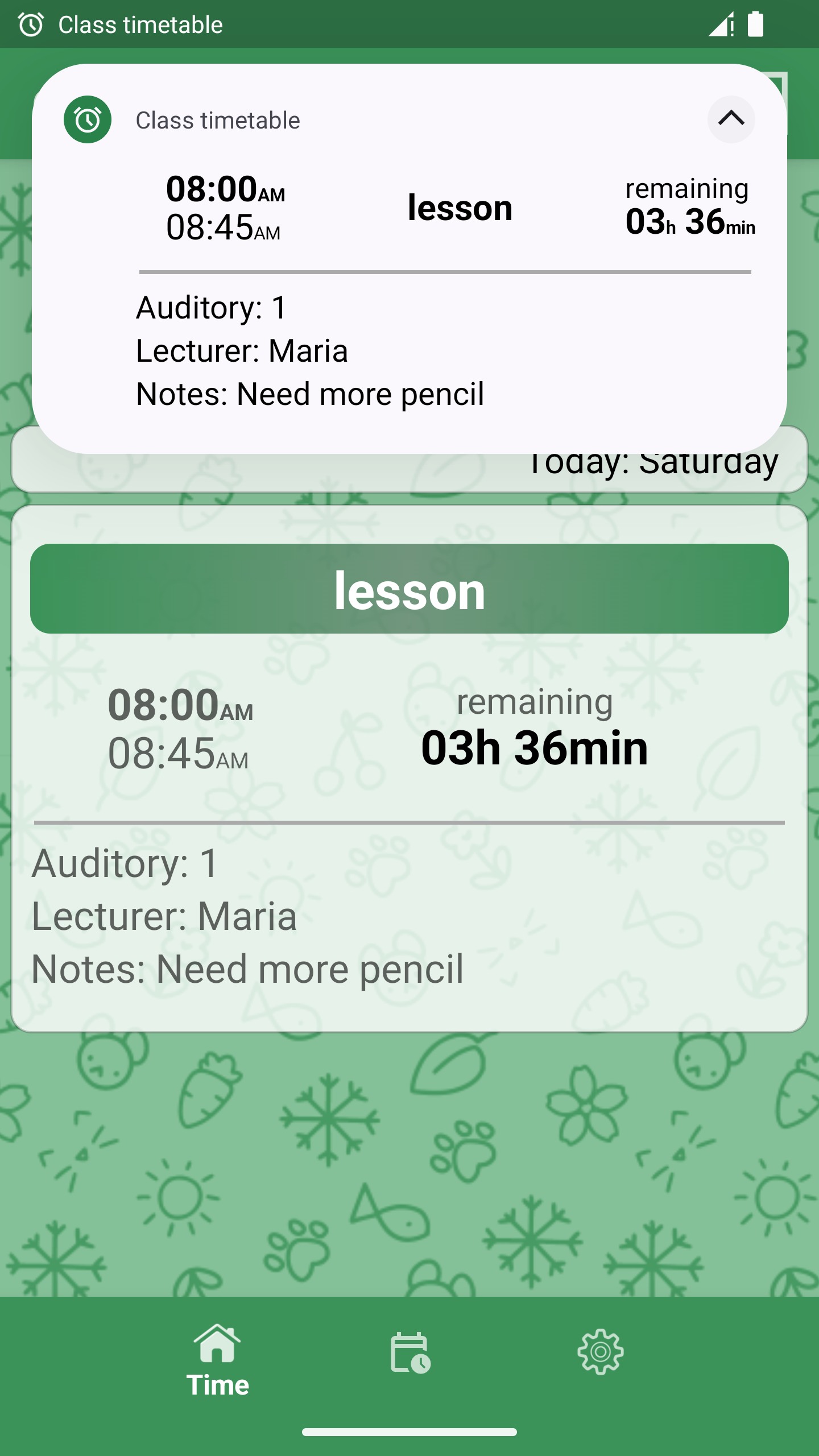 Class Timetable for schoolers and students. Easy to set up app that allows you to know when the lesson starts or when will it end in time. App features: 1) Tells you the time till the lesson's end 2) Gives you timetable templates 3) Adds new timetable widget 4) Features sharing timetable with your friends 5) Has week presets to customize your days 6) Shows notification five minutes before the end of the lesson 7) Helps you to skip unneeded classes to the needed ones, Yay! XD 8) Is the only one having feature of switching timezones without changing system time zone. Problem solving: Schedule files are not saved, schedule cannot be shared. Requires permissions to write files. Notifications do not appear on the lock screen, vibration and sound do not work. Configure notification permissions for the app. Settings - Apps - Call Schedules - Notifications. The time on the lock screen does not change. Time changes but the system does not delete old ones on time, for this you need to go to Settings - Battery - Launch applications - uncheck the "Call Schedule" box, a window will appear, press ok.