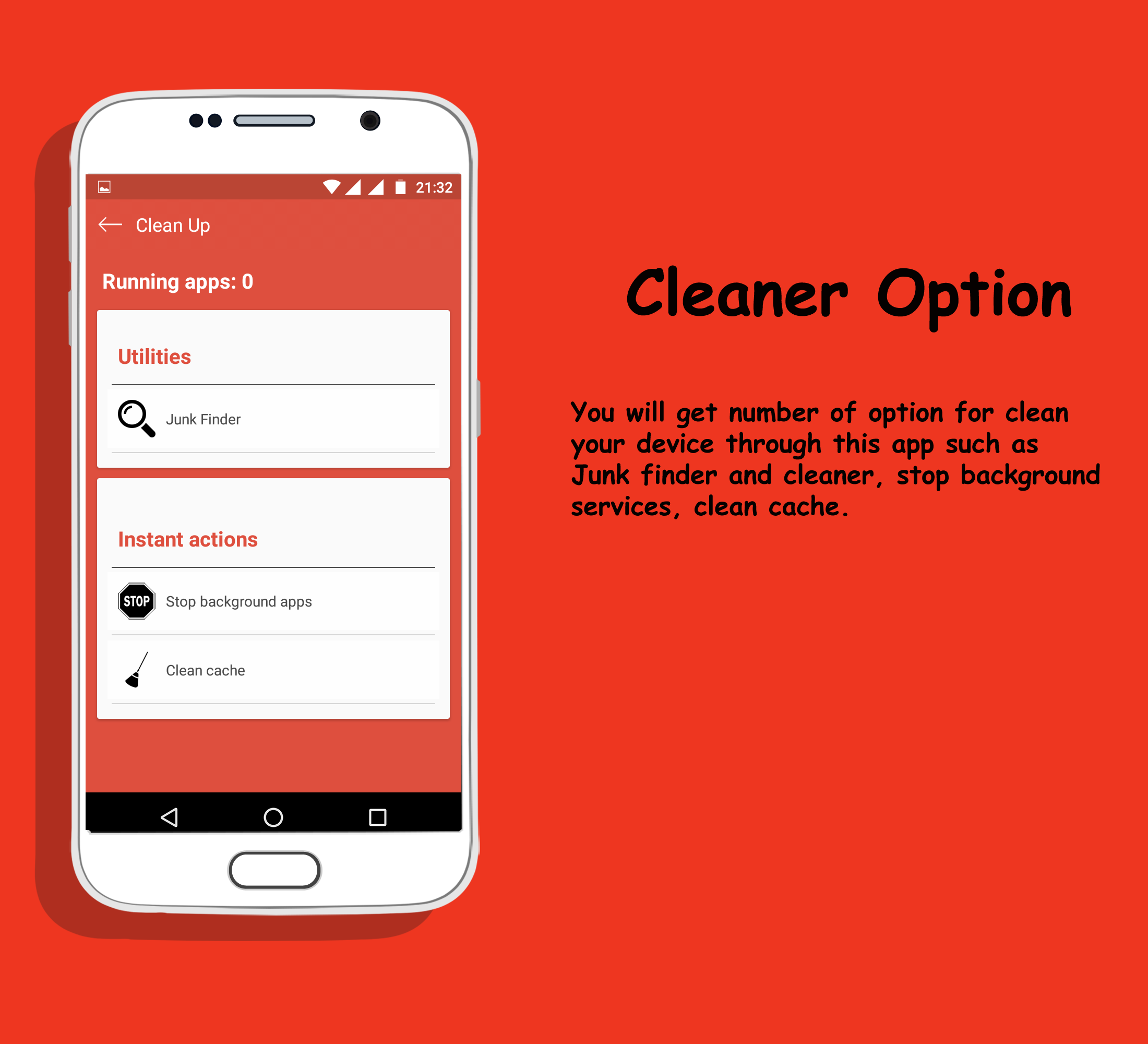 By help of this cleaner master you can free lots of phone storage, memory and boost RAM also with unwanted apk and cache files from your device.
