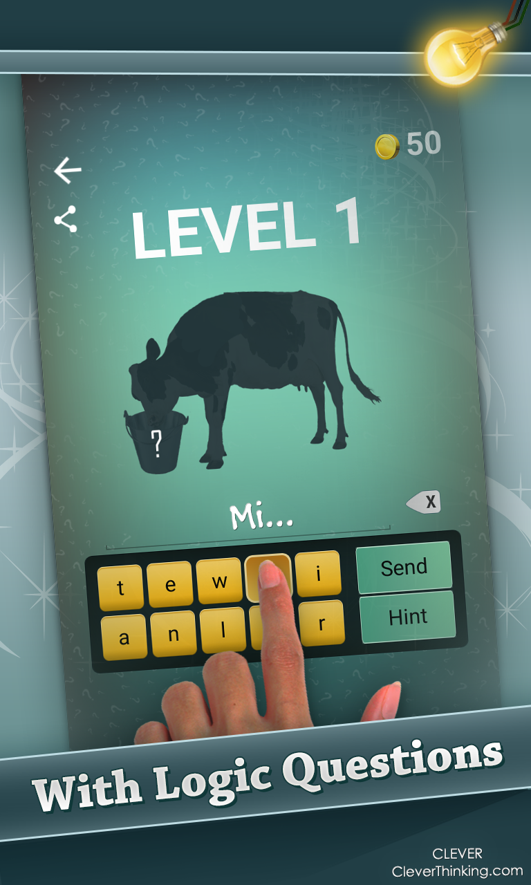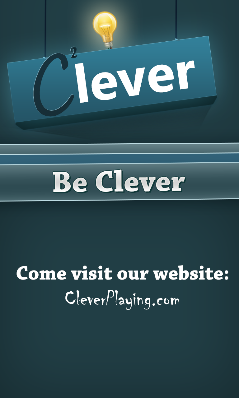 -- For a non ad version, search for 'Clever (Ad Free)' -- So what is Clever? Clever is a thinking-out-the-box game, involves with logic questions and riddles that will force you thinking wisely in order to pass stages. Pass levels, get scores, win the Leaderboard! Clever improves your thinking, developing your memory, giving you tools to think smartly, not the way people usually think. We've created 34 levels and designed each of them in a mystery way which requires you to decipher every picture. Each level requires a different kind of thinking, that increases over stages. We also added cool features so you won't feel totally lost - *You start the journey with 50 Clever Coins, which you can use to buy hints at any level. *You can also share any question with your friends any time *Every area you pass, you get an achievement