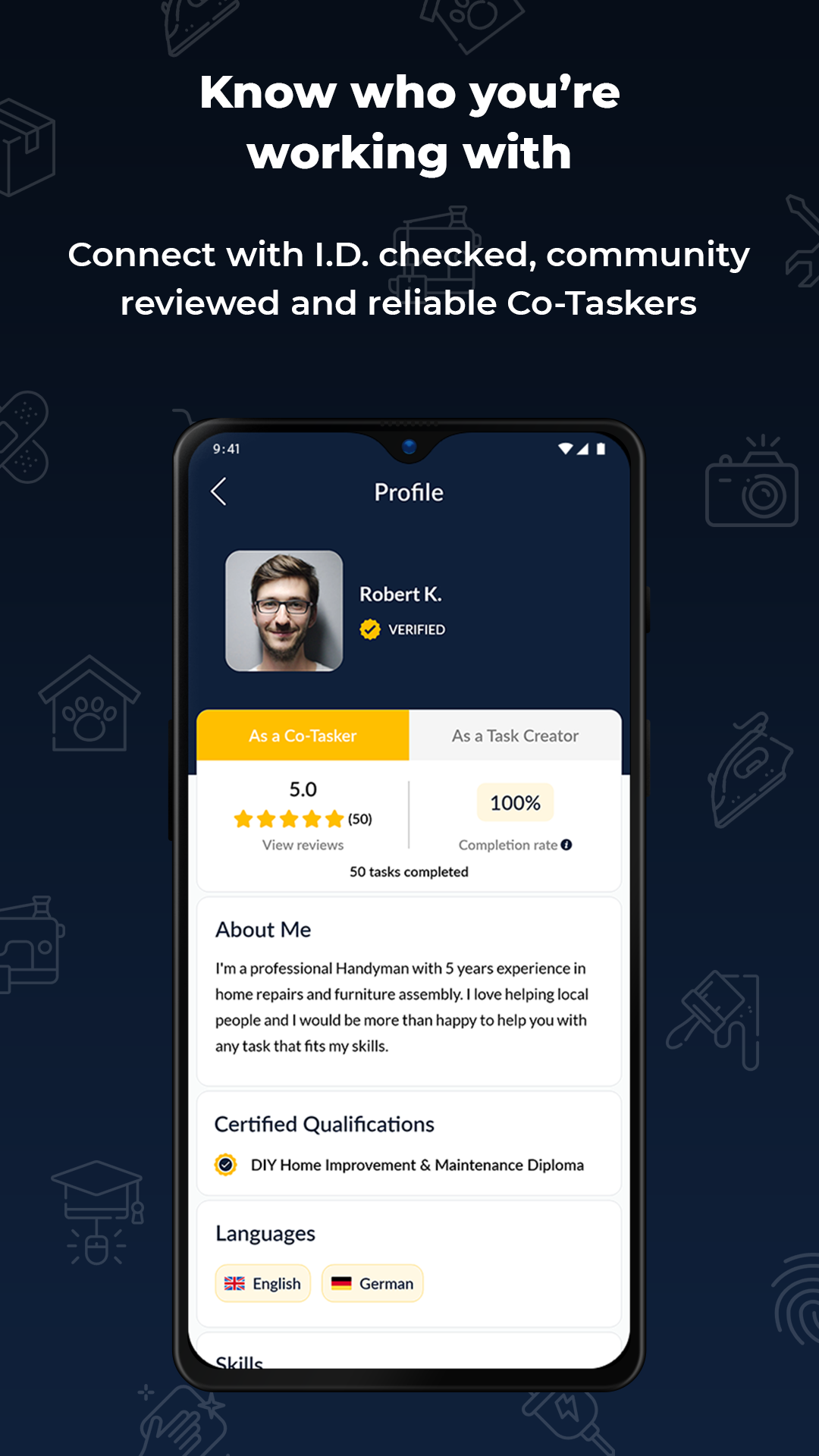 - All Co-Taskers are ID-verified before they can work on the platform and reviewed by the community members after every completed task. A Reliability Rating is also applied to help build our transparent community.