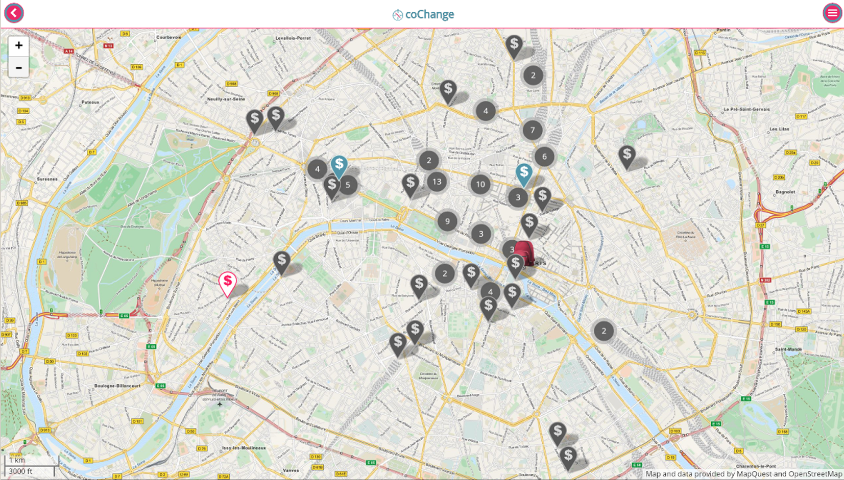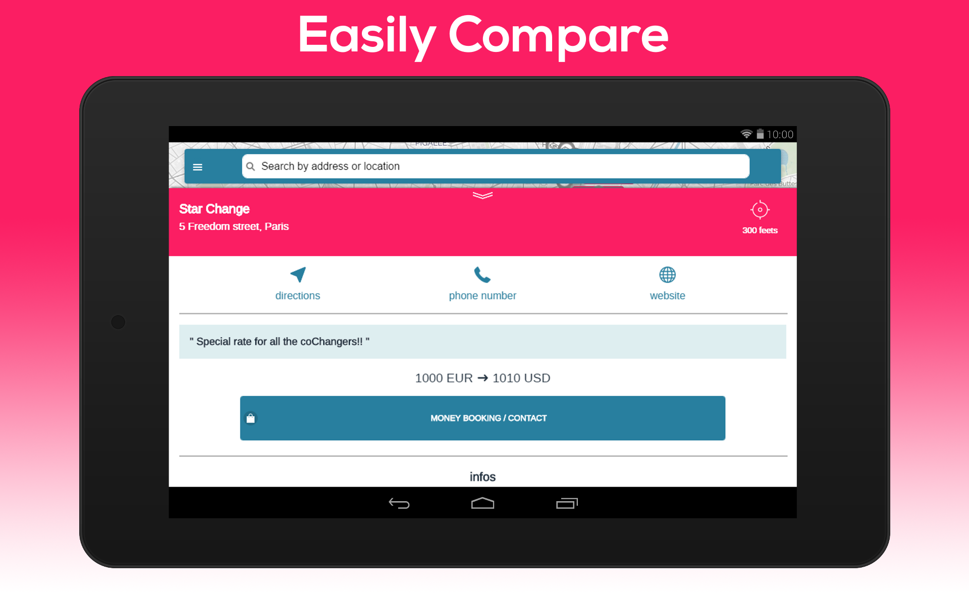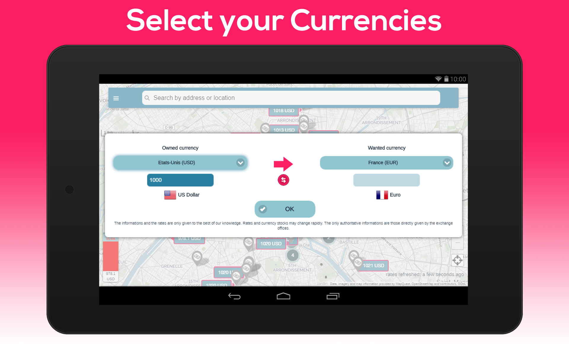Totally free (and without ads), the coChange application covers 100 countries. It allows you to quickly locate the nearest currency exchange offices among 10,000 money changers referenced, and to benefit from the exclusive offers of the partners offices (special rates, flash sales, etc.)