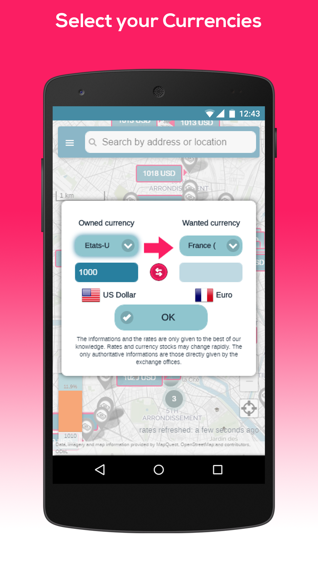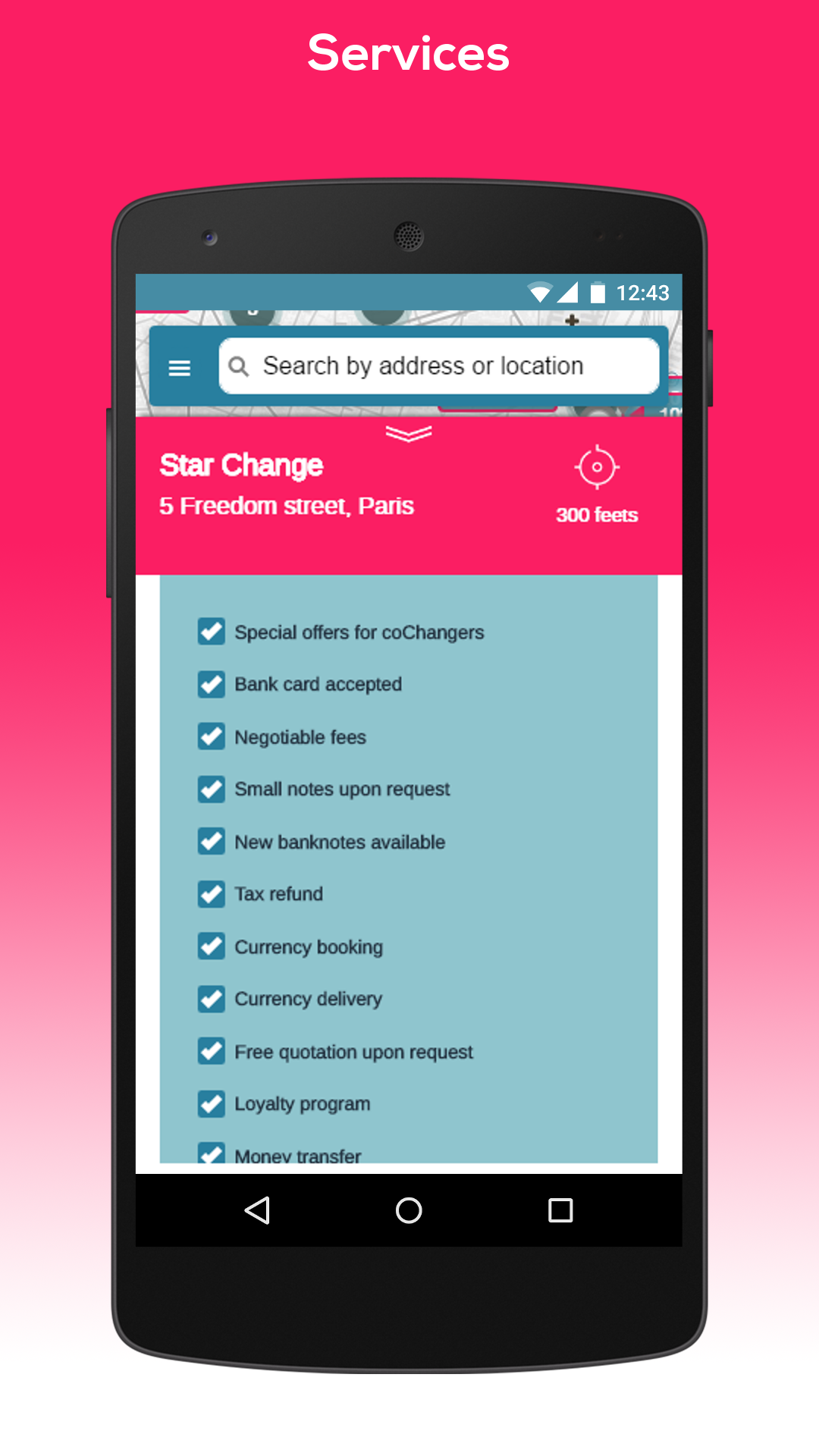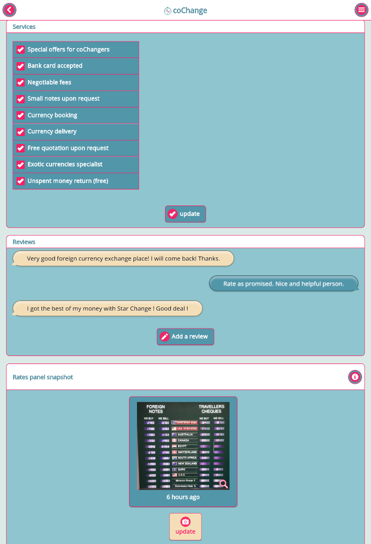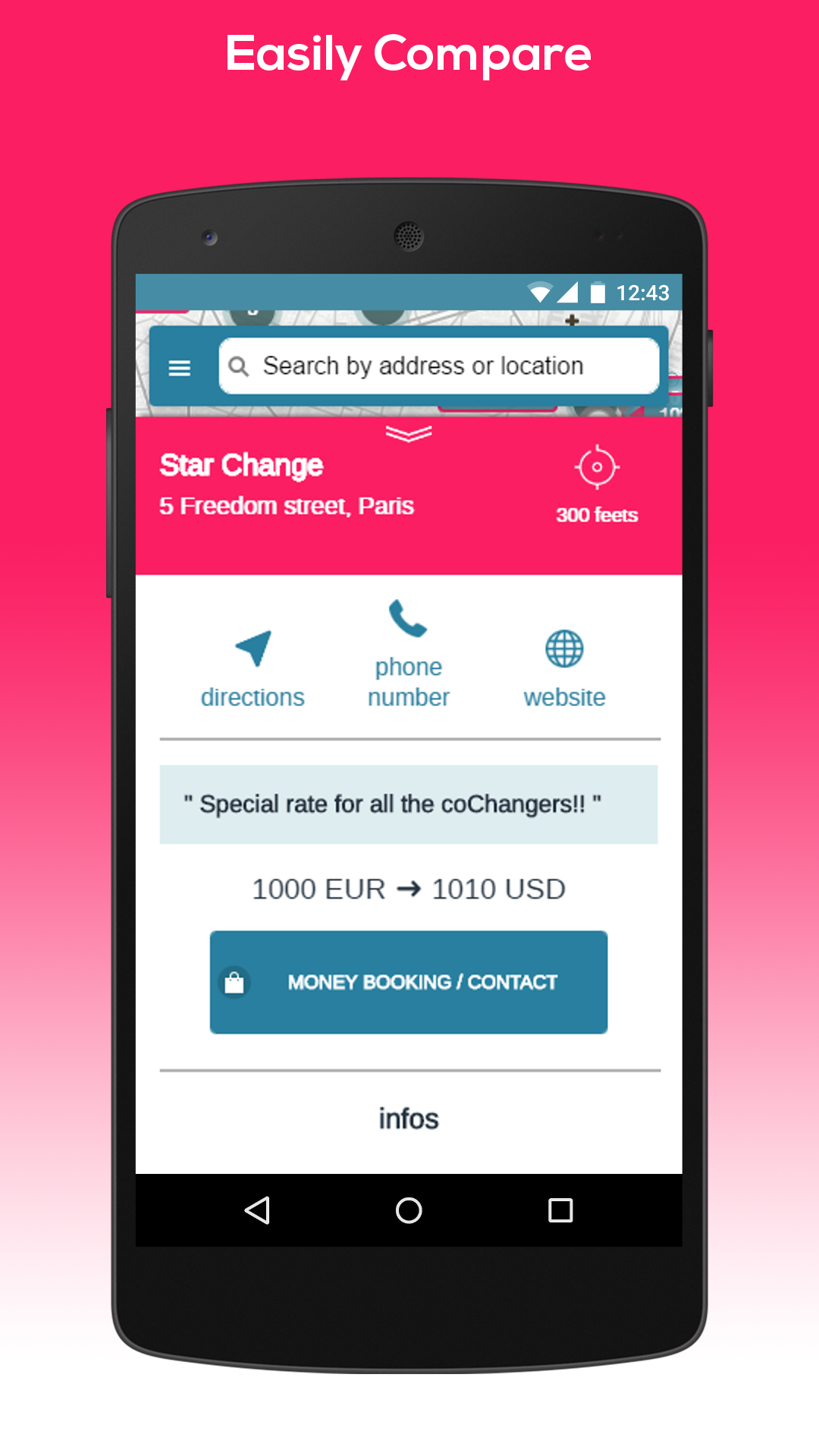 Totally free (and without ads), the coChange application covers 100 countries. It allows you to quickly locate the nearest currency exchange offices among 10,000 money changers referenced, and to benefit from the exclusive offers of the partners offices (special rates, flash sales, etc.)